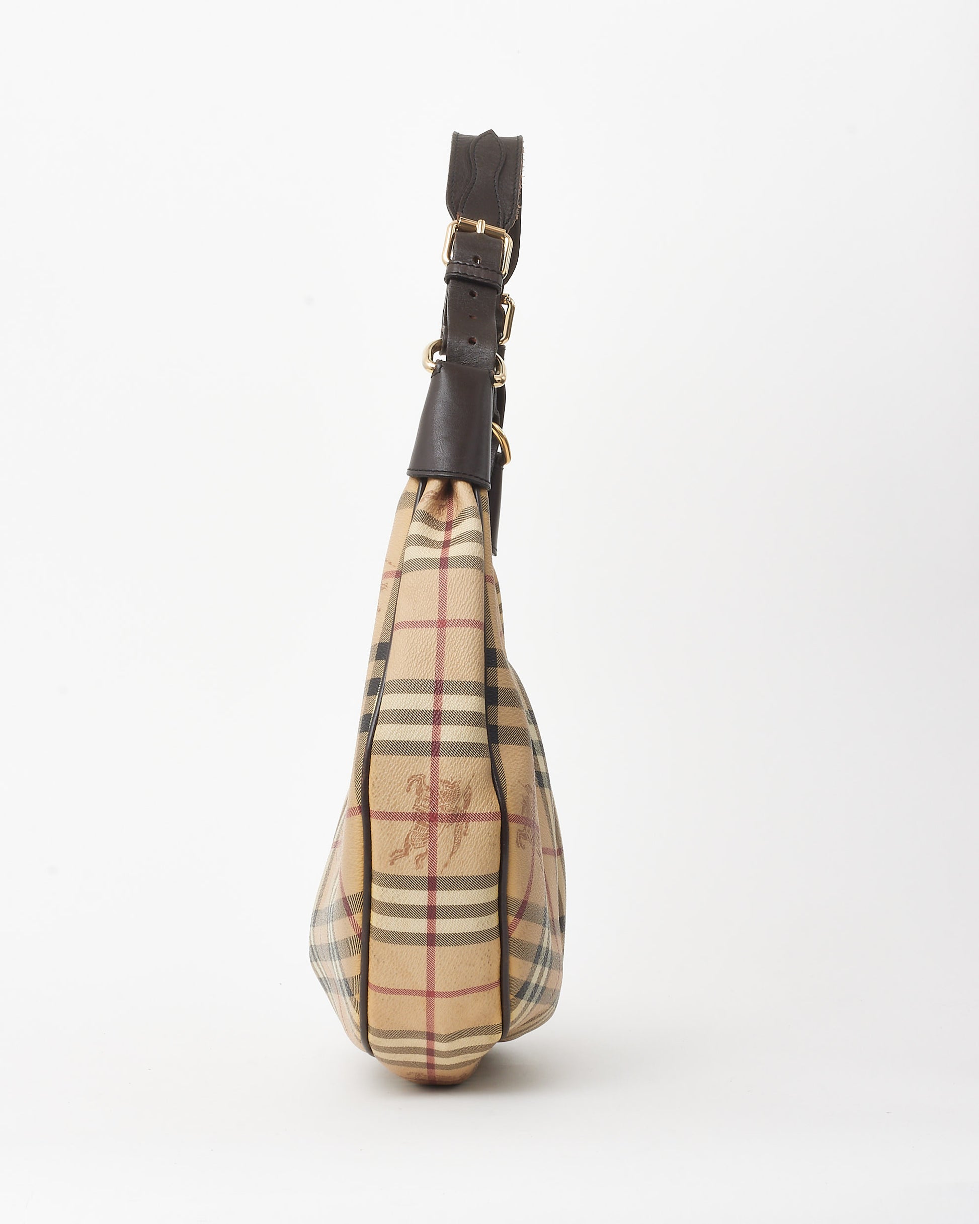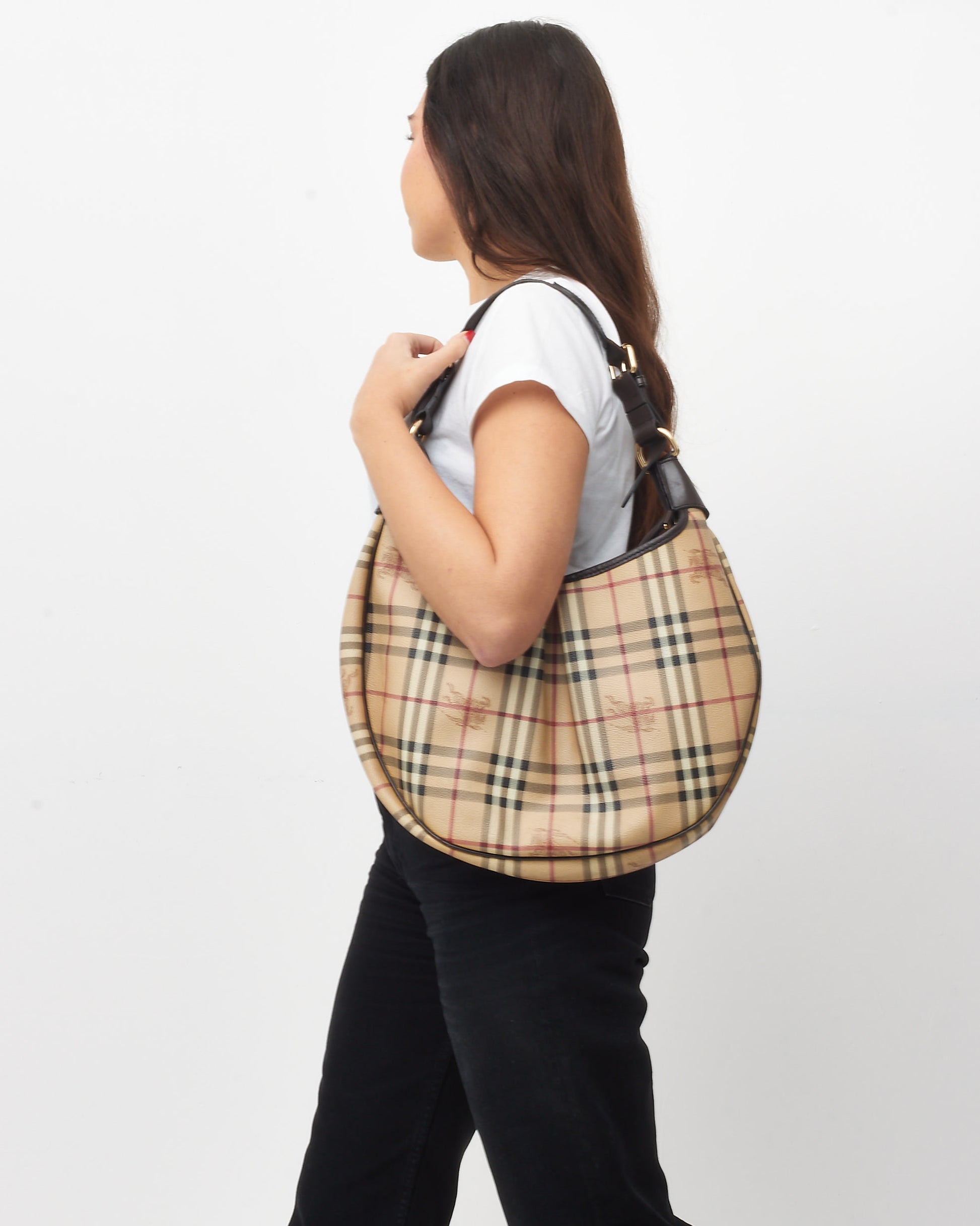 A timeless blend of heritage style and everyday elegance, the pre-owned authentic Burberry Brown Trim and Beige Haymarket Check Canvas Rydal Small Hobo Bag is the perfect balance of sophistication and practicality. Crafted from Burberry’s signature Haymarket Check coated canvas, this bag features rich brown leather trim, adding a refined contrast to its classic design.