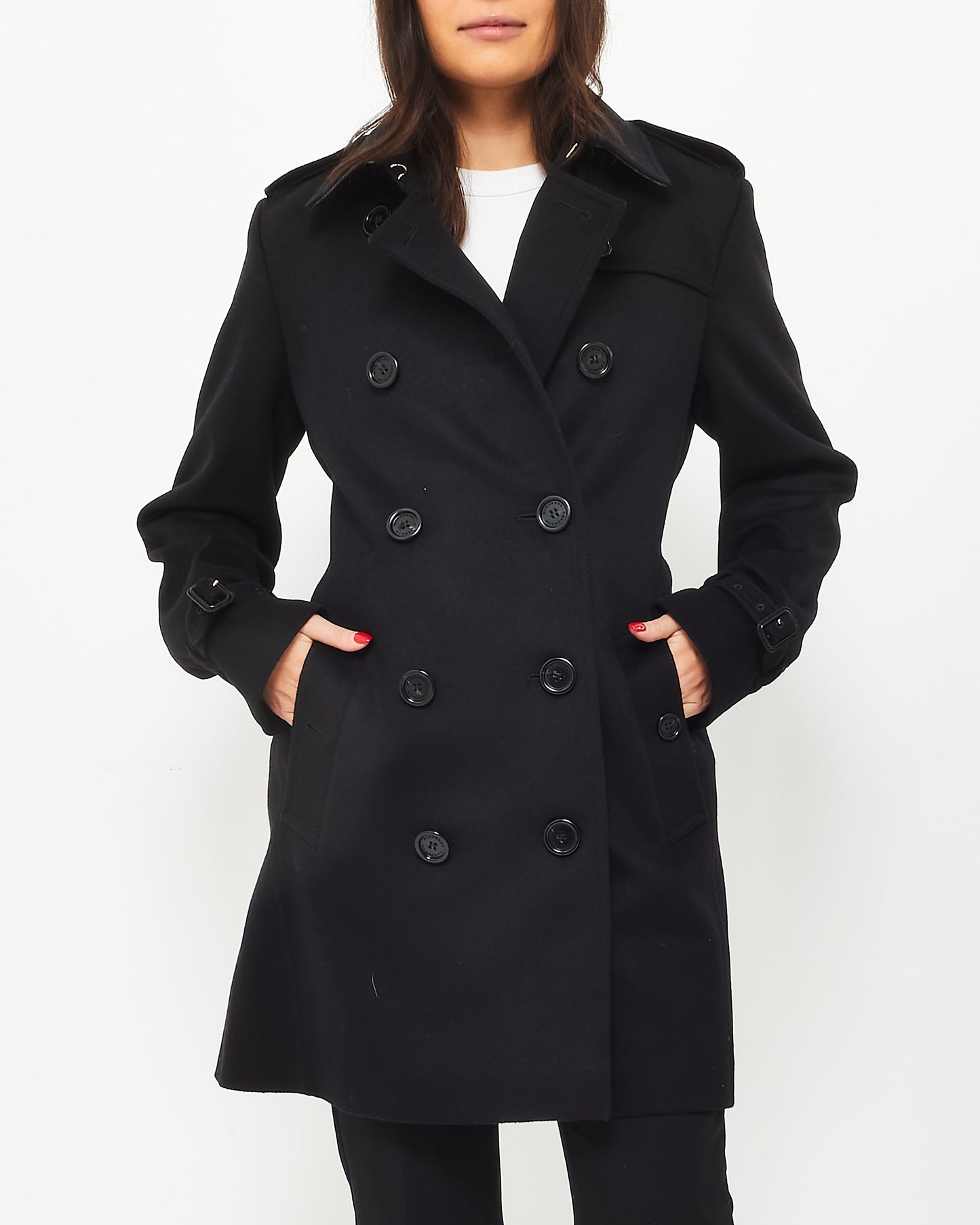 Stay effortlessly chic in this pre-owned authentic Burberry Black Wool & Cashmere Double-Breasted Belted Coat. Tailored for a timeless silhouette, this coat features a luxurious wool-cashmere blend, a classic double-breasted design, and a cinching belt for a flattering fit. Perfect for elevating your cold-weather wardrobe with sophistication and style.