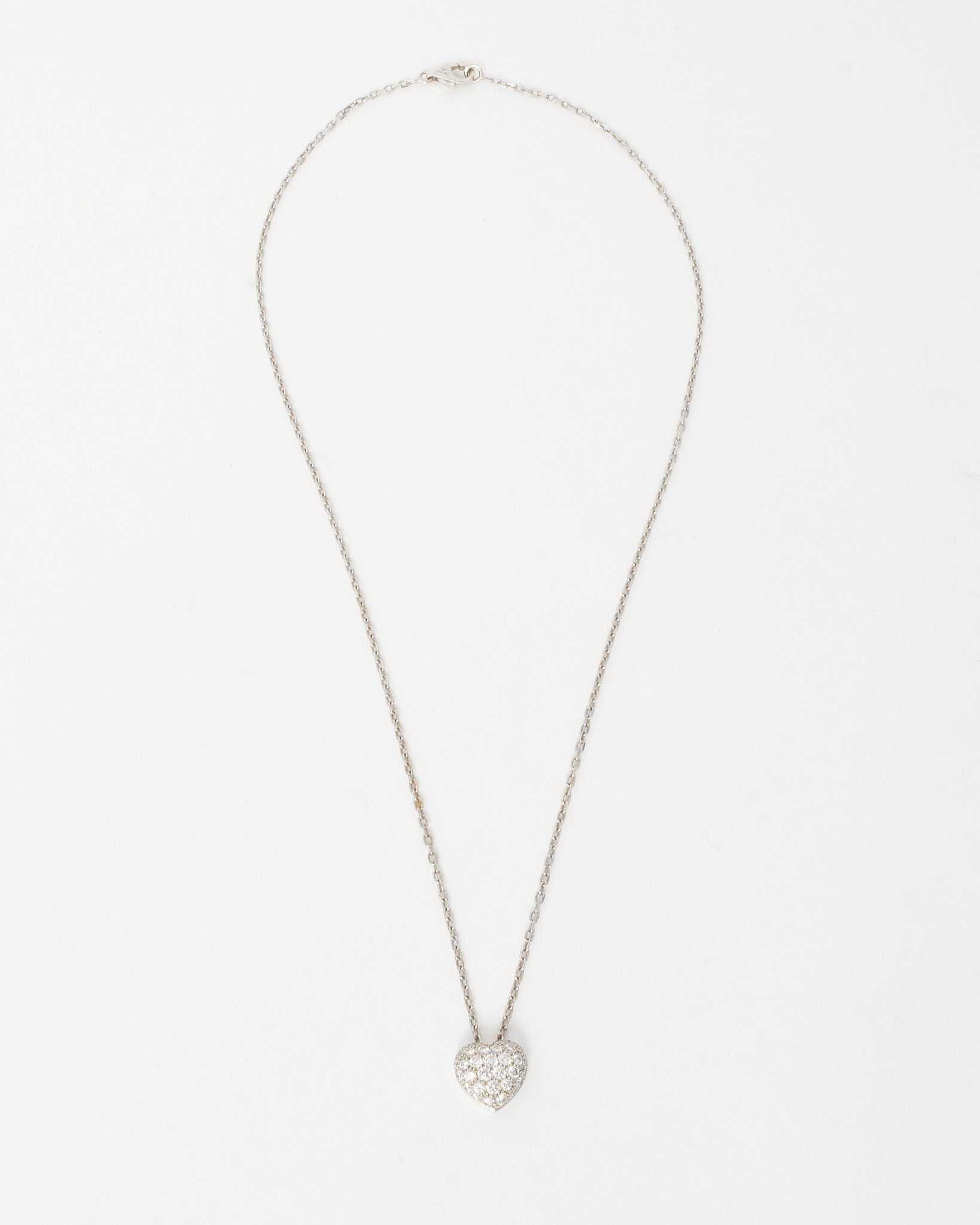 A timeless expression of love and luxury, this pre-loved authentic Cartier Small Heart Pendant Necklace is crafted from 18K white gold and adorned with dazzling pavé-set diamonds. The delicate heart silhouette captures classic elegance, while the brilliant stones add radiant sparkle. Perfect for layering or wearing solo, this refined piece makes an exquisite addition to any fine jewelry collection.