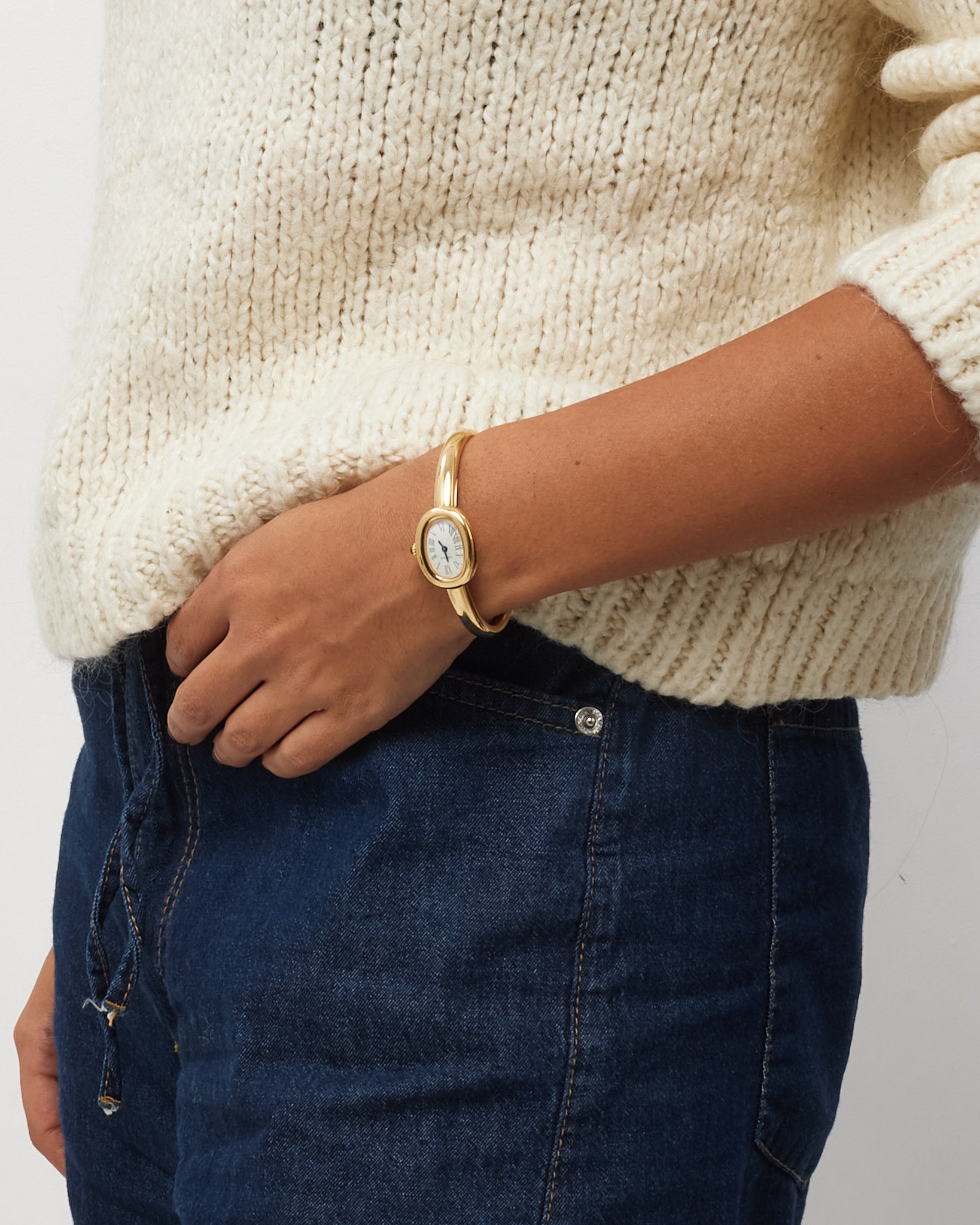 Classic and elegant, this pre-loved authentic Cartier Baignoire Watch in the mini model features an 18k gold oval case with a sleek bangle-style bracelet. The ivory dial is detailed with Roman numeral hour markers and blued steel hands, finished with a sapphire cabochon crown for a signature Cartier touch. Sized for a 16 cm wrist, this timepiece blends timeless design with refined craftsmanship—perfect for adding a touch of vintage luxury to any look.