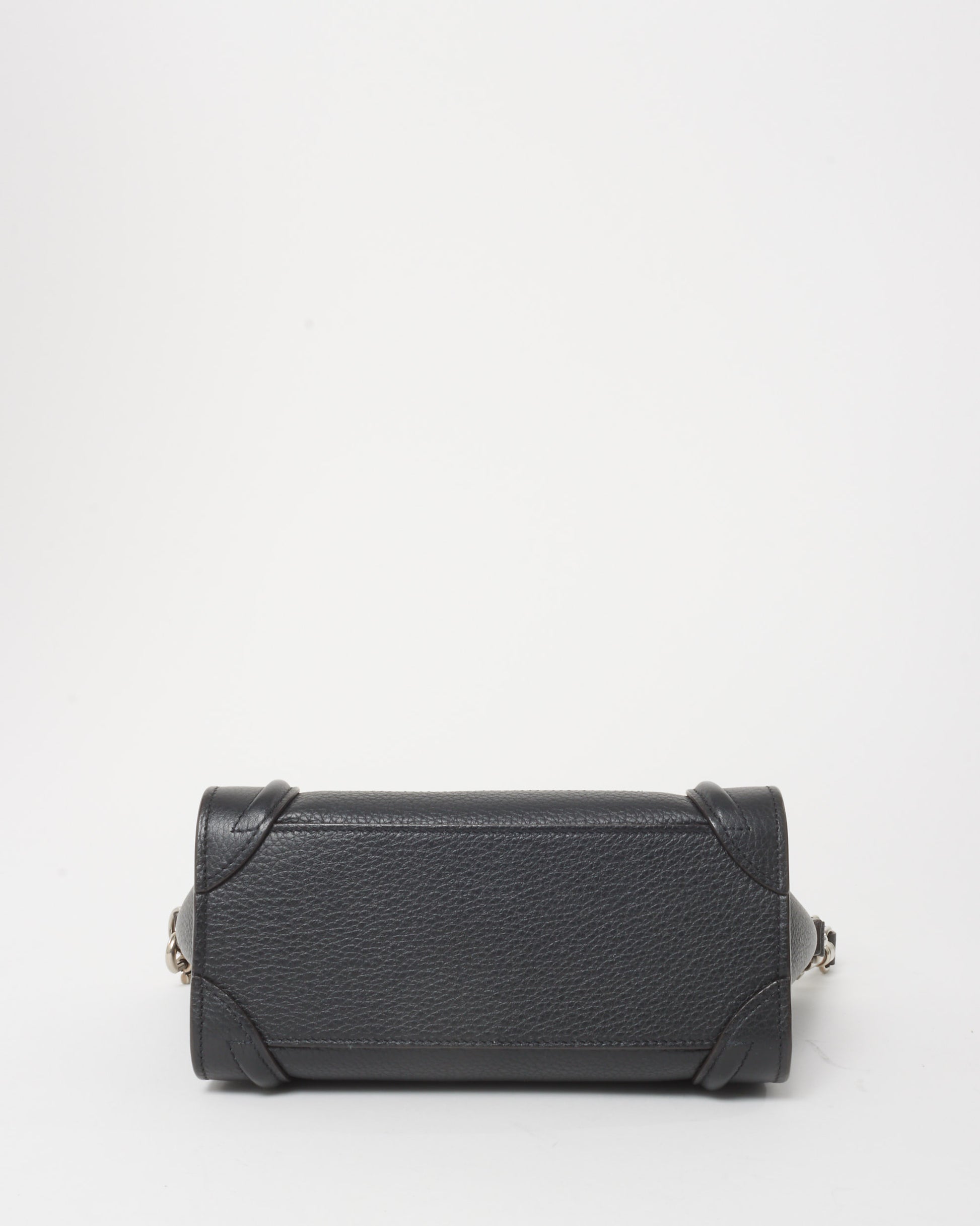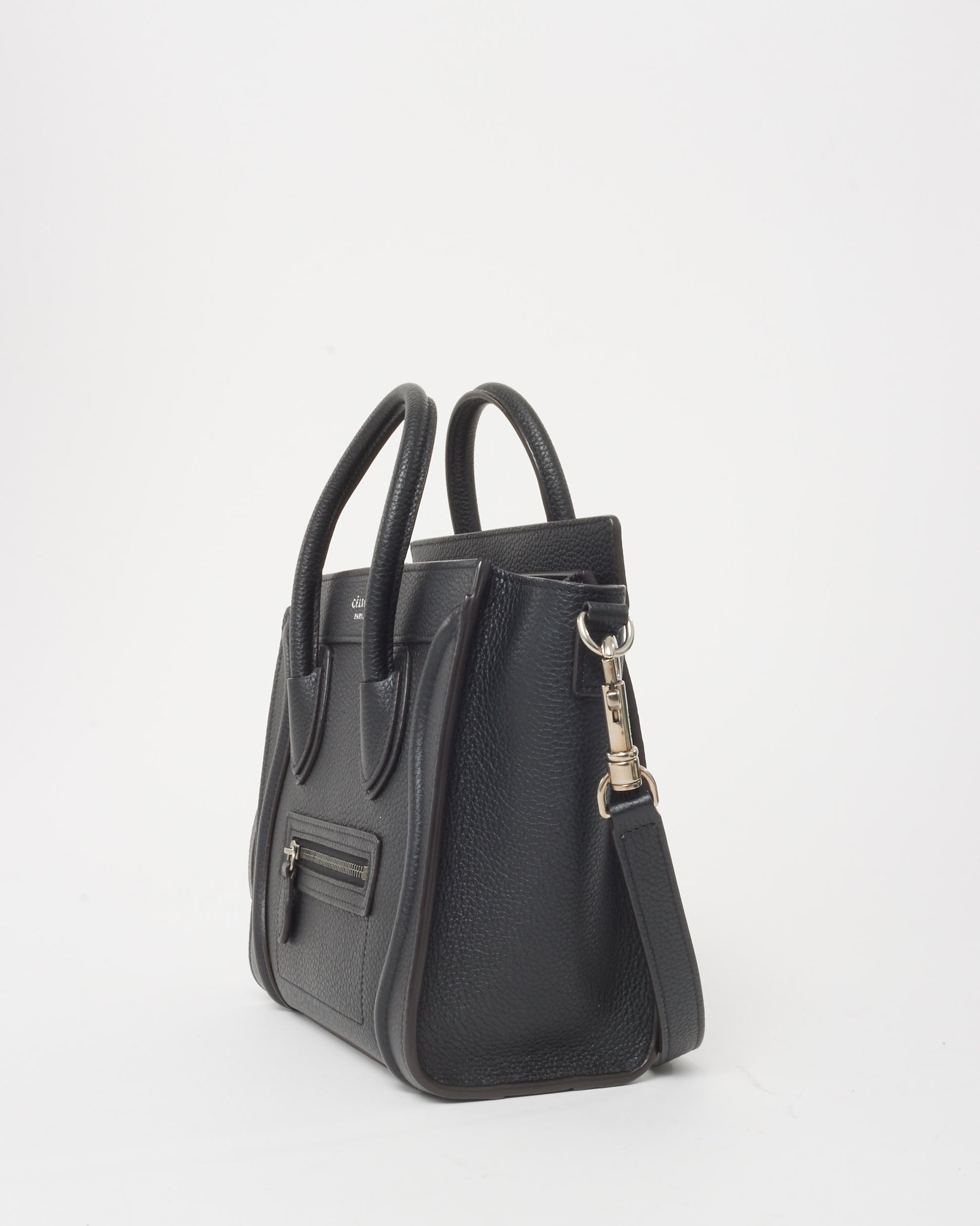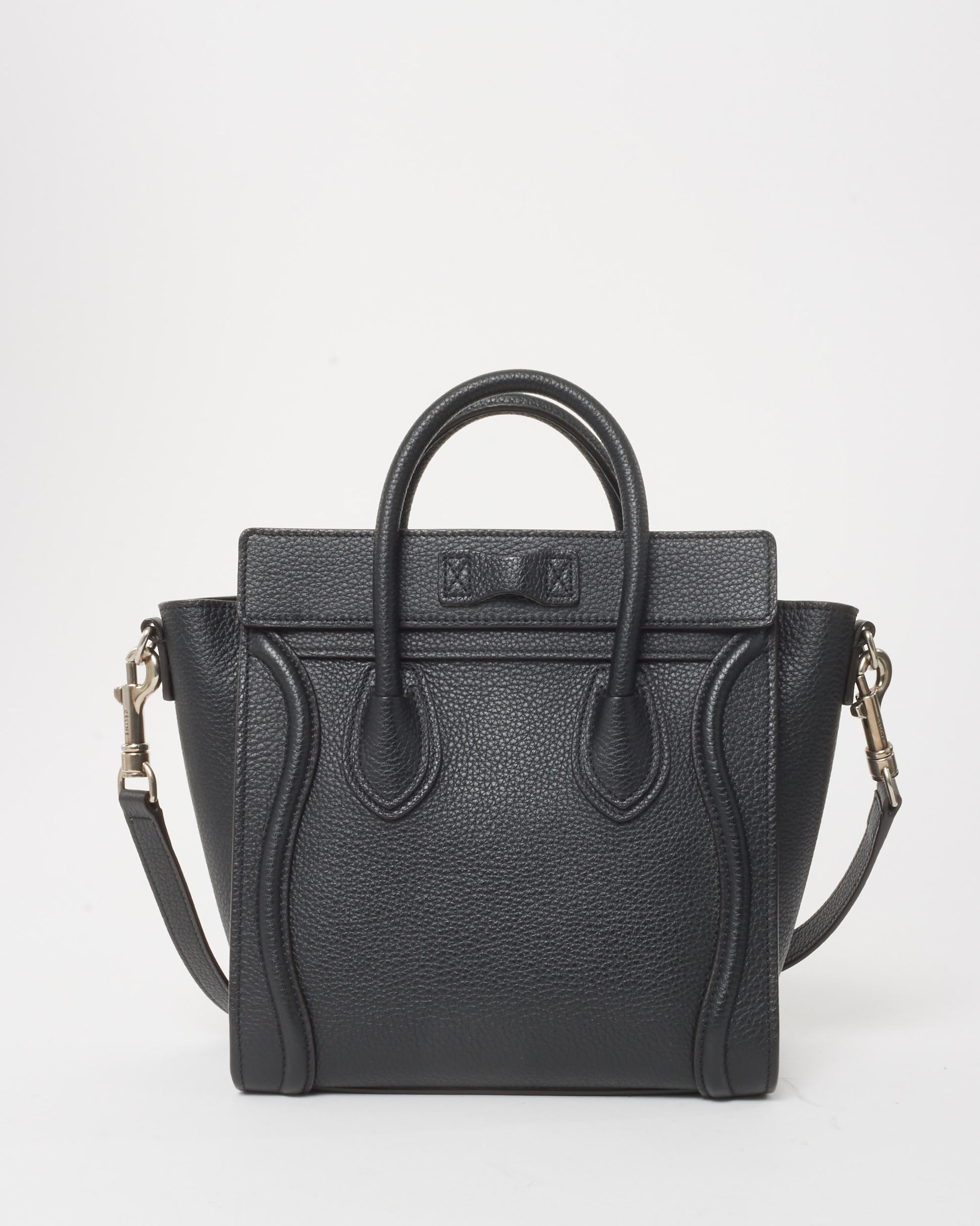 A cult-favorite in the world of luxury handbags, the pre-owned authentic Celine Black Drummed Leather Nano Luggage Bag is the epitome of effortless sophistication. Crafted from durable black drummed leather, this structured yet supple bag features the iconic curved front paneling and zippered pocket, creating a timeless and instantly recognizable silhouette.