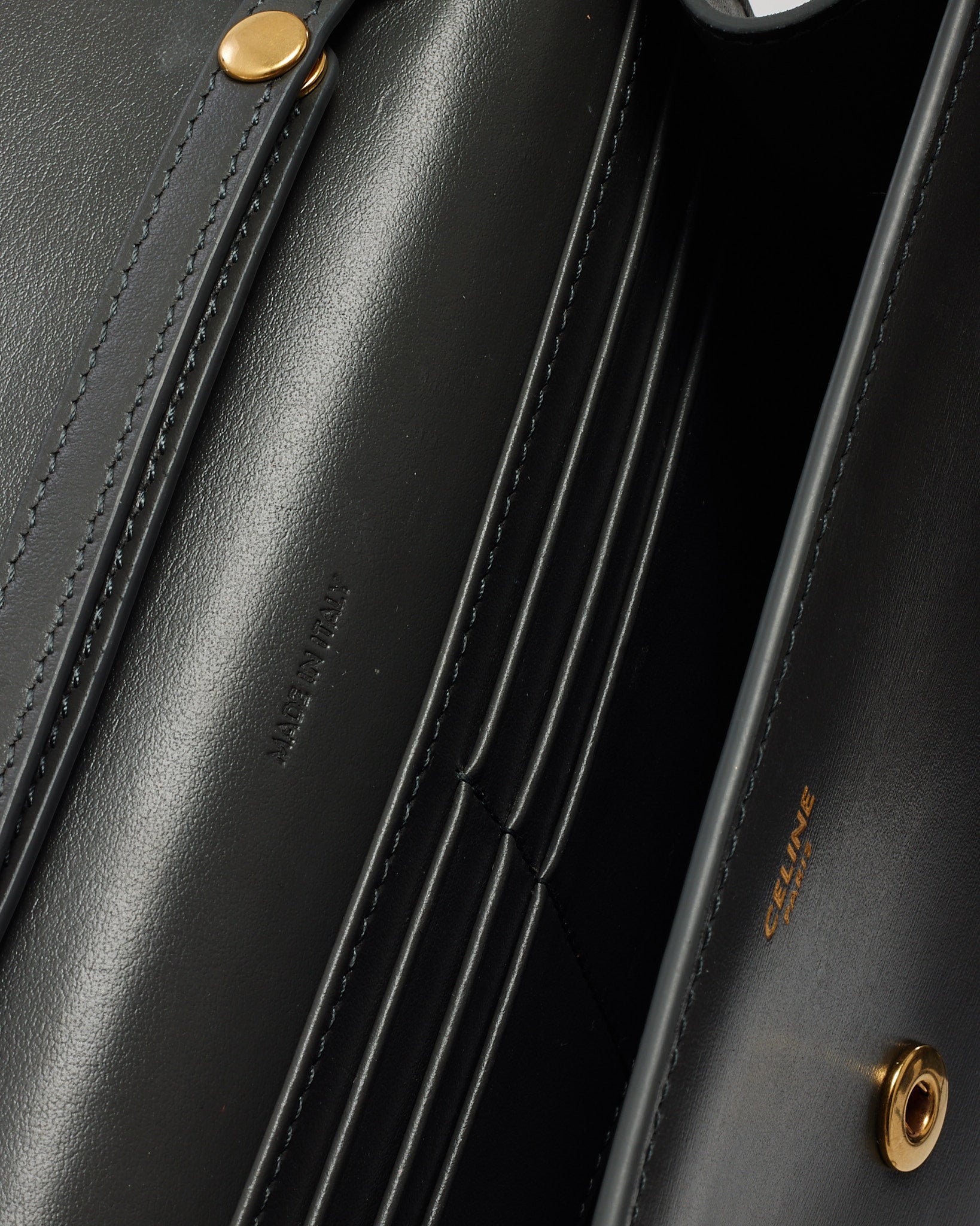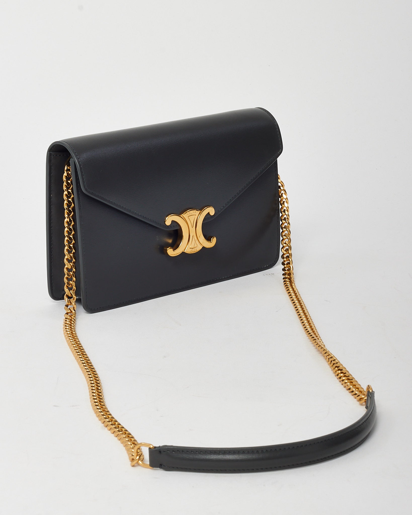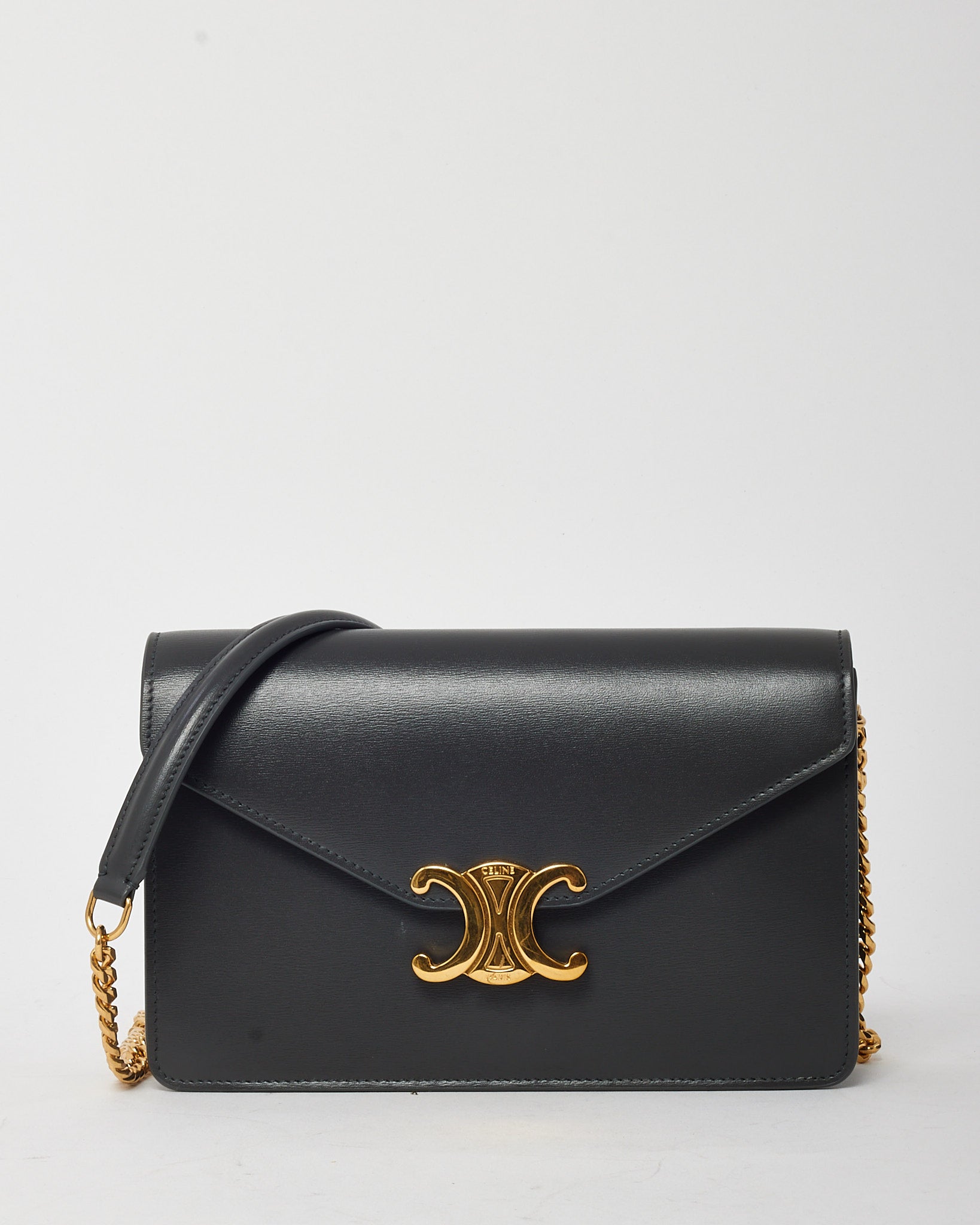 Sleek and understated, this pre-loved authentic Celine Grey Shiny Calfskin Leather Margo WOC Wallet on Chain Crossbody Bag embodies minimalist luxury. Crafted from smooth, high-shine grey calfskin leather, this versatile piece features a clean flap-front design with a discreet magnetic closure and subtle Celine logo embossing. The interior offers thoughtful organization with card slots, compartments, and a zip pocket, while the detachable chain strap allows for hands-free crossbody or elegant clutch carry. Effortlessly chic, it’s perfect for day-to-night transitions with timeless Celine refinement.