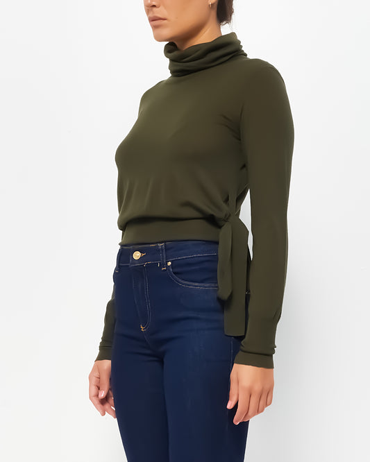 Army Green Wool Turtleneck Belt Tie Sweater - 40