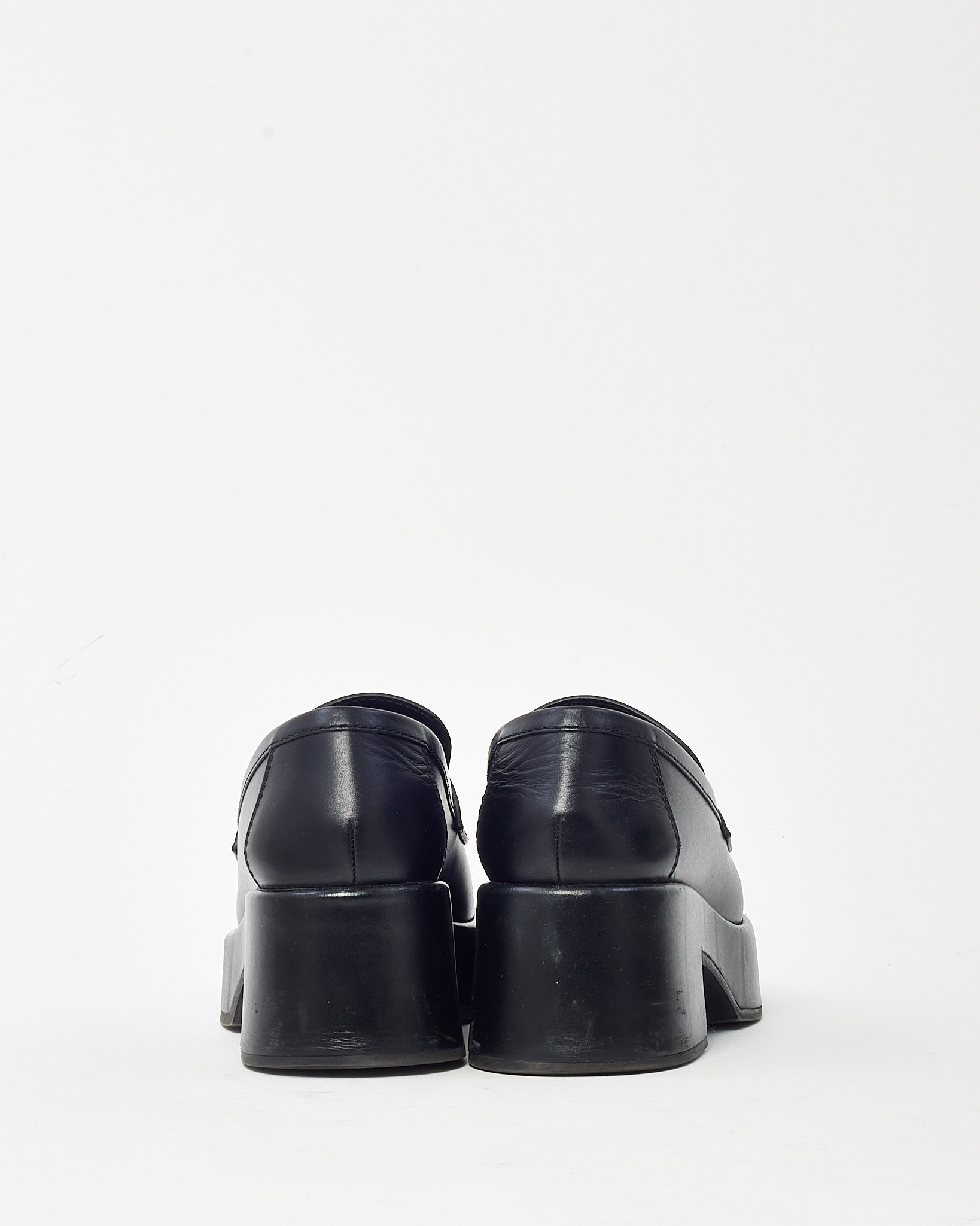 Step into elevated style with these pre-loved authentic Chanel Platform Loafers in supple black calfskin leather. Featuring a chunky silhouette and classic round toe, these loafers are finished with the iconic black-on-black CC Coco Mark at the vamp. A subtle platform sole adds height and edge, making them the perfect blend of comfort and statement-making design.