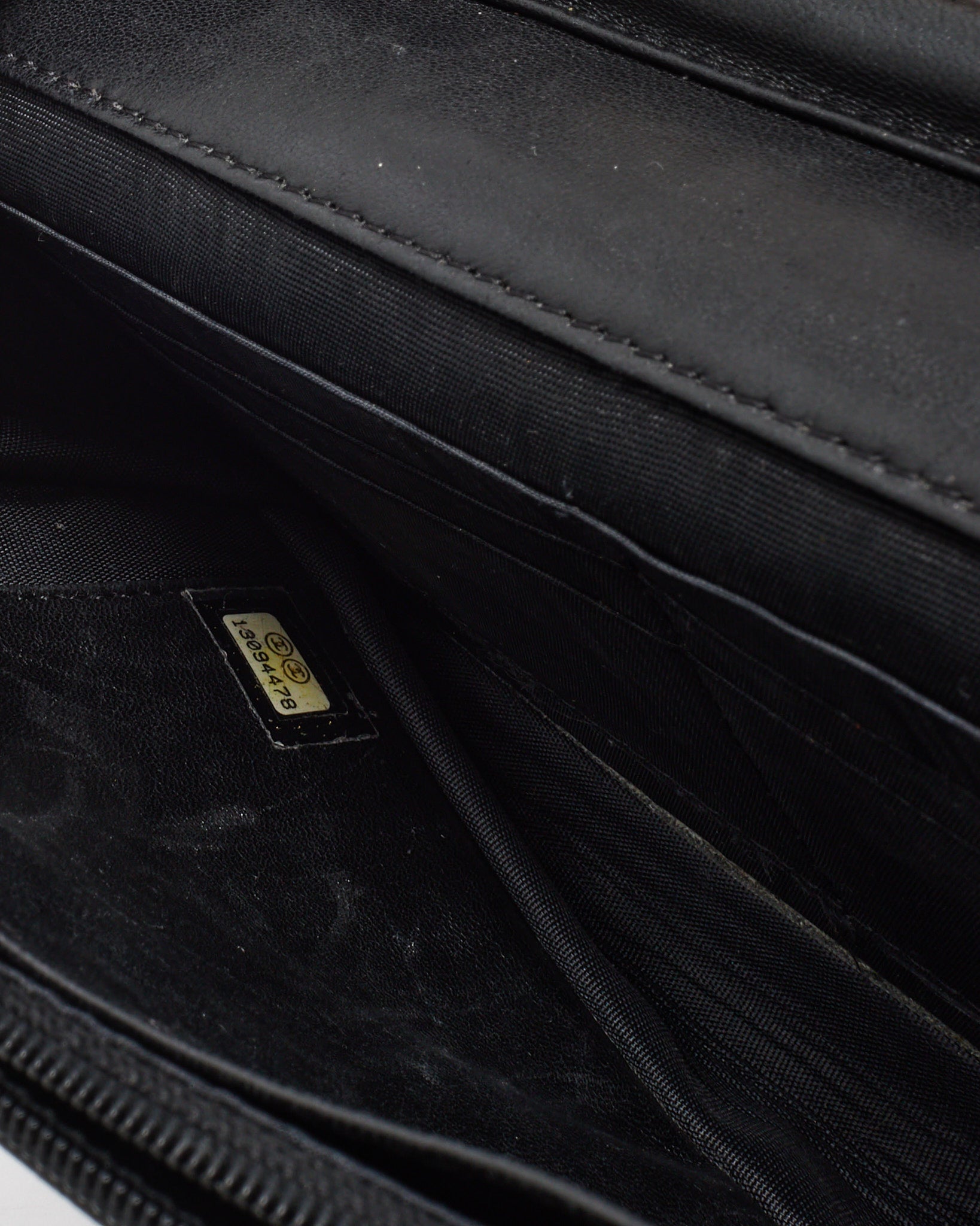 Timeless and refined, this pre-owned authentic Chanel Wallet on Chain is crafted from black caviar leather in signature diamond quilting, accented by a tonal stitched CC logo and silver-tone hardware. The front flap opens to reveal a well-organized interior with card slots, a zip compartment, and space for essentials.