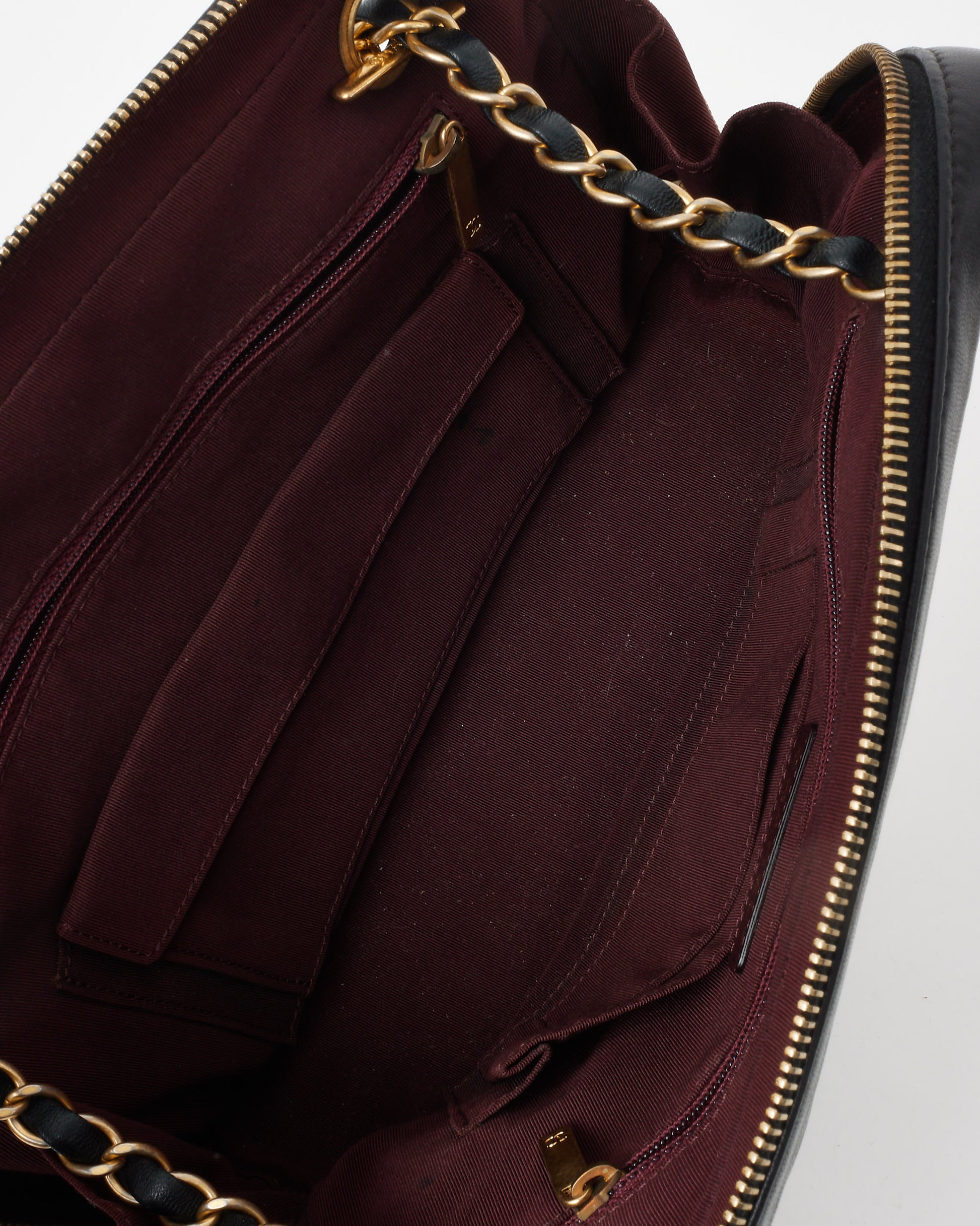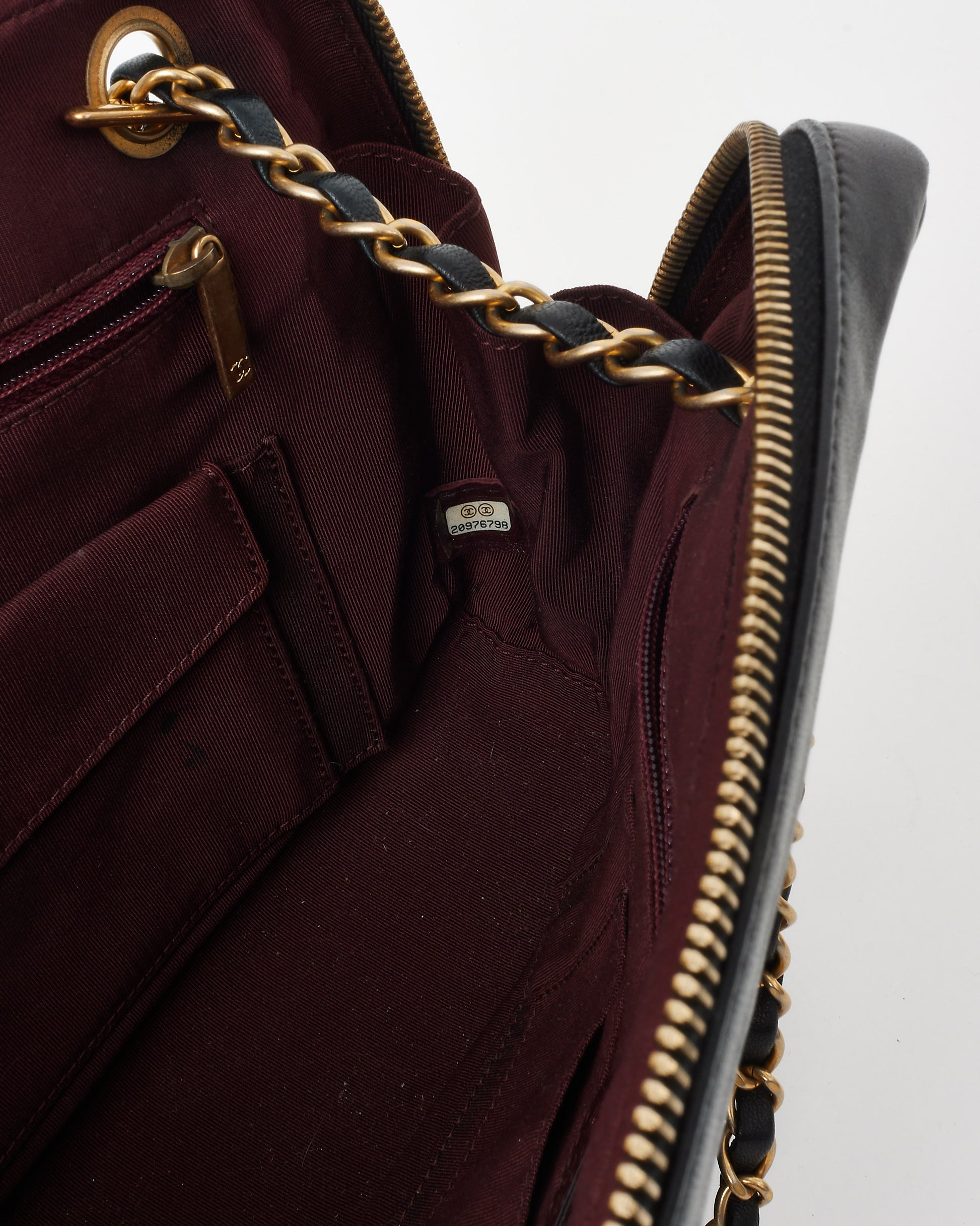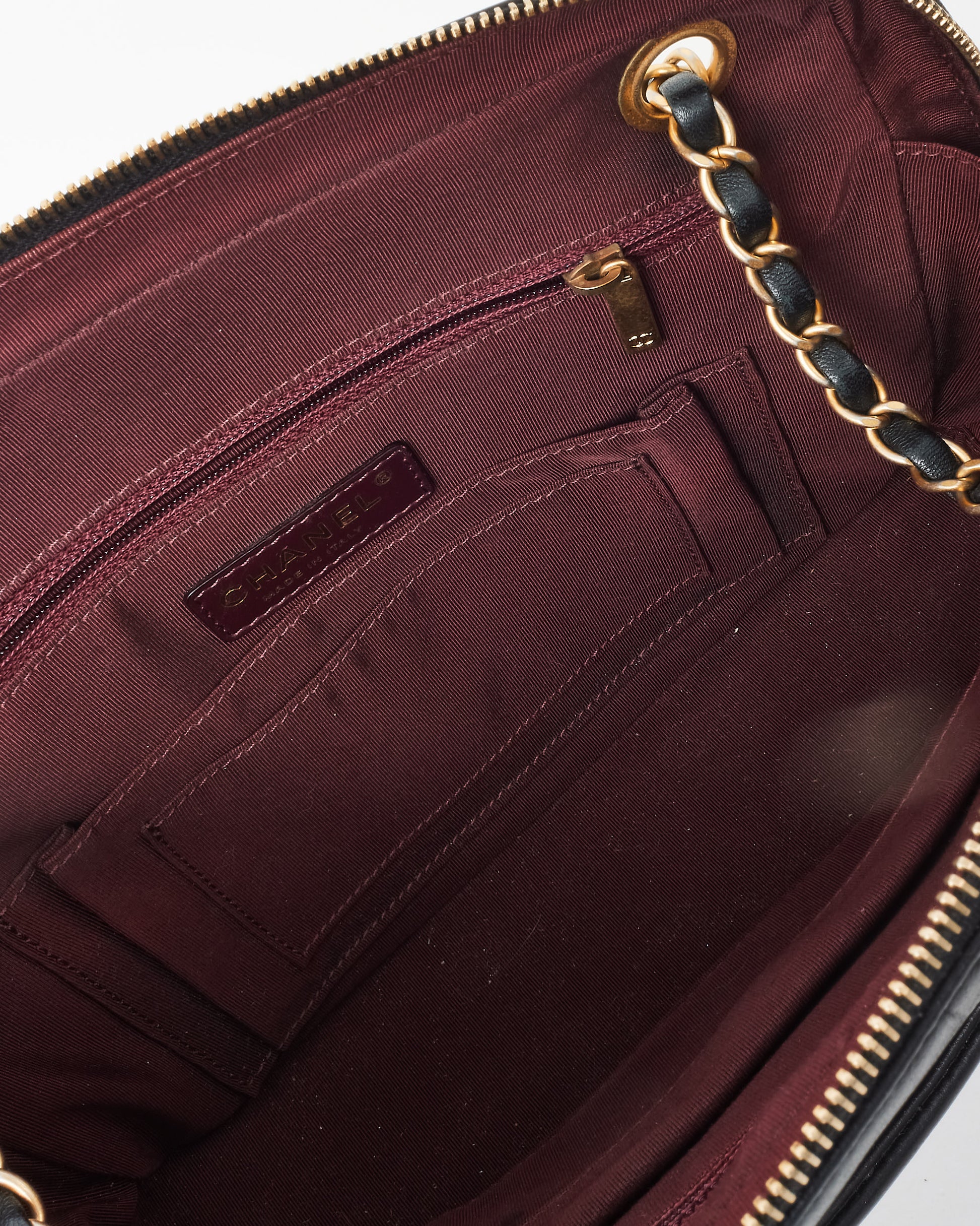 The iconic interlocking CC logo adorns the front, while the gold-tone chain and leather shoulder strap allow for comfortable crossbody or shoulder wear. The top zip closure secures a spacious interior, making it the perfect everyday or evening companion.