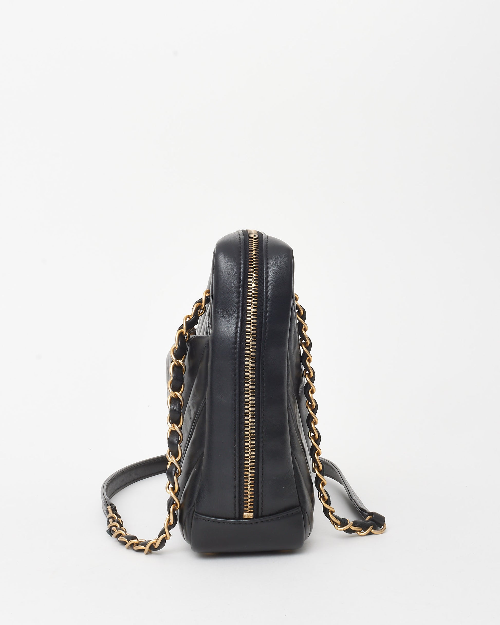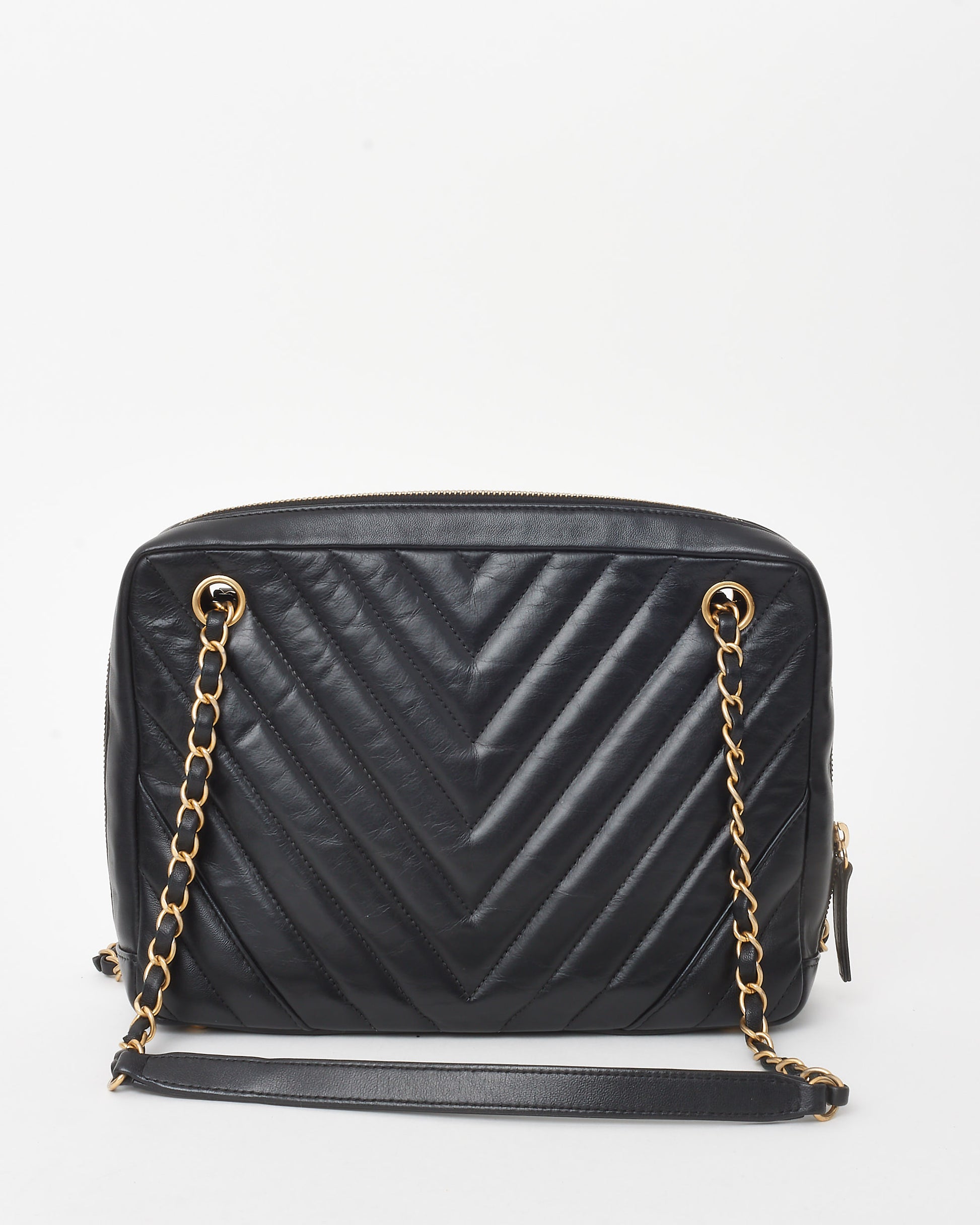 A sophisticated take on a timeless classic, the pre-owned authentic Chanel Black Chevron Quilted Calfskin Leather Camera Shoulder Bag blends elegance with modern functionality. Crafted from smooth black calfskin leather, this bag features signature chevron quilting, offering a sleek and structured silhouette.