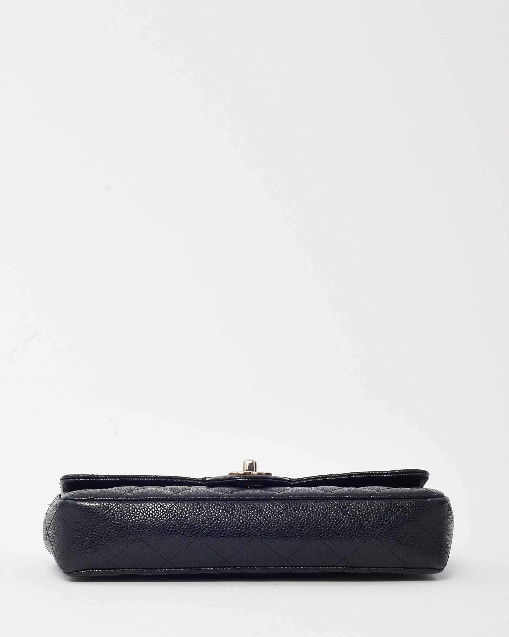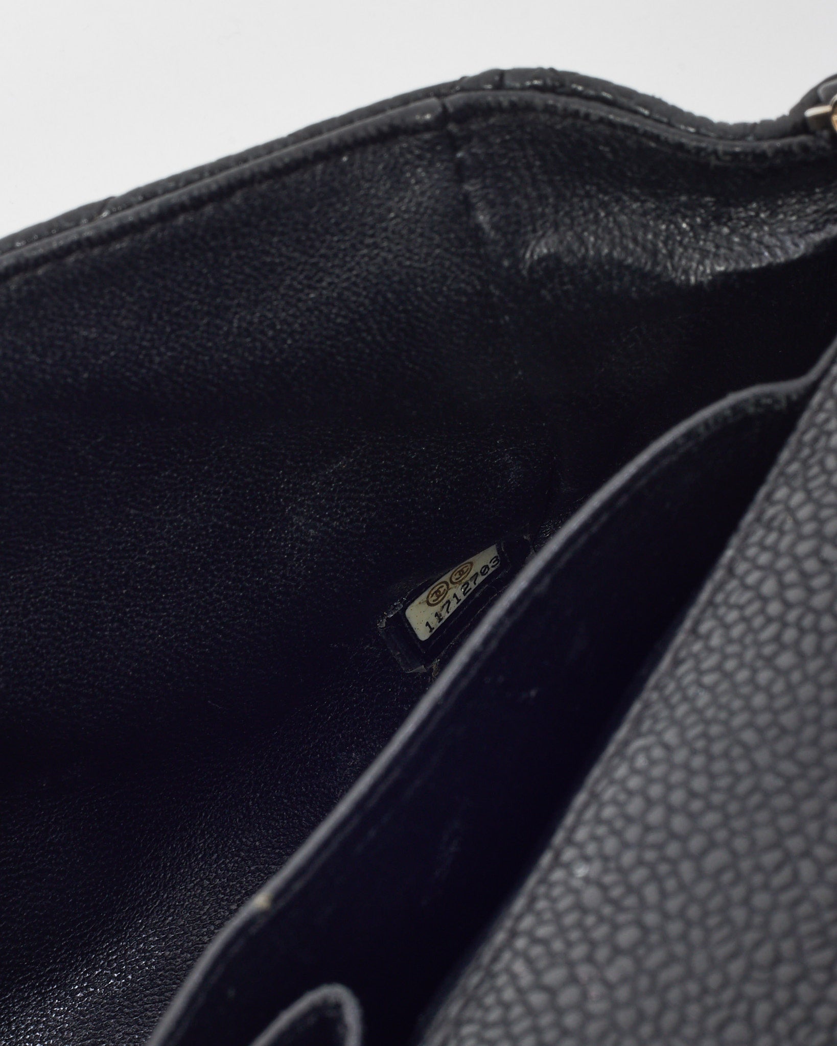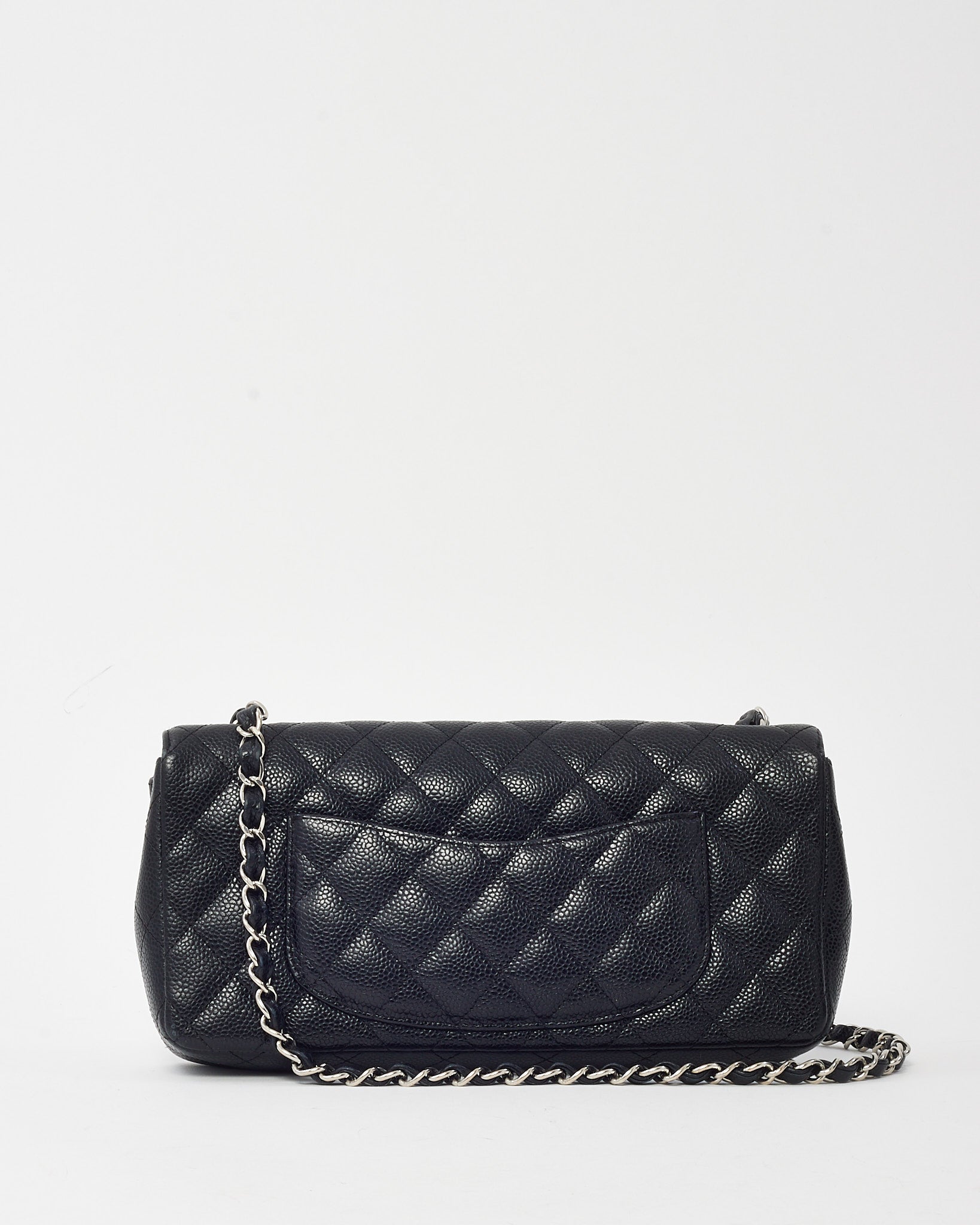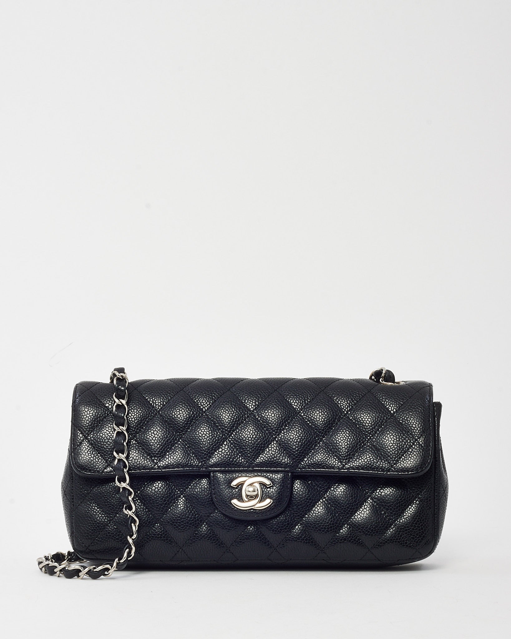 Elevate your everyday with this pre-loved authentic Chanel East/West Single Flap Bag, crafted in durable black caviar leather. Designed with a sleek, elongated silhouette, this timeless piece features the iconic CC turn-lock closure in silver-tone hardware and a woven leather chain strap that can be styled over the shoulder. A compact yet elegant option for day-to-night wear, this Chanel classic brings effortless sophistication to any outfit.