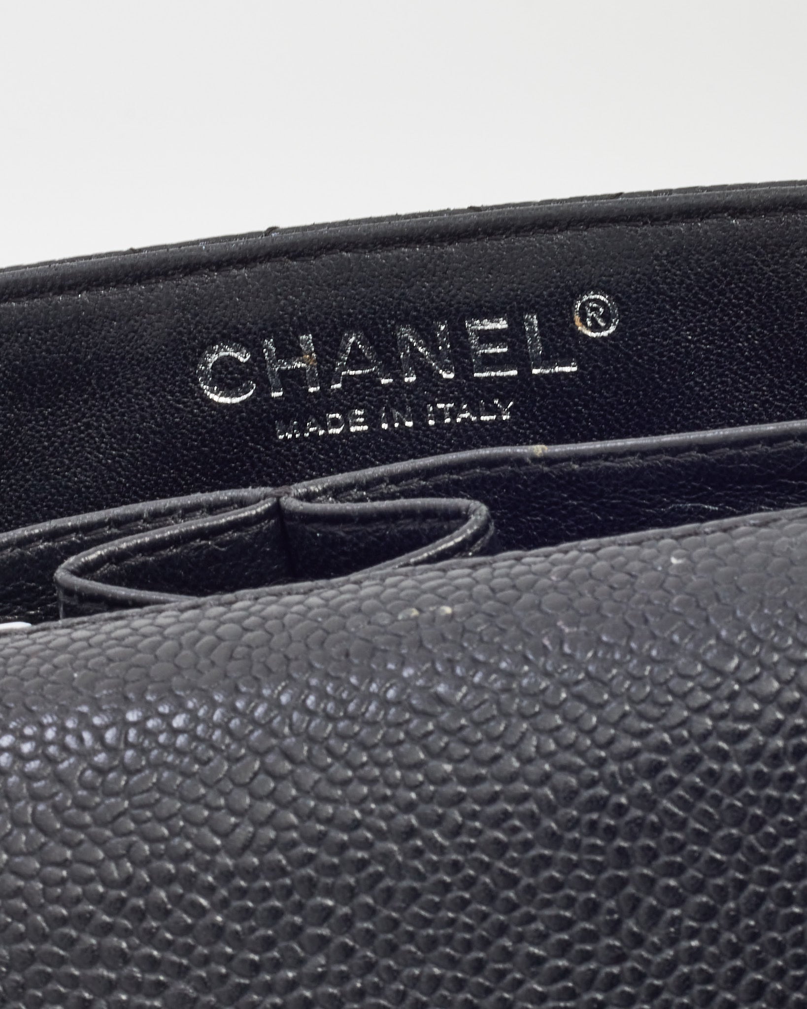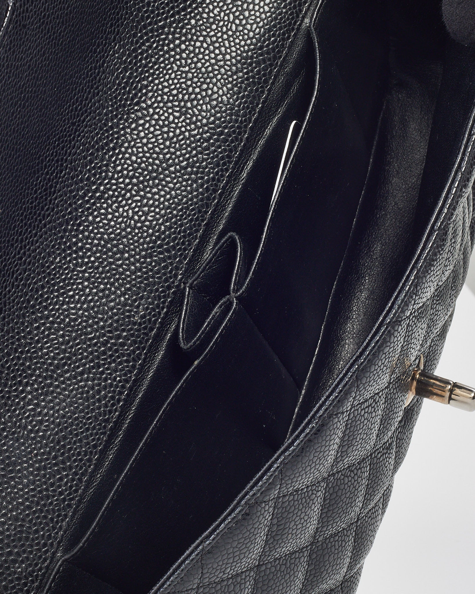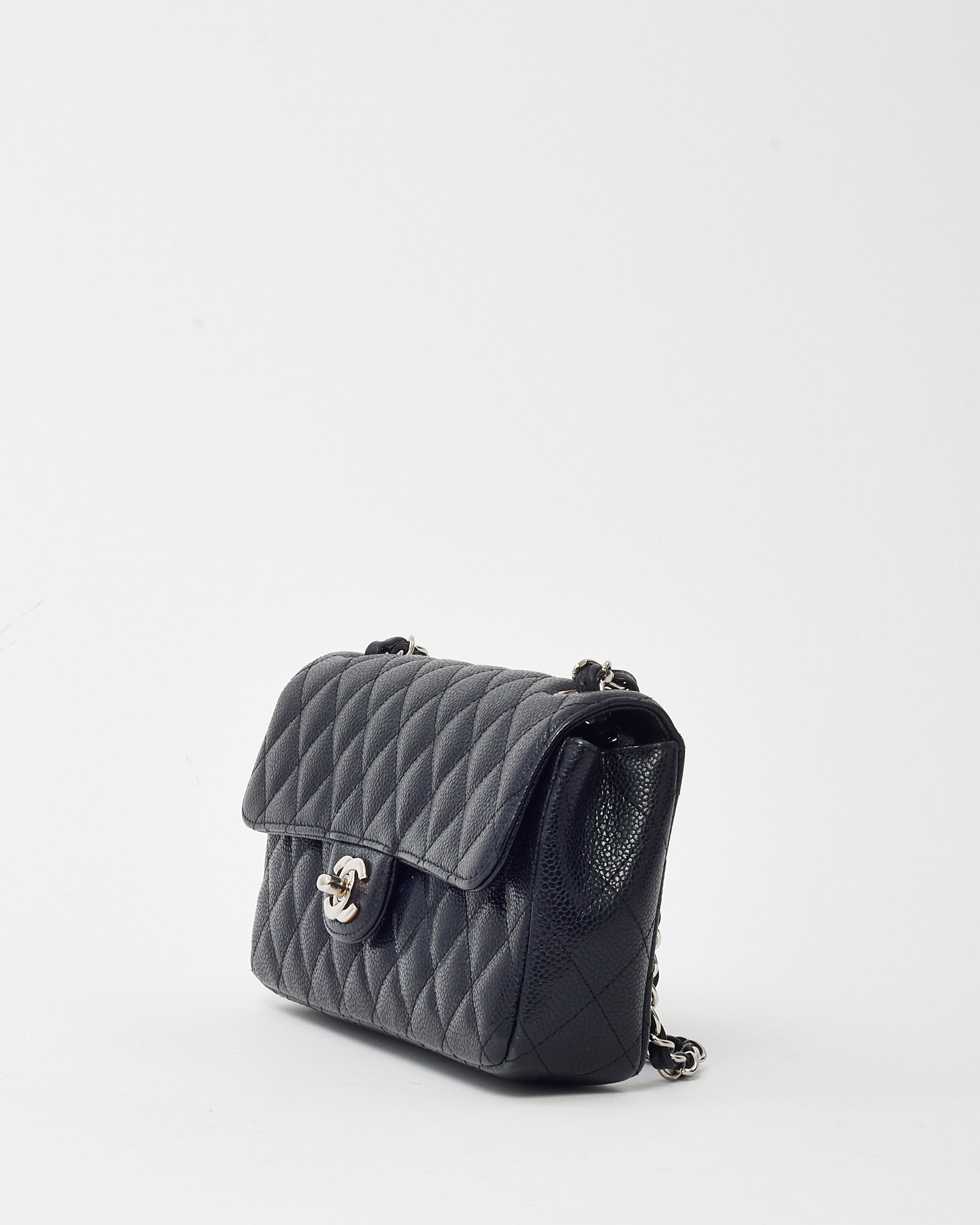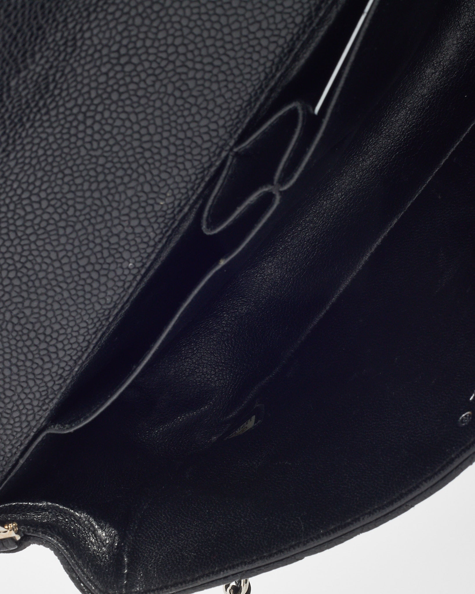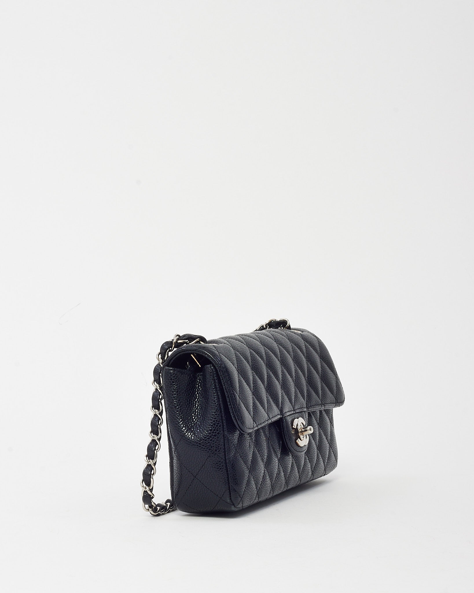 Elevate your everyday with this pre-loved authentic Chanel East/West Single Flap Bag, crafted in durable black caviar leather. Designed with a sleek, elongated silhouette, this timeless piece features the iconic CC turn-lock closure in silver-tone hardware and a woven leather chain strap that can be styled over the shoulder. A compact yet elegant option for day-to-night wear, this Chanel classic brings effortless sophistication to any outfit.