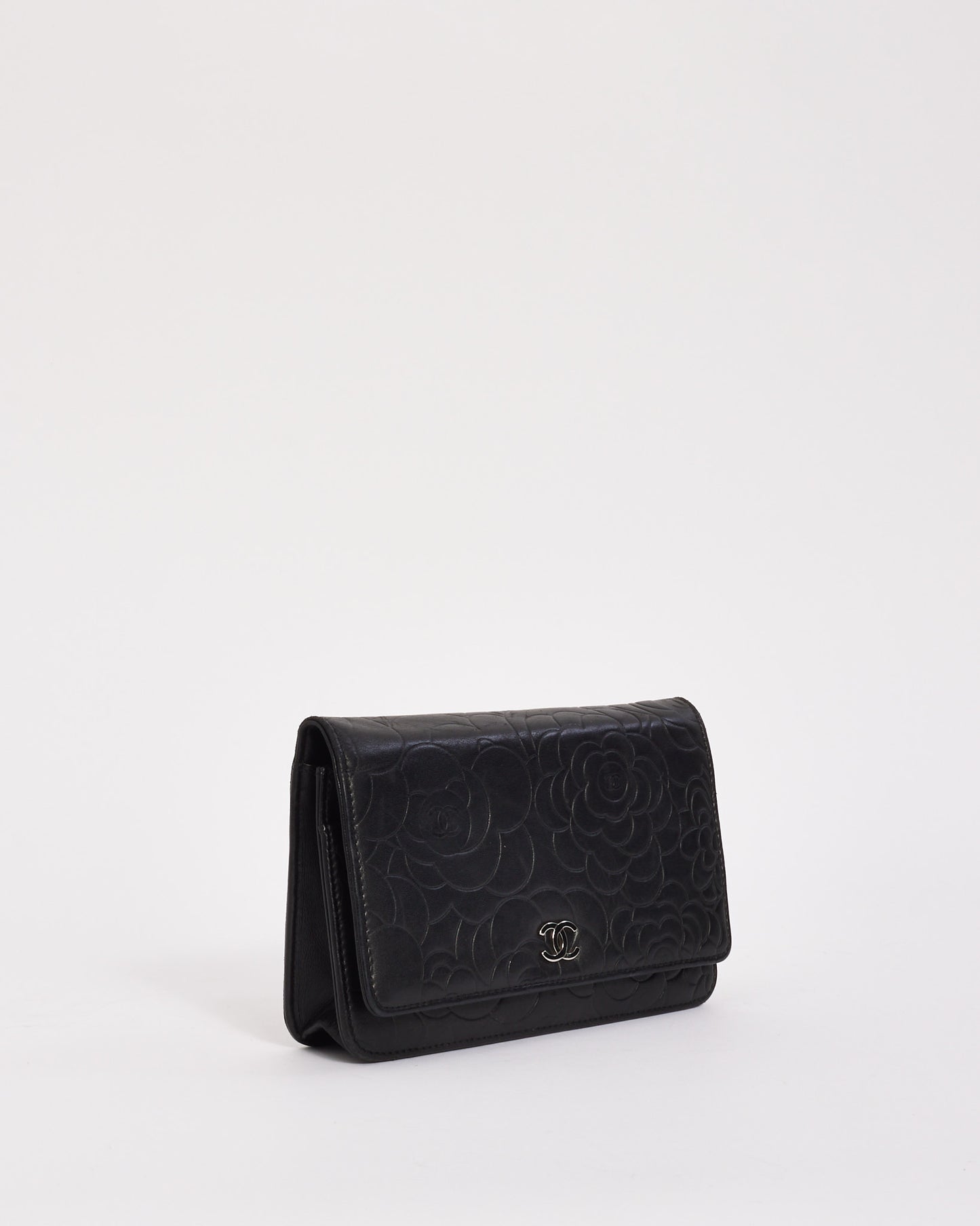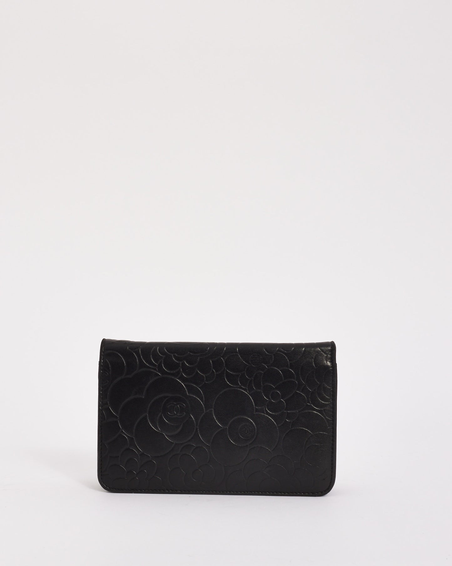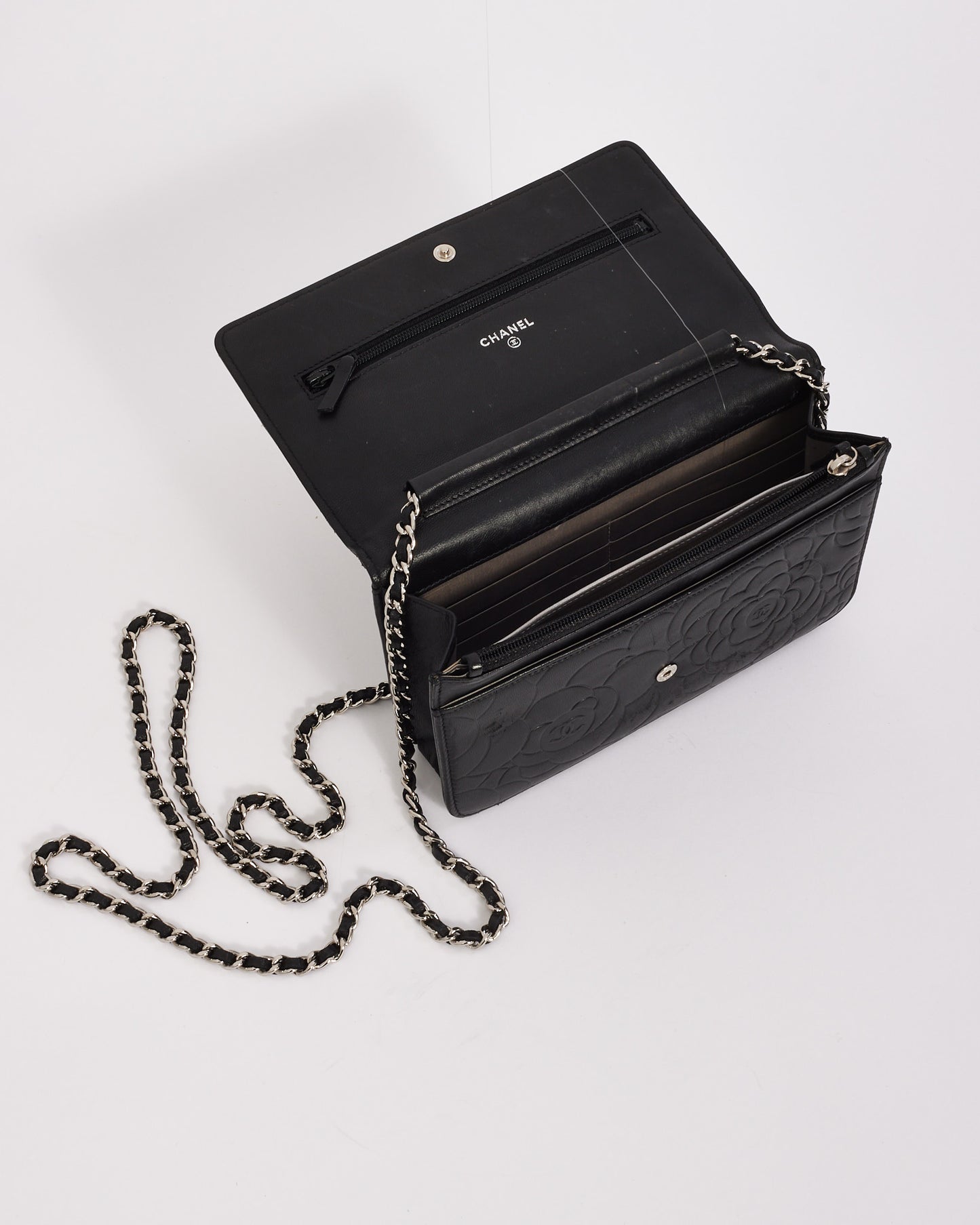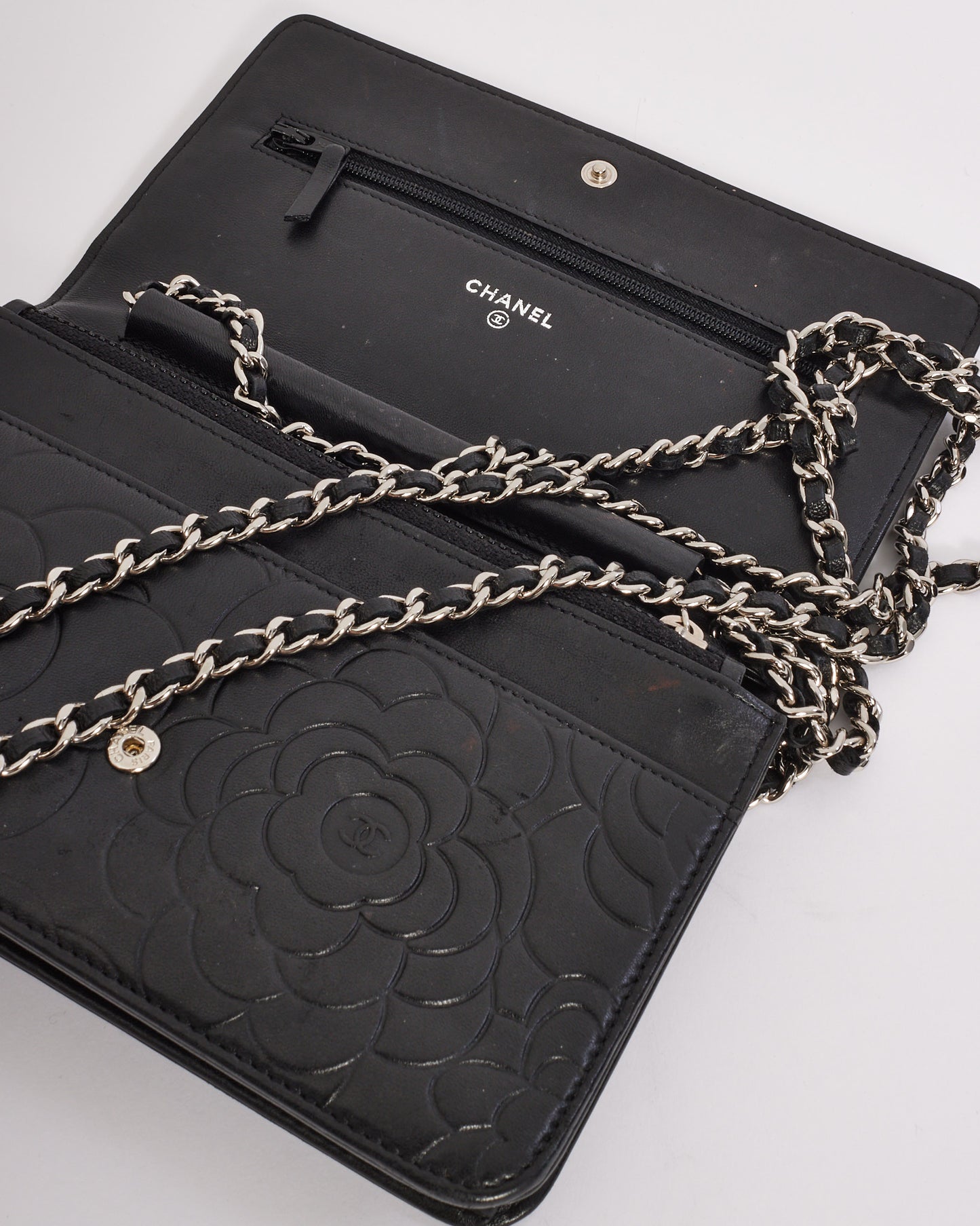 Black Lambskin Leather Camellia Embossed Wallet on Chain