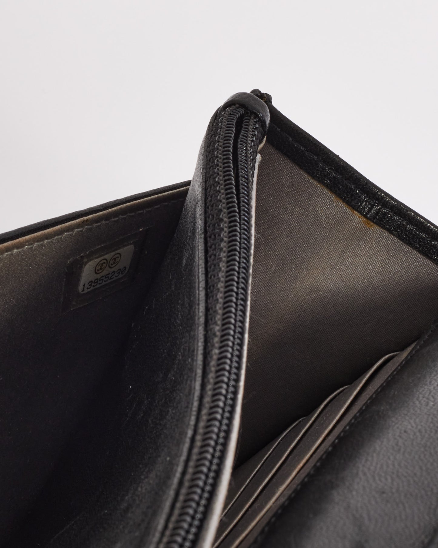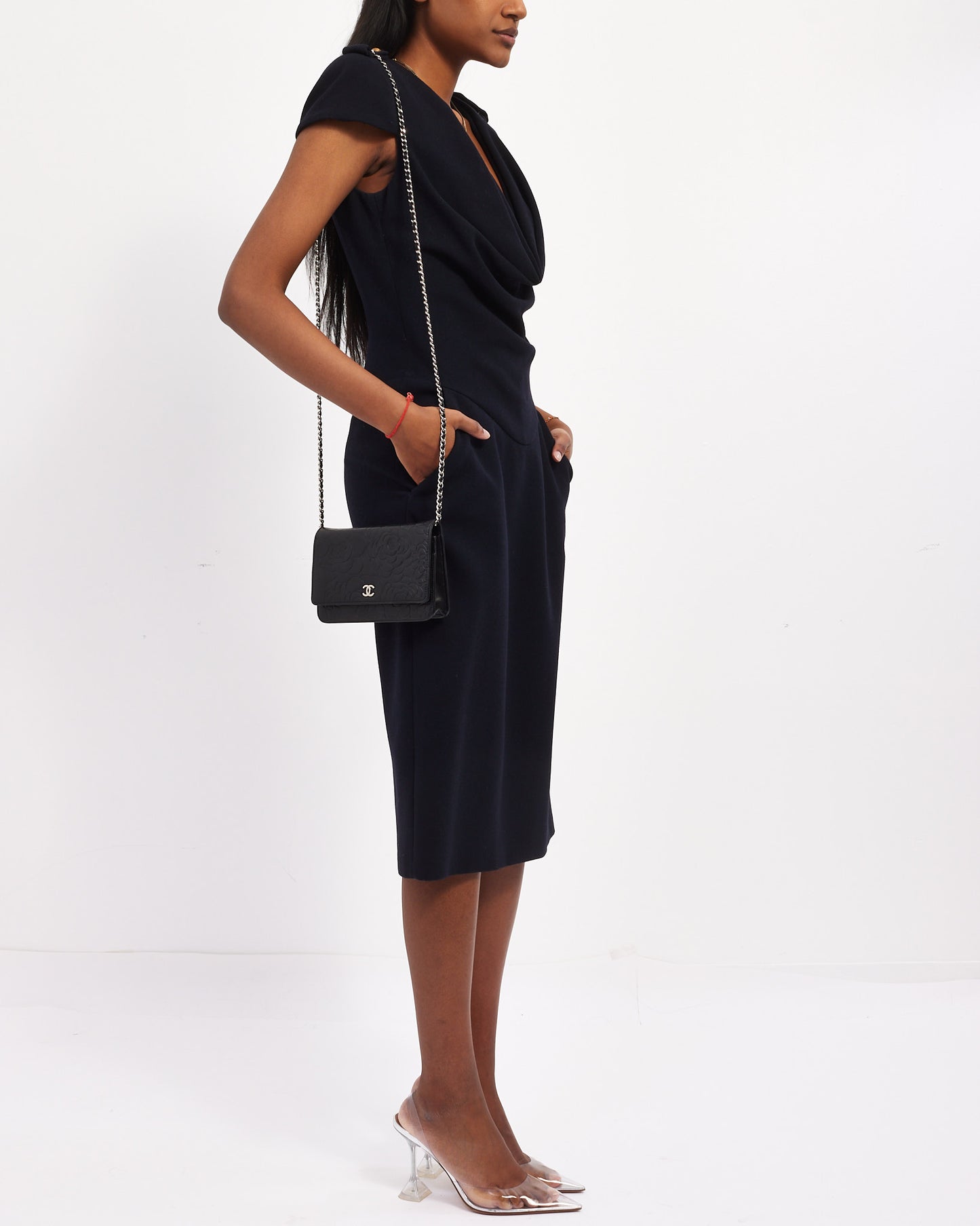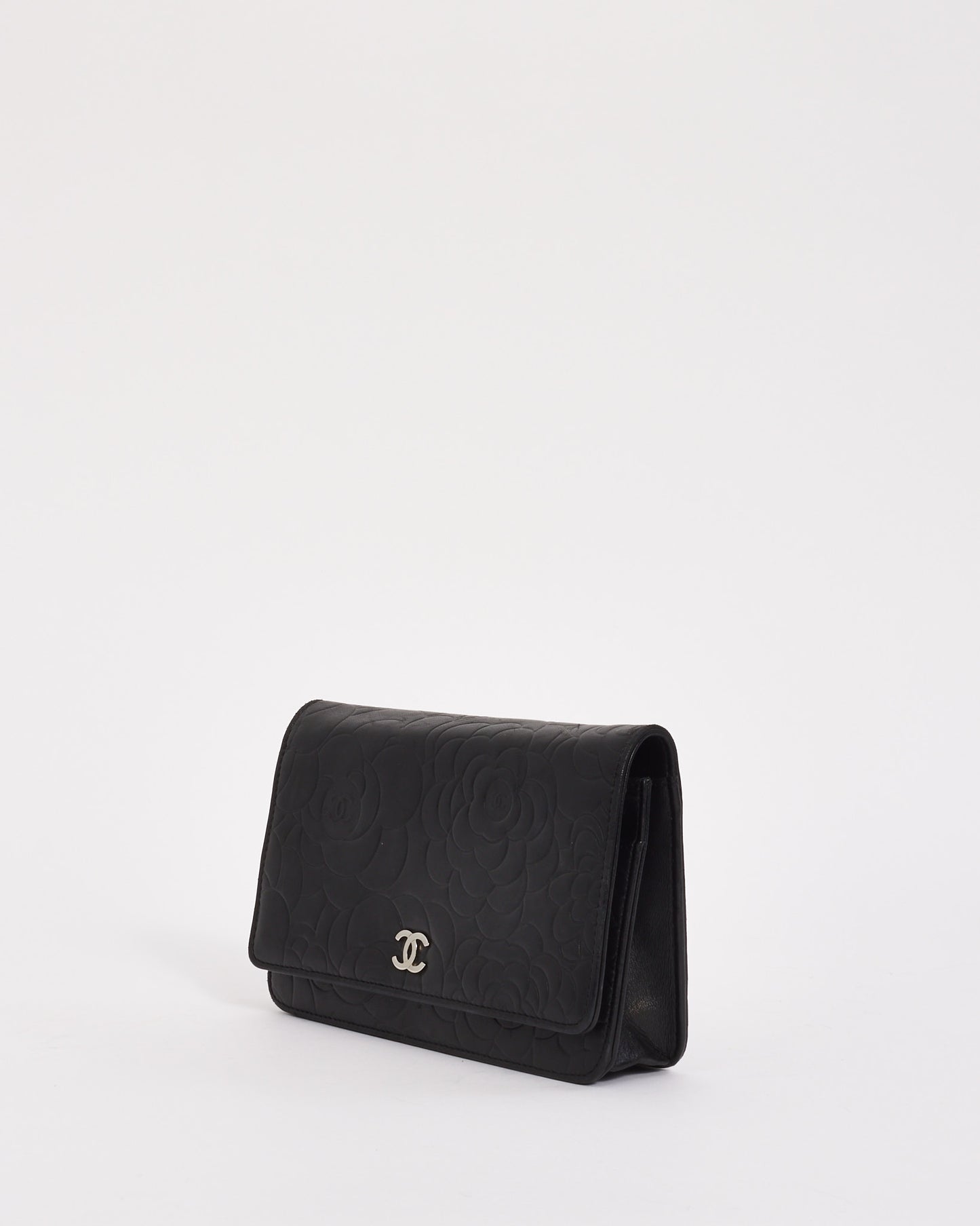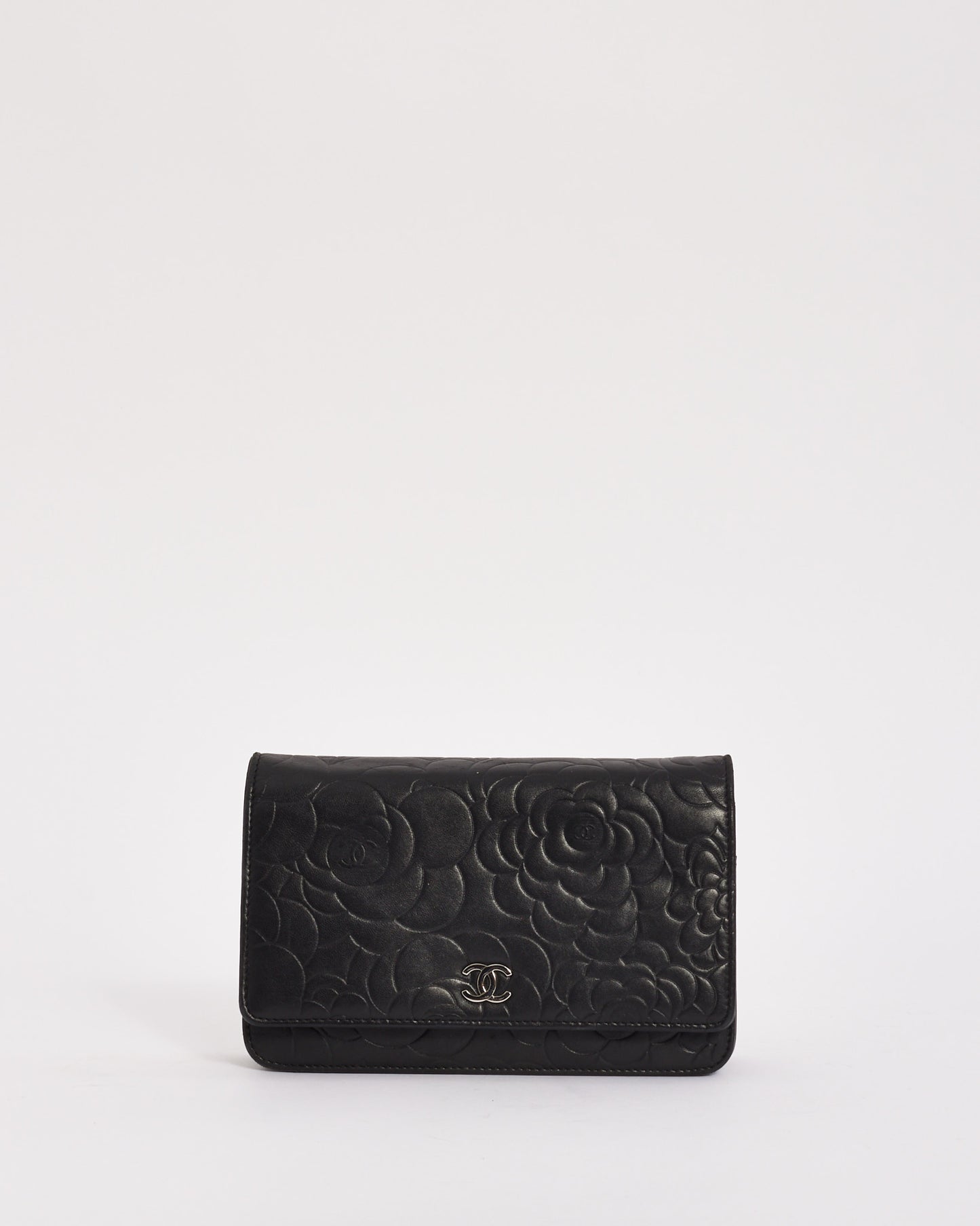 Black Lambskin Leather Camellia Embossed Wallet on Chain