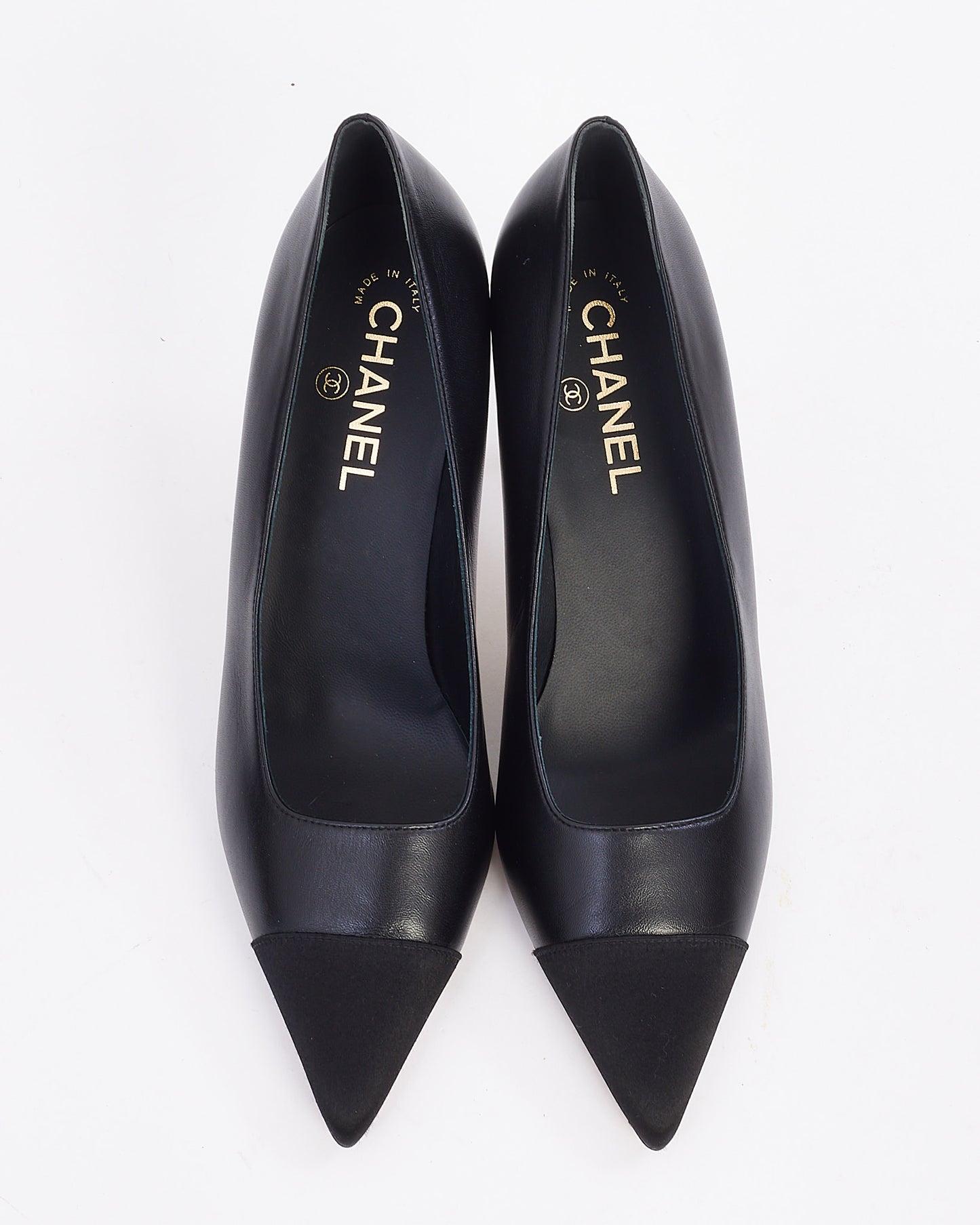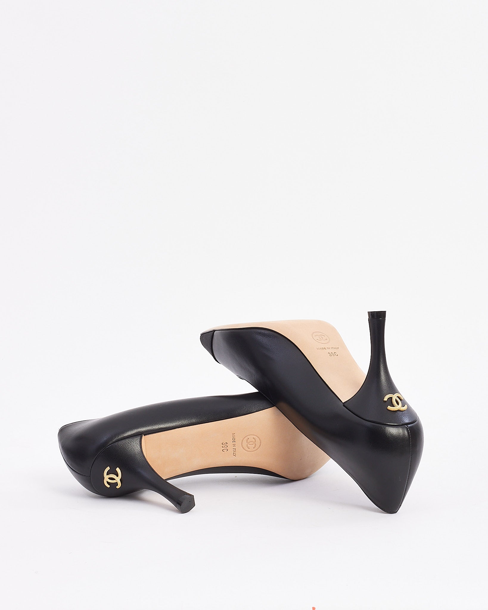 Black Lambskin Leather CC Heel Pointed Toe Pumps - 39.5