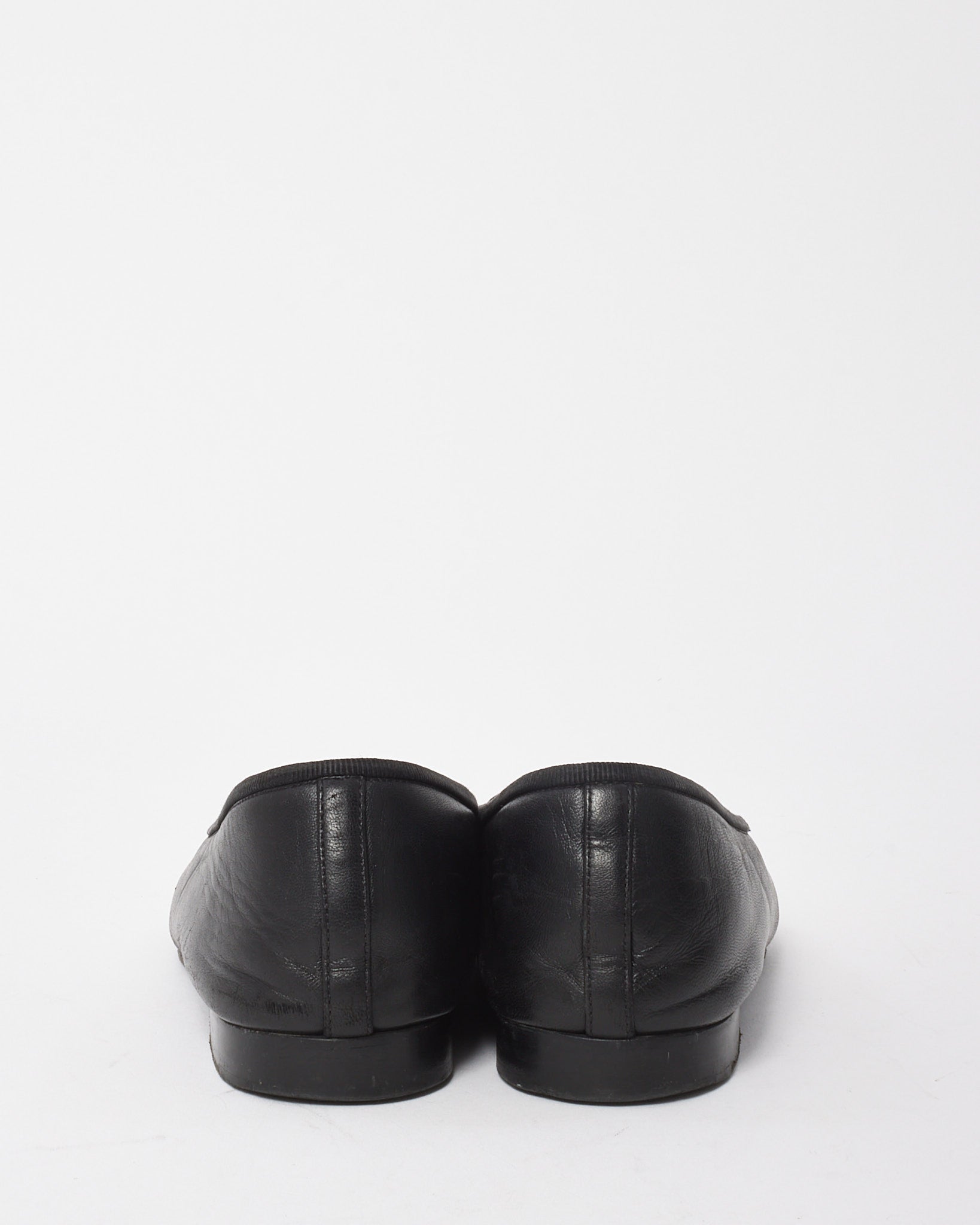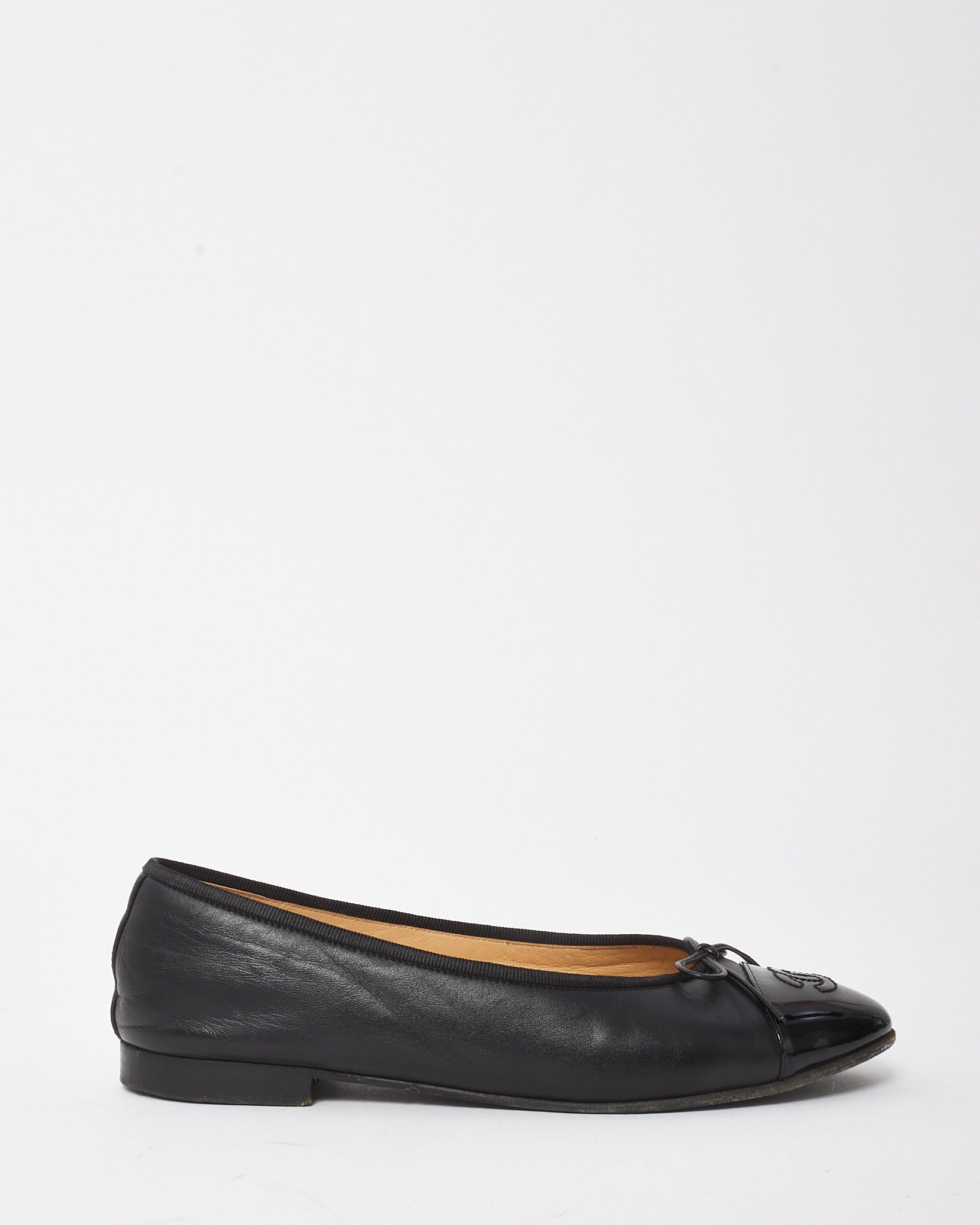 Elevate your everyday elegance with these pre-loved authentic Chanel ballet flats. Expertly crafted in soft black lambskin leather with contrasting black patent calfskin cap toes, this timeless silhouette showcases the iconic stitched CC logo at the front for unmistakable house heritage. A delicate grosgrain bow adds a feminine touch, while the low stacked heel offers comfort and ease. Refined yet versatile, these flats are the perfect pairing for everything from denim to tailored looks.