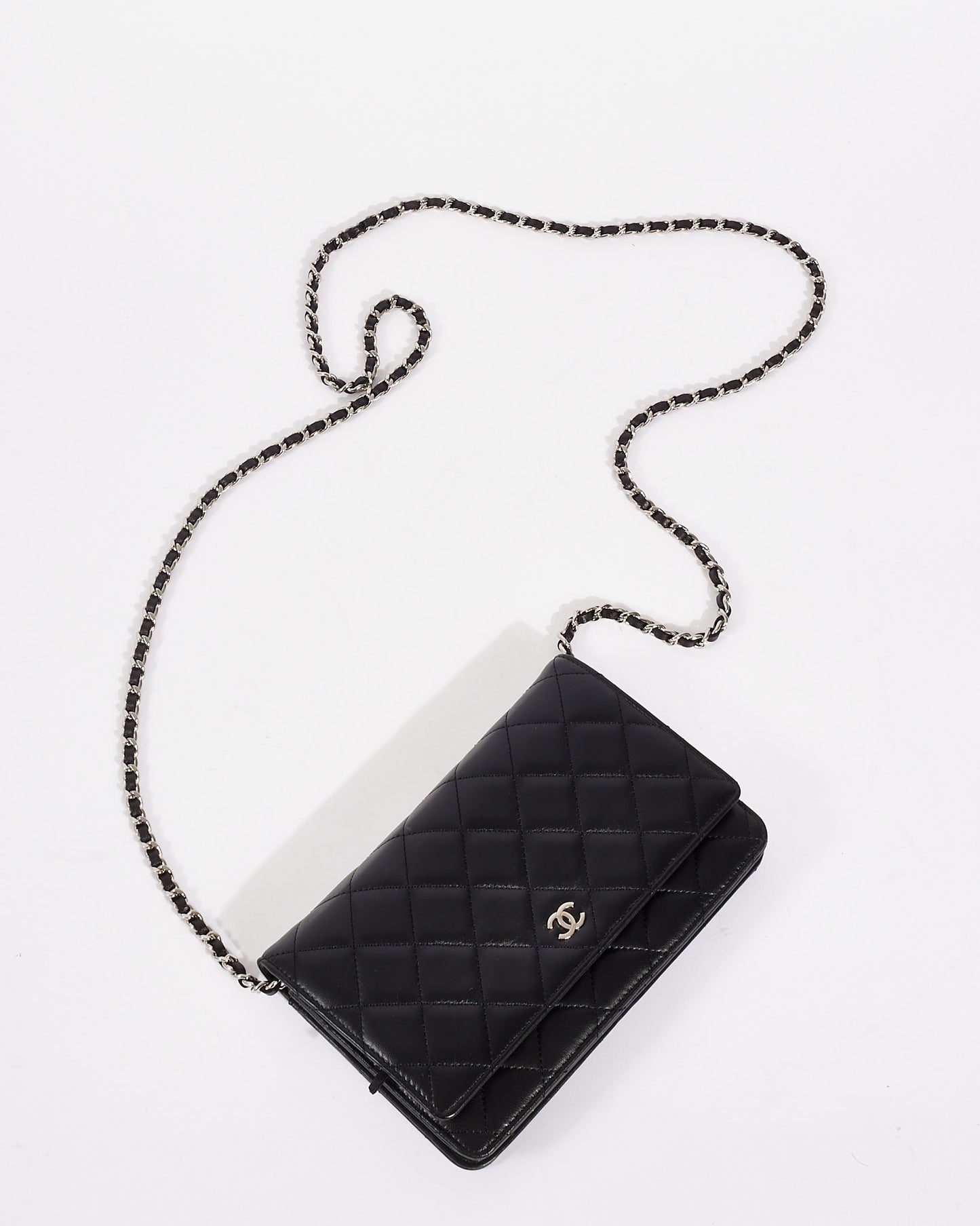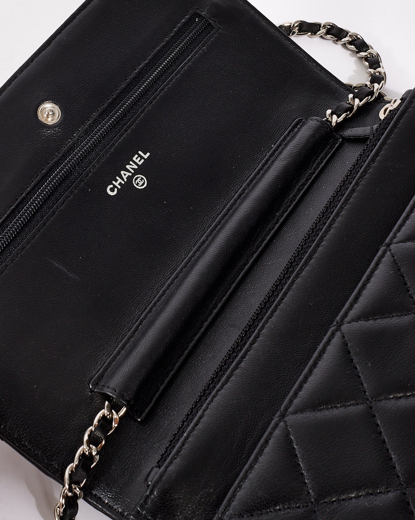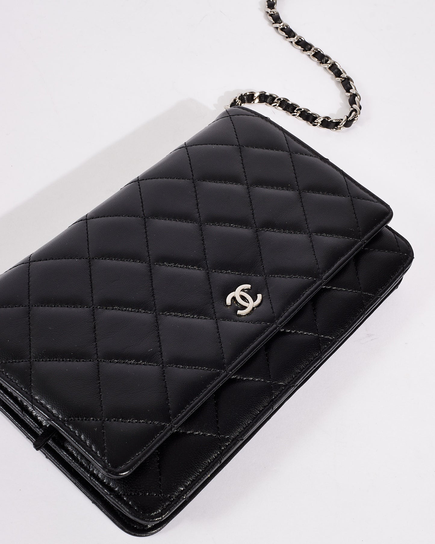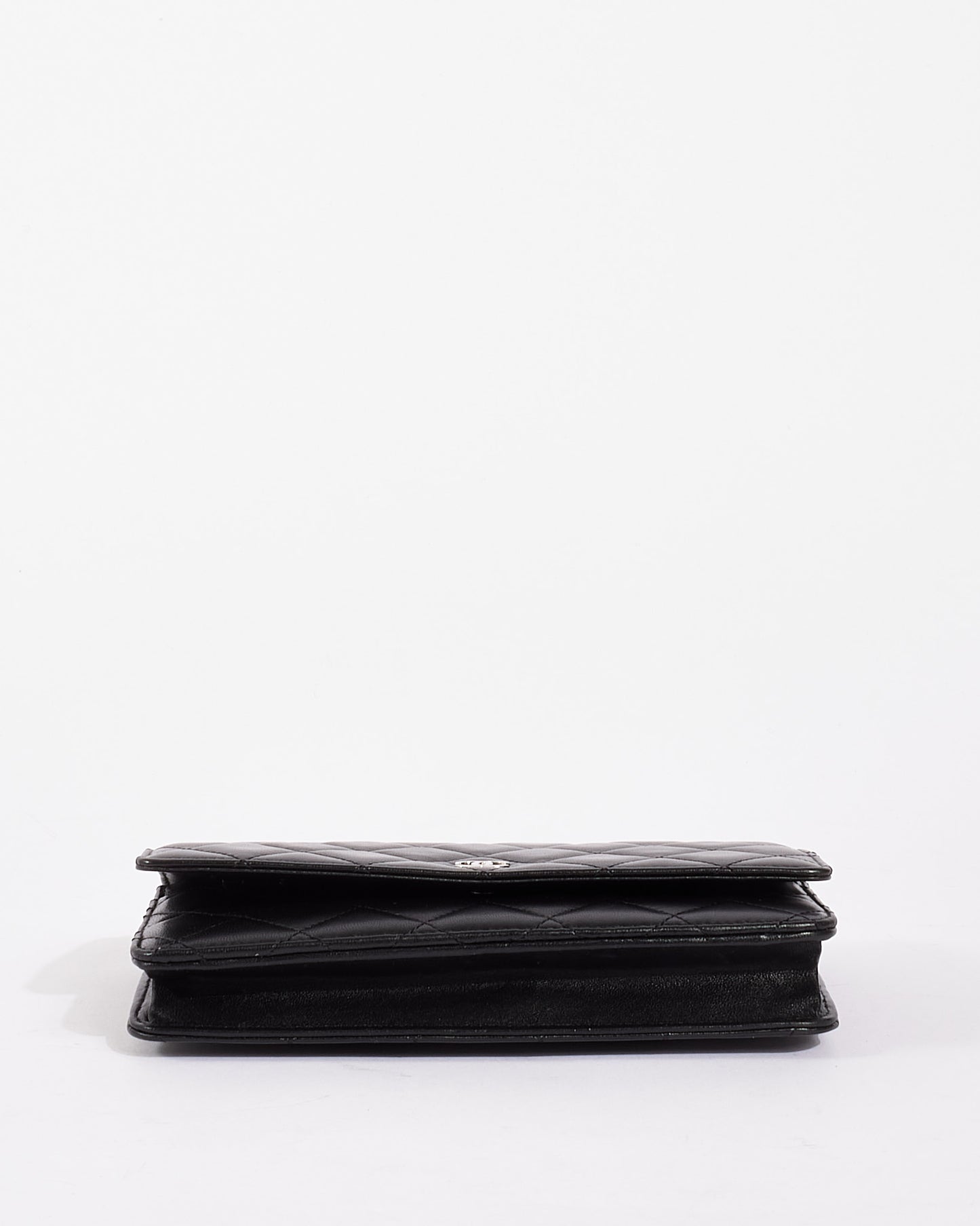 Black Lambskin Leather Wallet on Chain with Silver Hardware