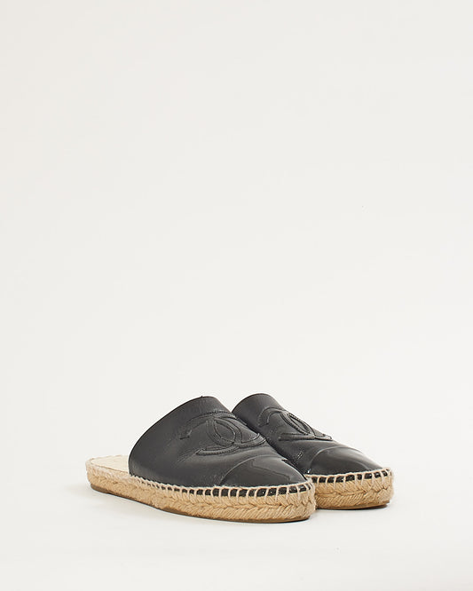 Black Leather CC Interlocking Patent Espadrille Slides - 37