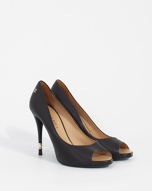 Black Leather CC Pearl Embellished Heel Peep Toe Pumps - 39.5