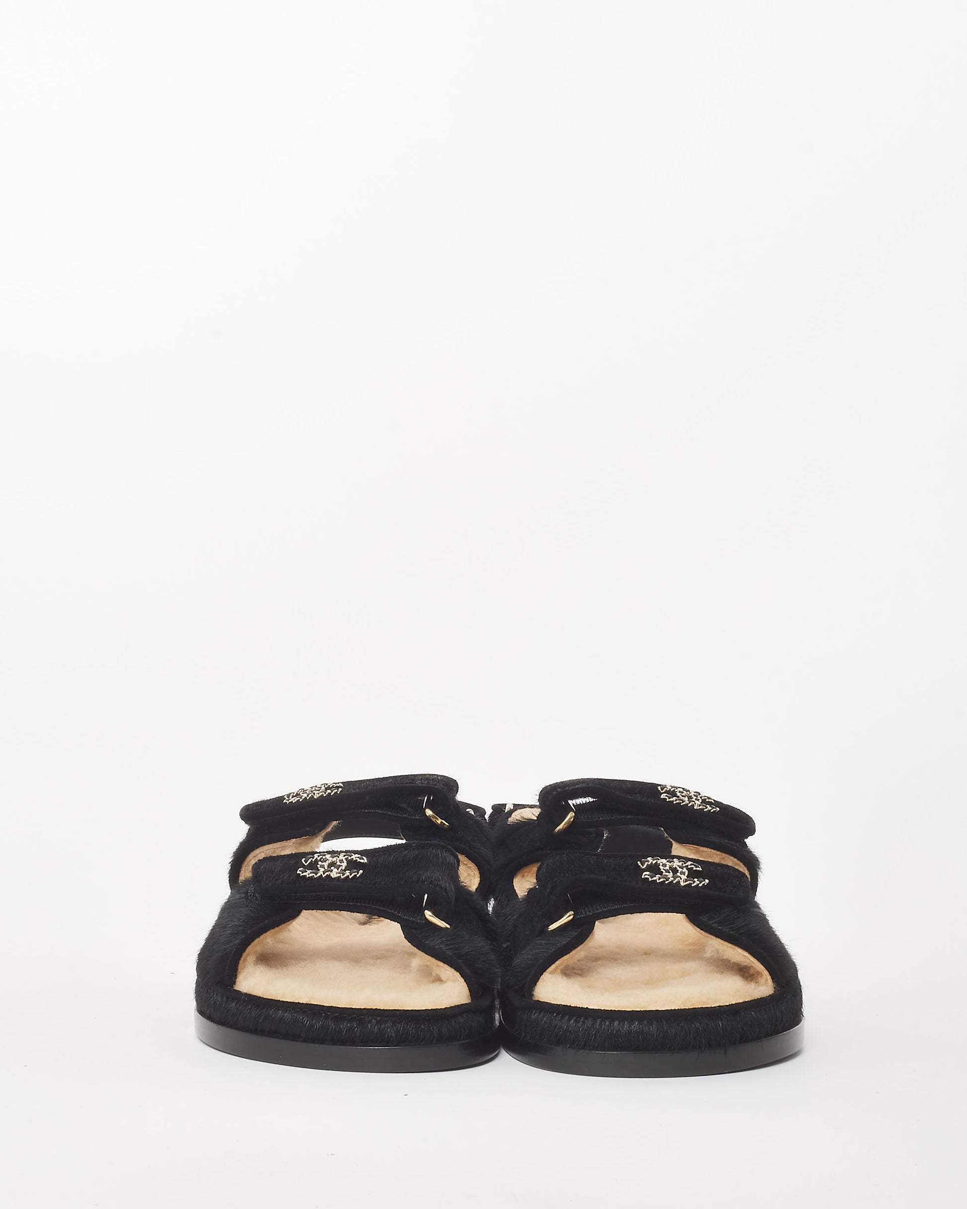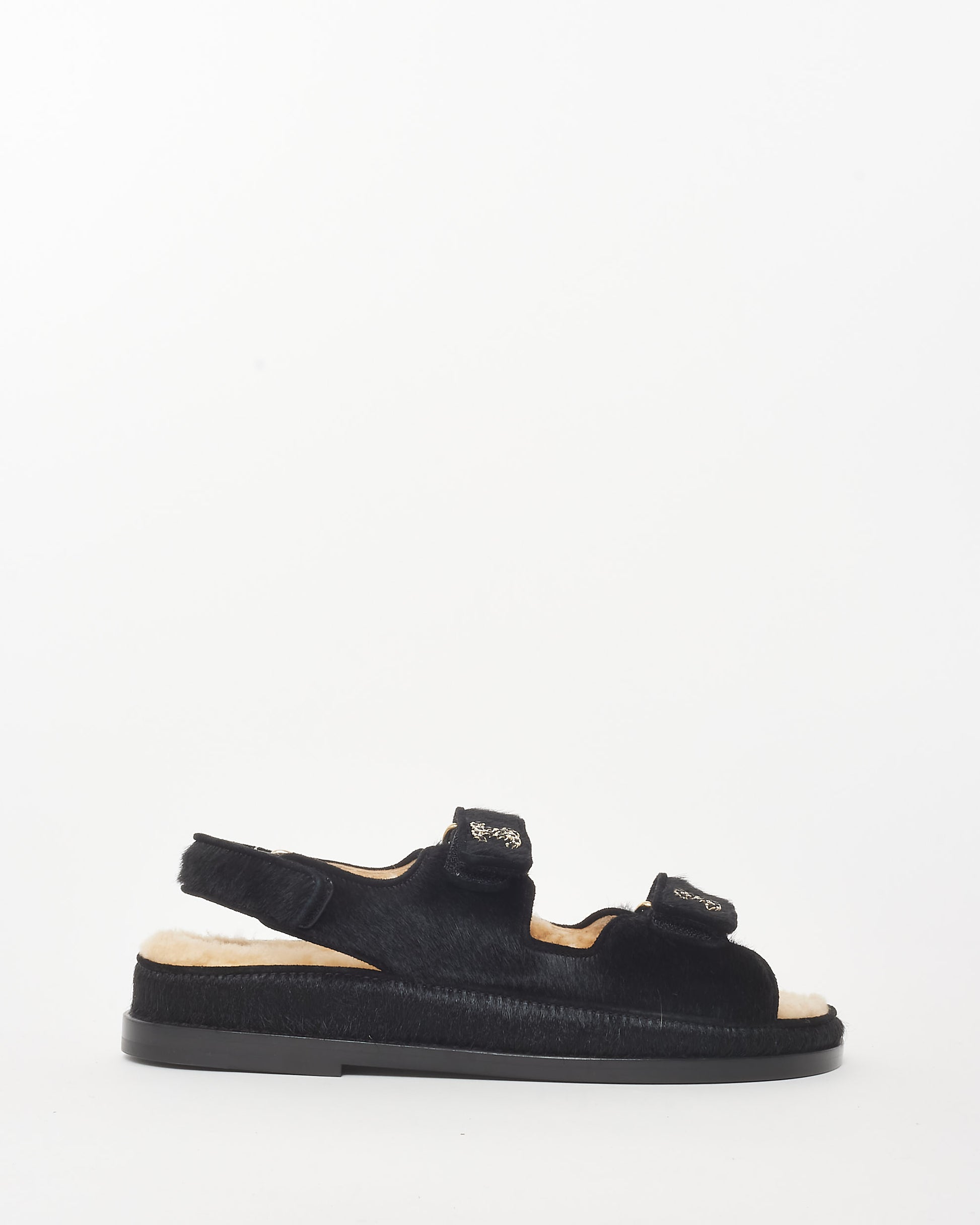 Equal parts cozy and cool, the pre-owned authentic Chanel Black Pony Hair & Shearling Logo Dad Sandals are a fashion-forward take on comfort with signature house flair. Crafted from luxurious black pony hair, these standout sandals feature plush shearling lining and bold Chanel logo straps, blending high fashion with laid-back ease.