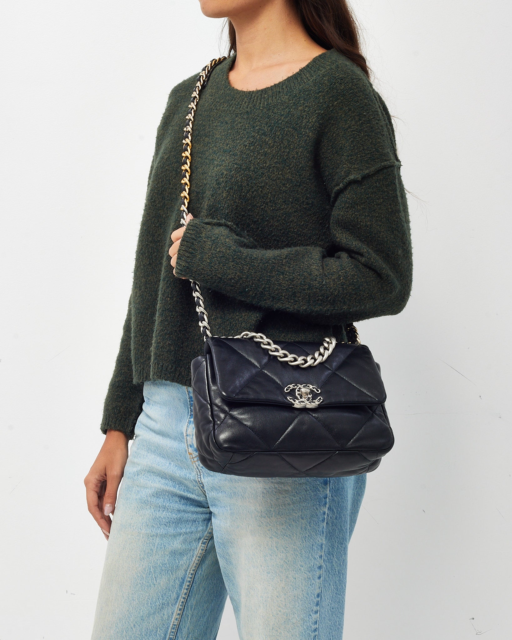 Add timeless elegance to your collection with this pre-loved authentic Chanel Small 19 bag crafted from luxurious black quilted lambskin leather. Designed with the brand’s signature soft structure, this iconic piece features mixed silver-tone hardware, including the classic interlocking CC logo and chunky chain strap for versatile shoulder or crossbody wear. A true wardrobe staple, the Chanel 19 balances everyday practicality with unmistakable Parisian flair—perfect for day-to-night sophistication.