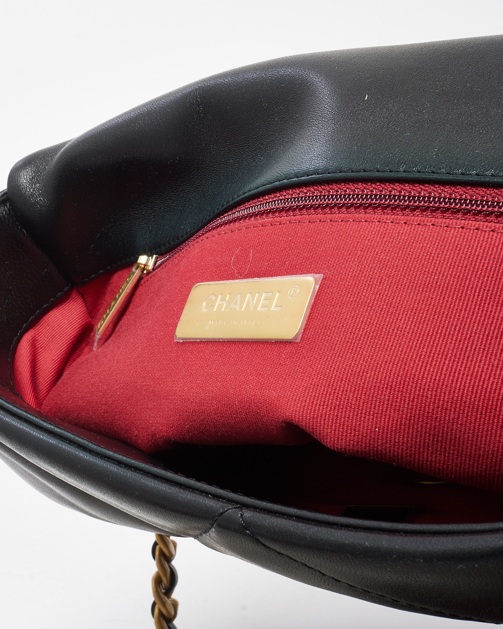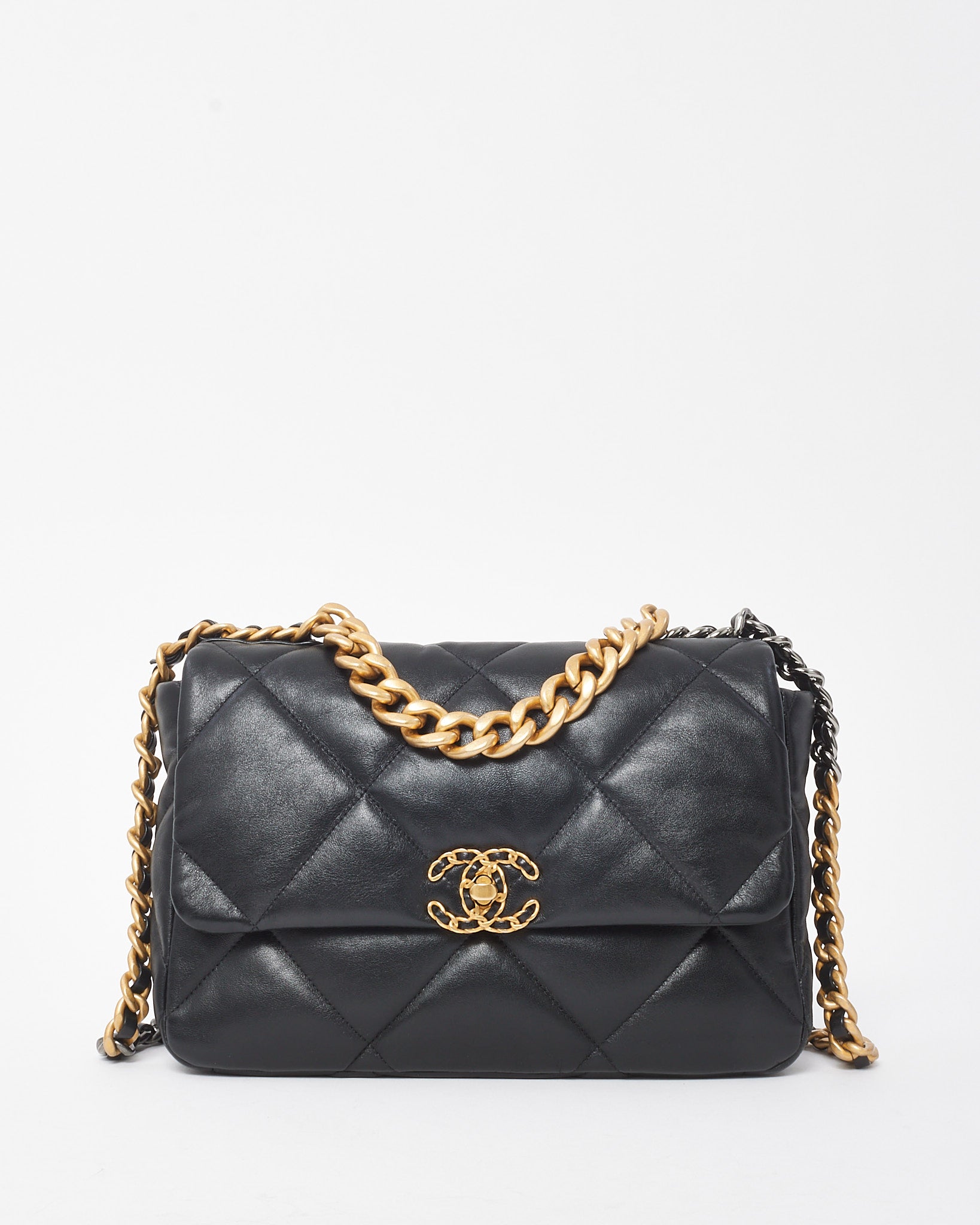 Make a refined statement with this pre-loved authentic Chanel Black Quilted Shiny Lambskin Leather Large Chanel 19 Bag. Crafted in supple lambskin with a lustrous finish, this oversized version of the iconic Chanel 19 showcases the house’s signature diamond quilting and bold, mixed-metal hardware. A prominent gold-tone chain interwoven with leather drapes across the front, anchored by the oversized CC logo, while a chunky chain shoulder strap and leather-woven crossbody strap offer versatile wear. The spacious interior is lined in tonal fabric and finished with a zip pocket, making this bag both functional and fashion-forward — a modern classic that elevates every ensemble.