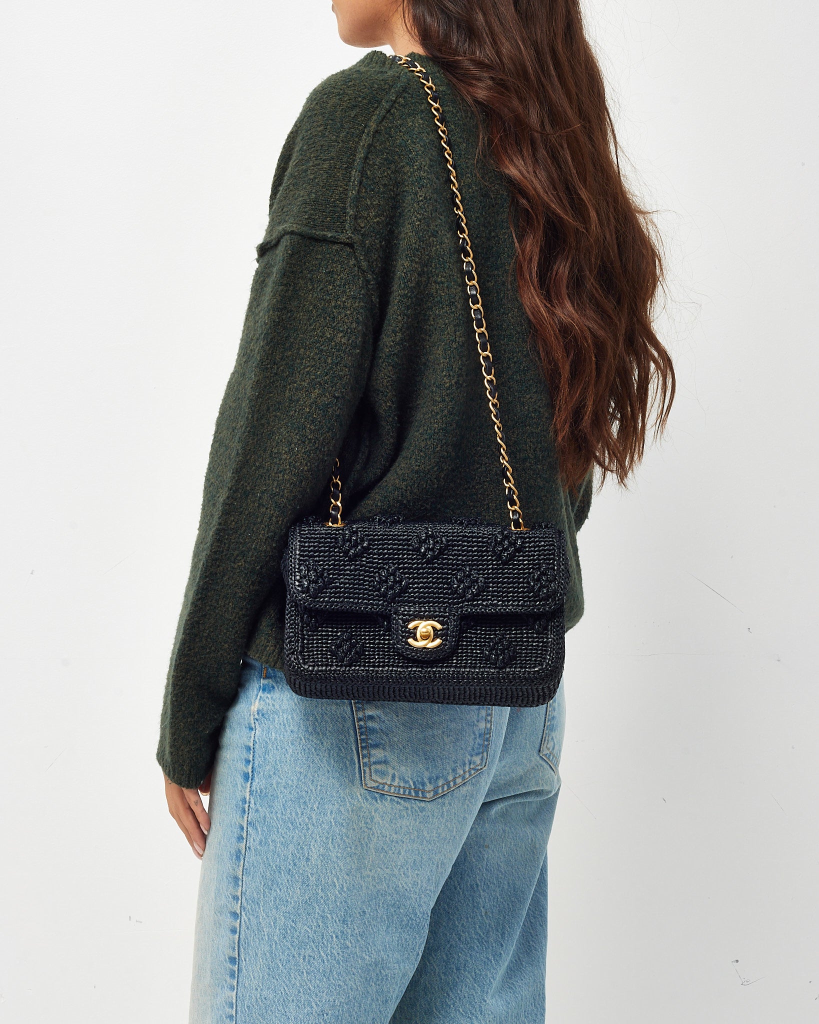 Add a touch of warm-weather elegance to your wardrobe with this pre-loved authentic Chanel Dolce Flap Bag in black raffia. Compact yet chic, this small flap design is crafted from woven raffia with luxe black leather trim and finished with gleaming gold-tone hardware, including the iconic CC turn-lock closure. The lightweight construction and classic flap silhouette make it an ideal day-to-evening companion, blending summer-ready texture with timeless Chanel sophistication.