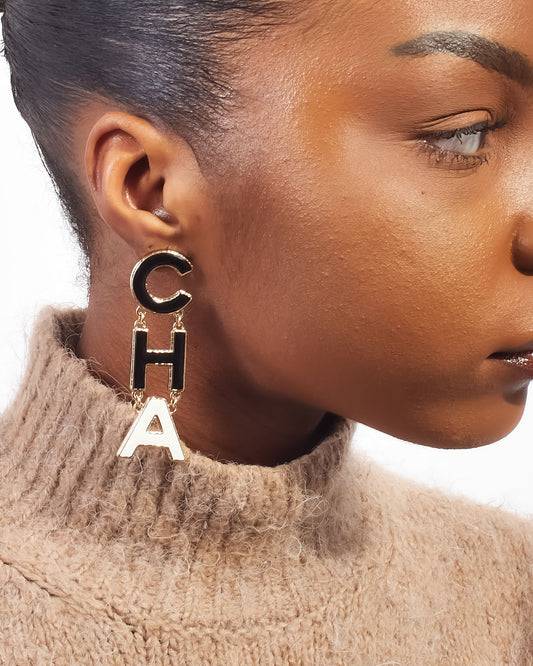 Black & White Enamel 'CHA-NEL' Drop Earrings