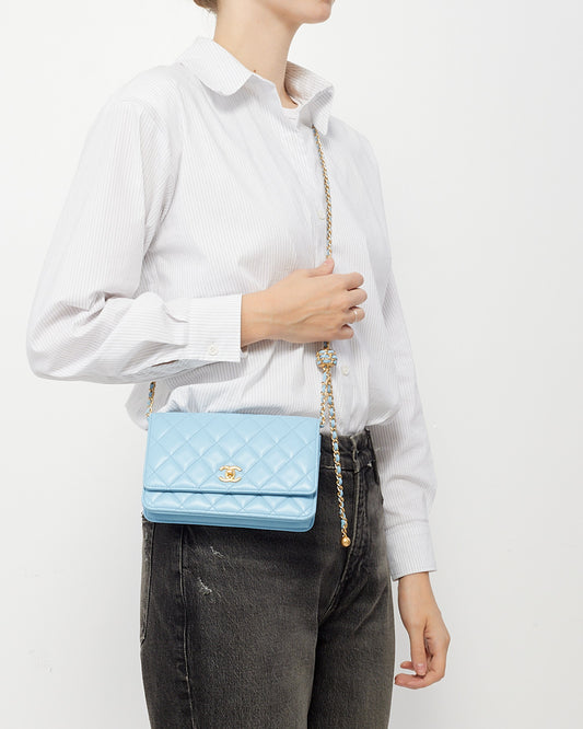 Baby Blue Lambskin Leather Pearl Crush Wallet on Chain