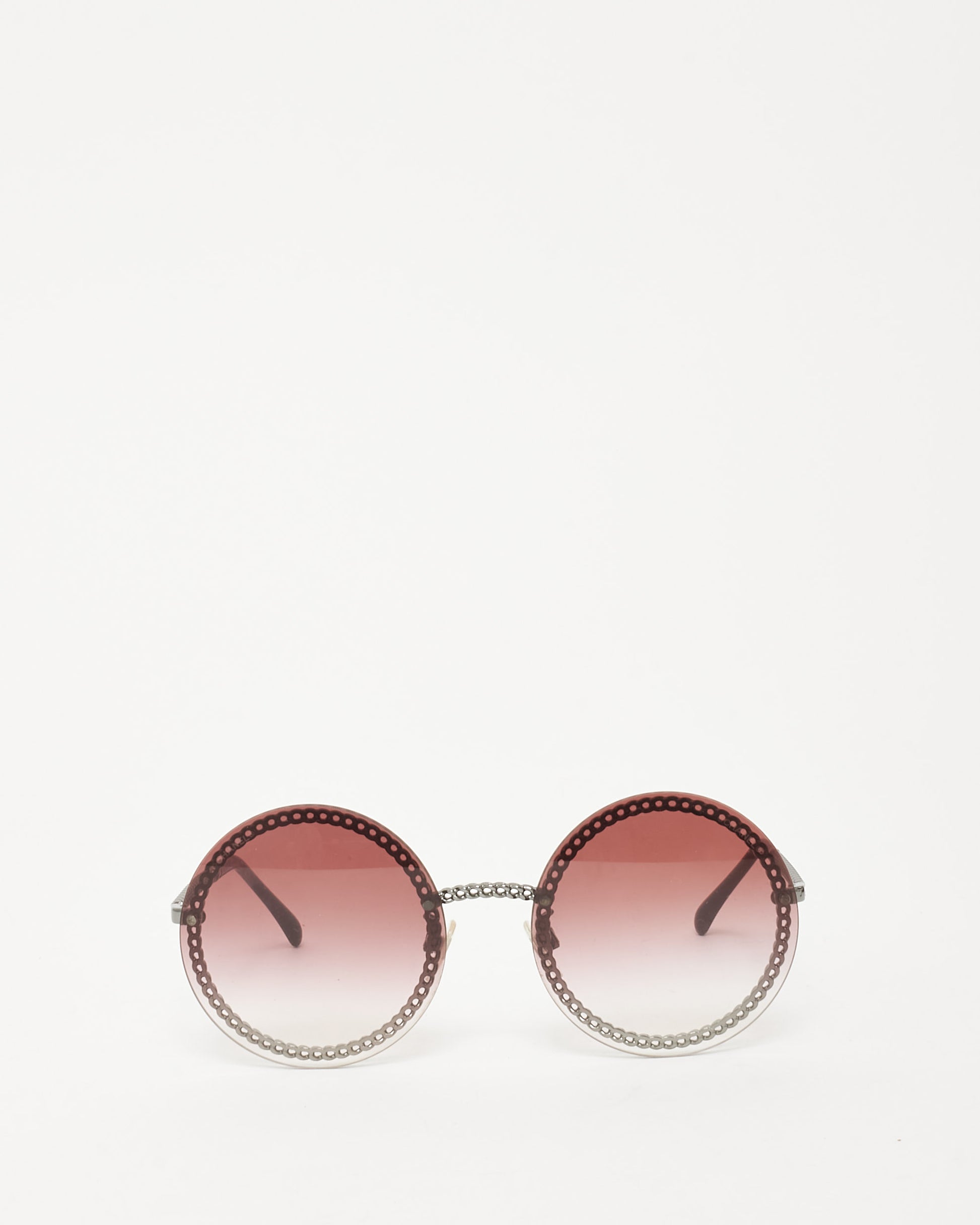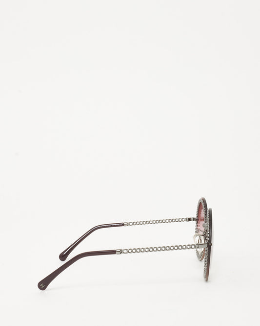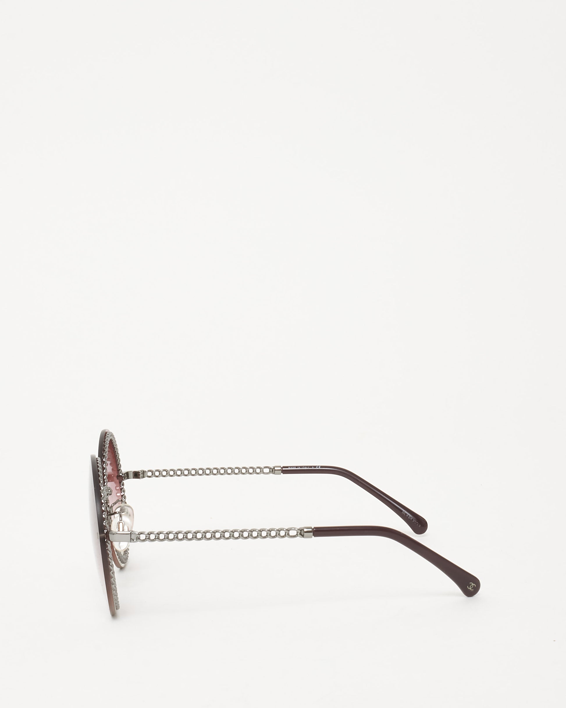 A bold mix of fashion-forward design and classic elegance, the pre-owned authentic Chanel Silver-tone Pink Round Lens 4245 Sunglasses with Removable Burgundy Triple Hanging Chain are a statement accessory with a high-glamour twist. Featuring light pink round lenses and a sleek silver-tone metal frame, these sunglasses bring a retro-cool edge to any look.