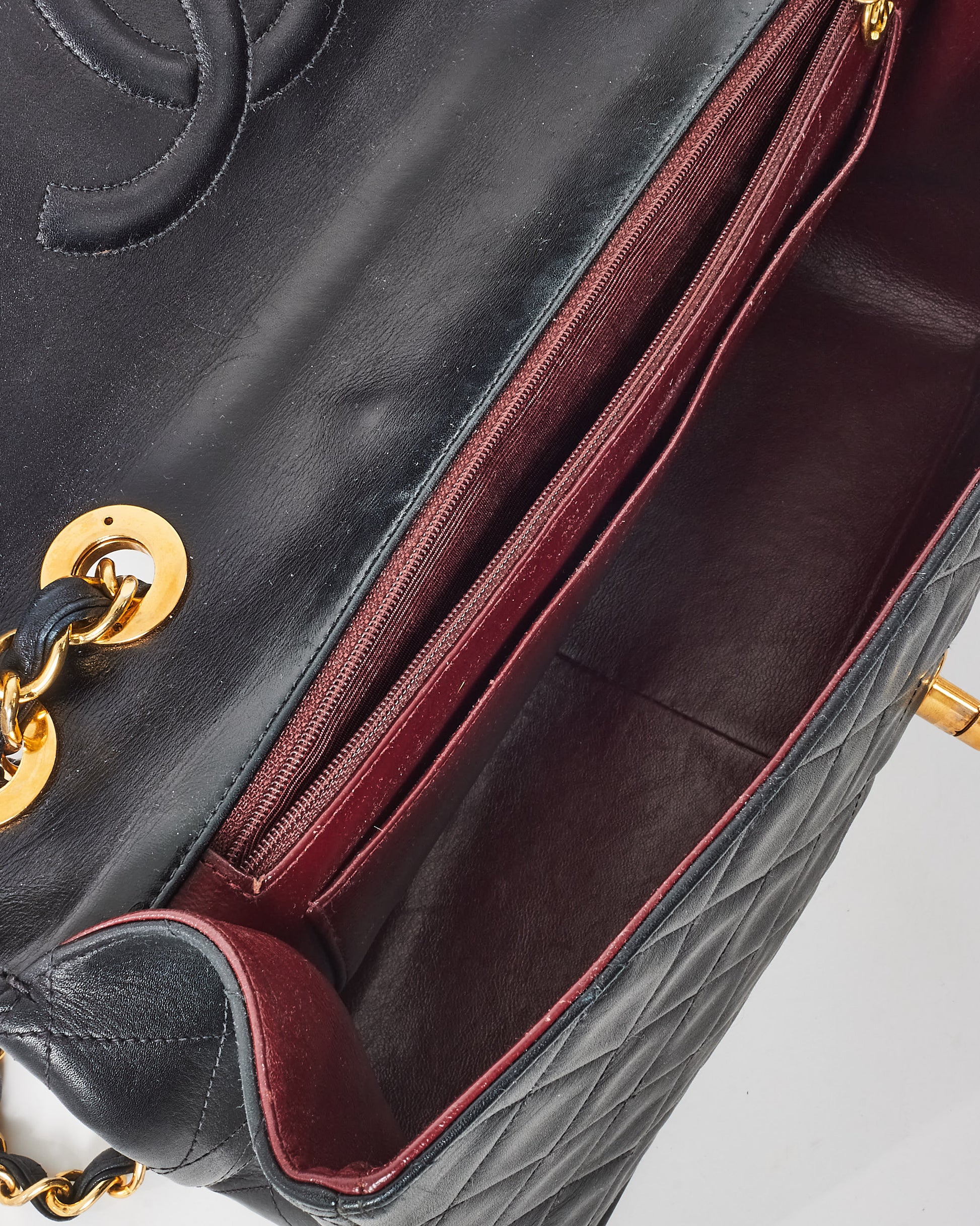 Timelessly elegant and exquisitely crafted, this 1994-1996 authentic pre-owned Chanel Vintage Black Lambskin 24K Gold Plated Hardware Maxi Single Flap Bag is a true collector’s piece. Made from luxurious black lambskin leather, this bag features Chanel’s signature quilted pattern and is adorned with 24K gold-plated hardware, including the iconic interlocking CC turn-lock closure.