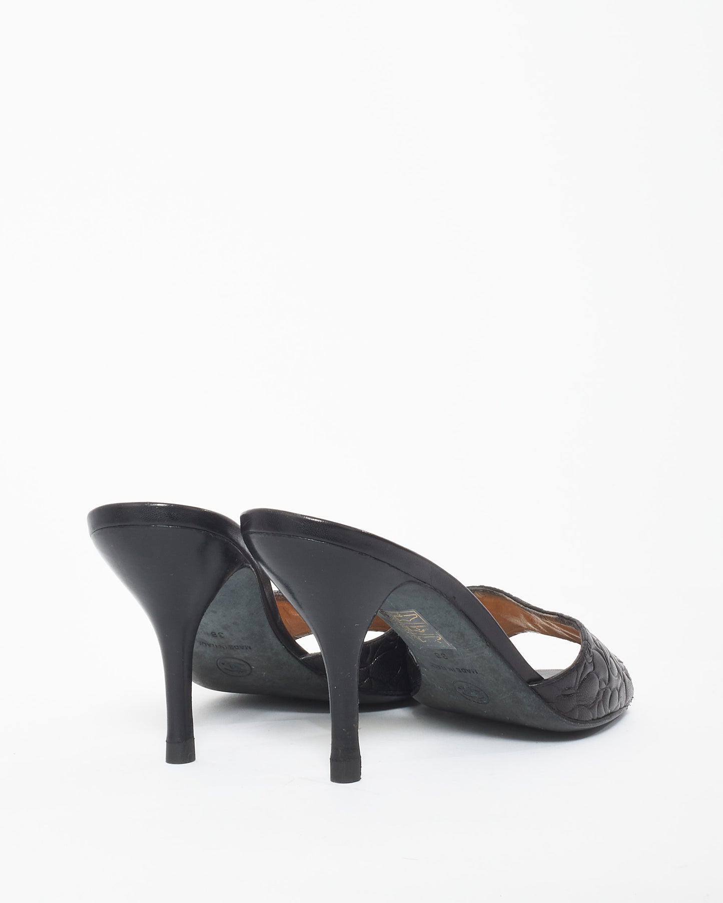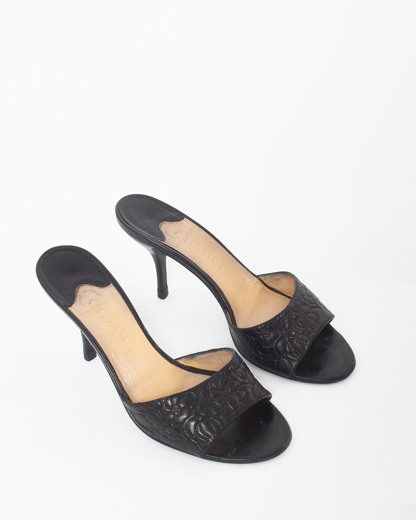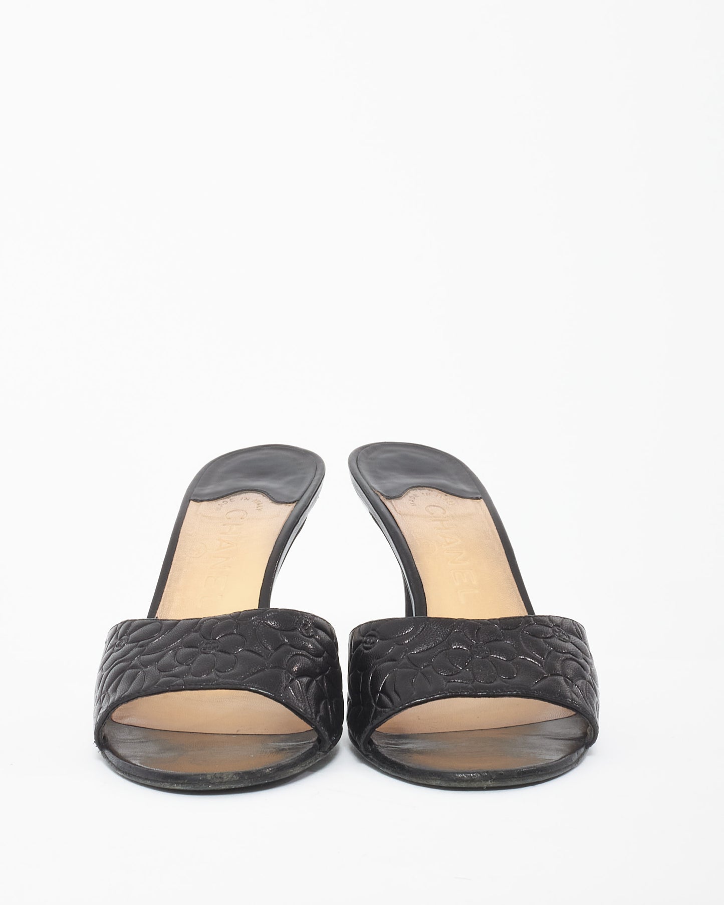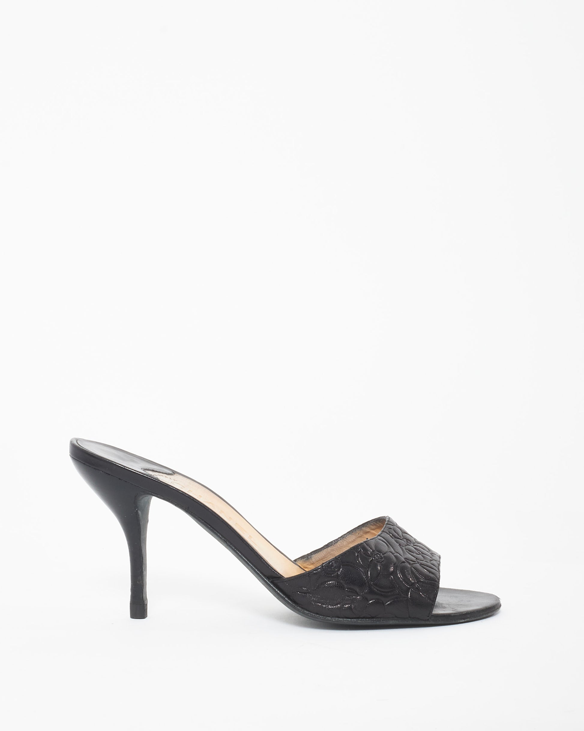 Vintage Black Leather Camelia Mule Heel Sandals - 38