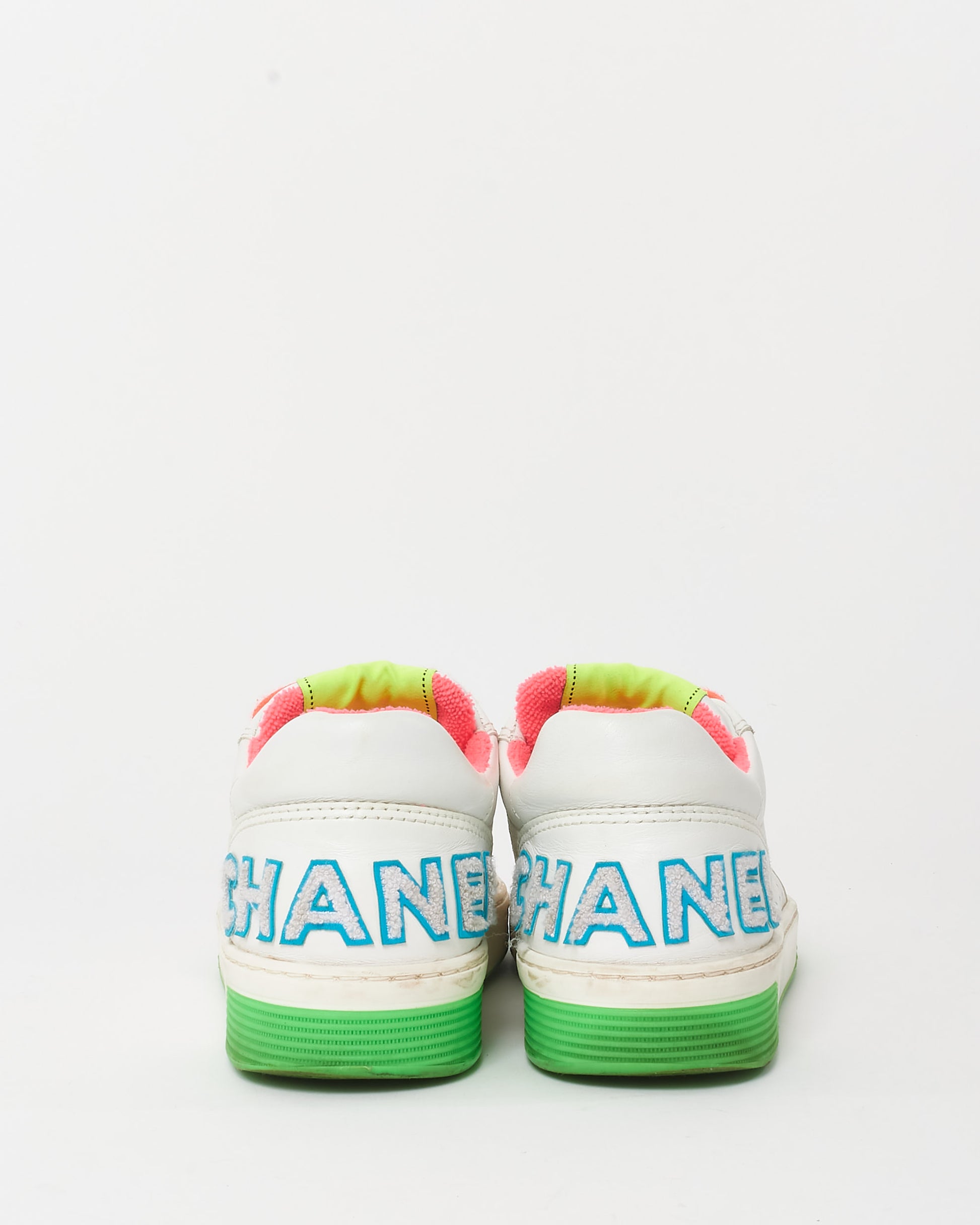 Sporty meets luxury with the pre-owned authentic Chanel White and Multi Leather Logo Low-Top Sneakers, a stylish fusion of comfort and couture. Crafted from premium white leather, these sneakers feature playful multicolor accents and the signature Chanel logo detailing, adding a fresh and modern touch.