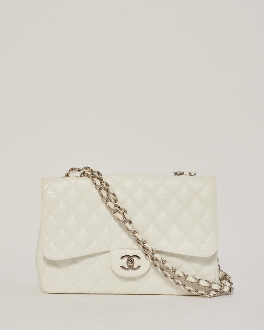 White Caviar Leather Jumbo Classic Single Flap Bag