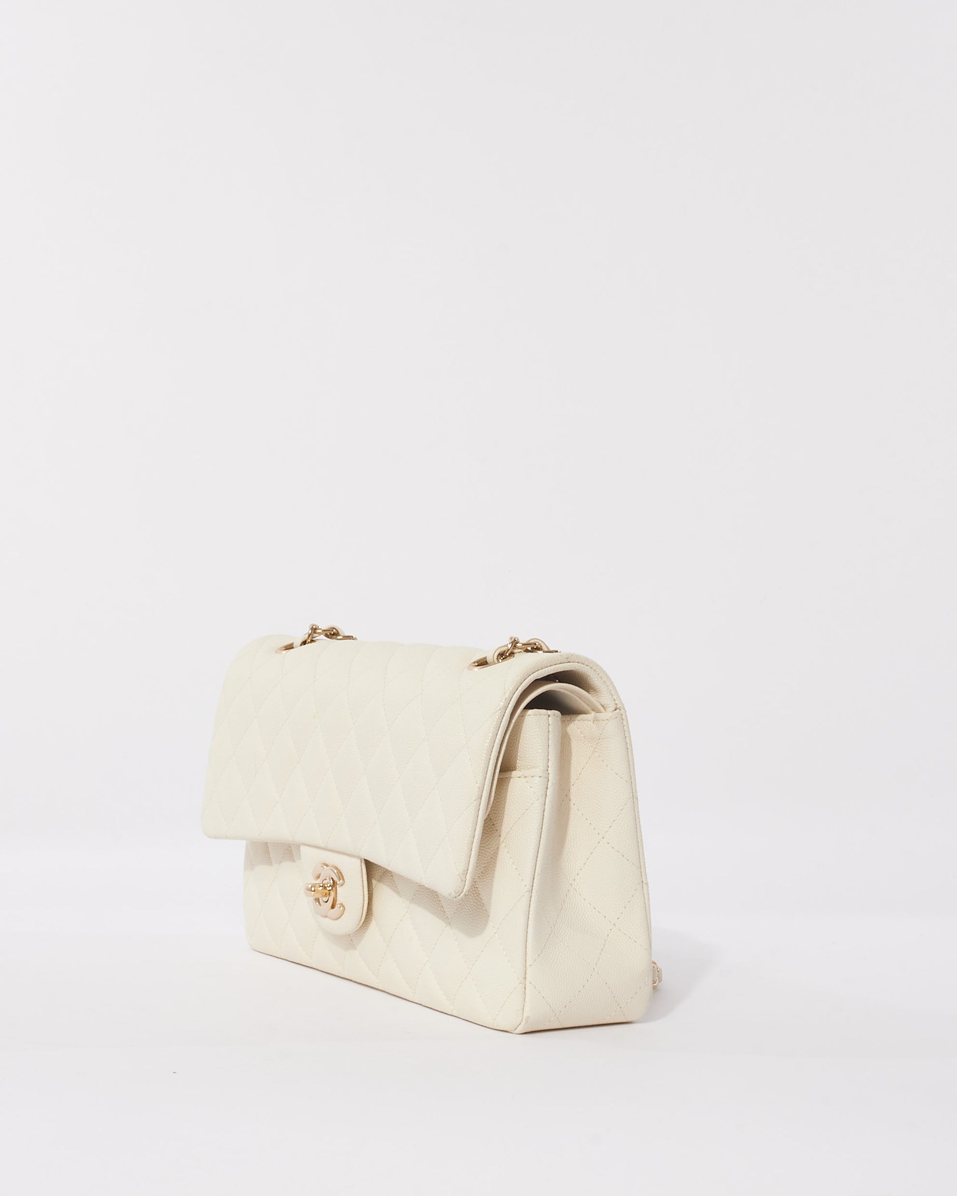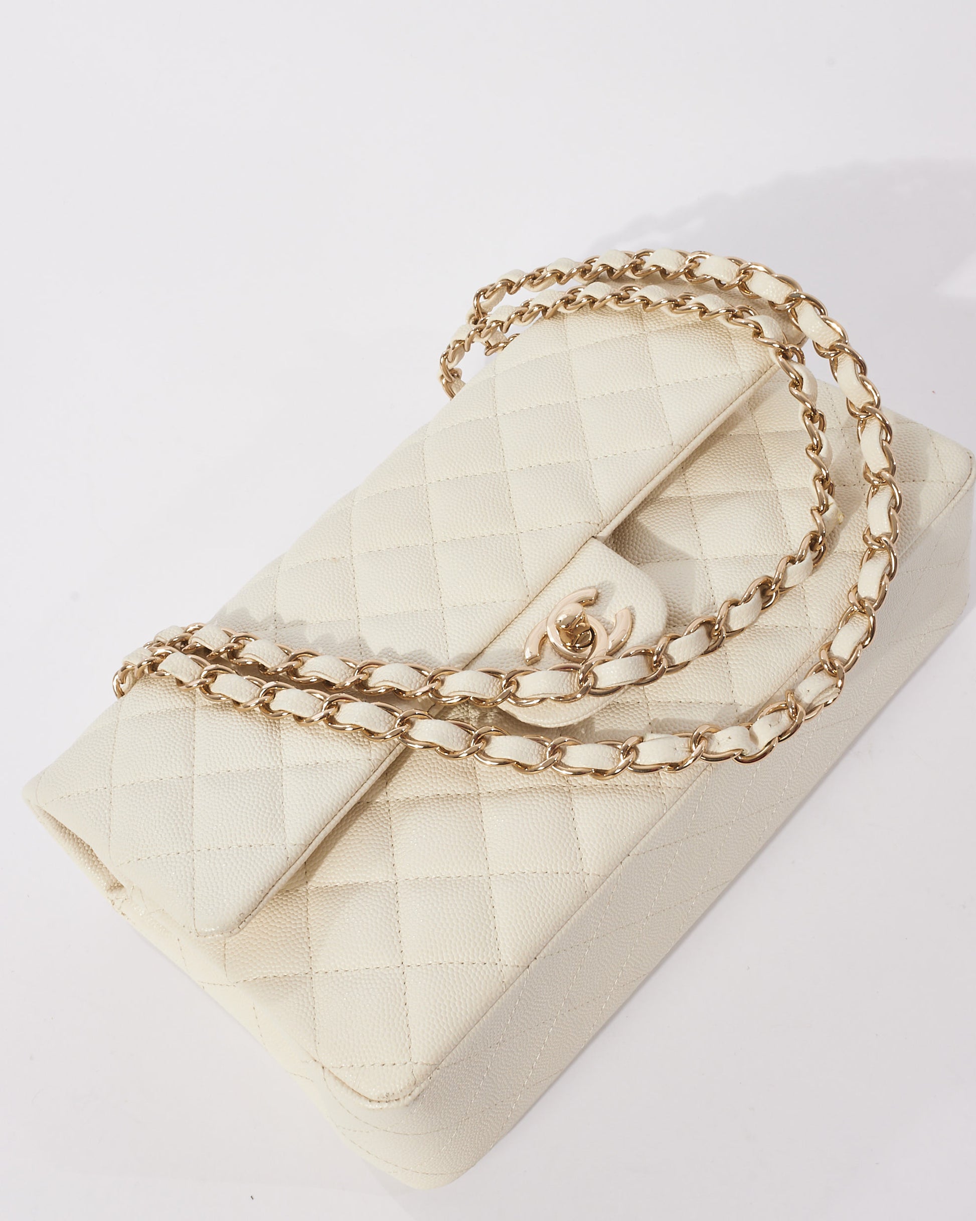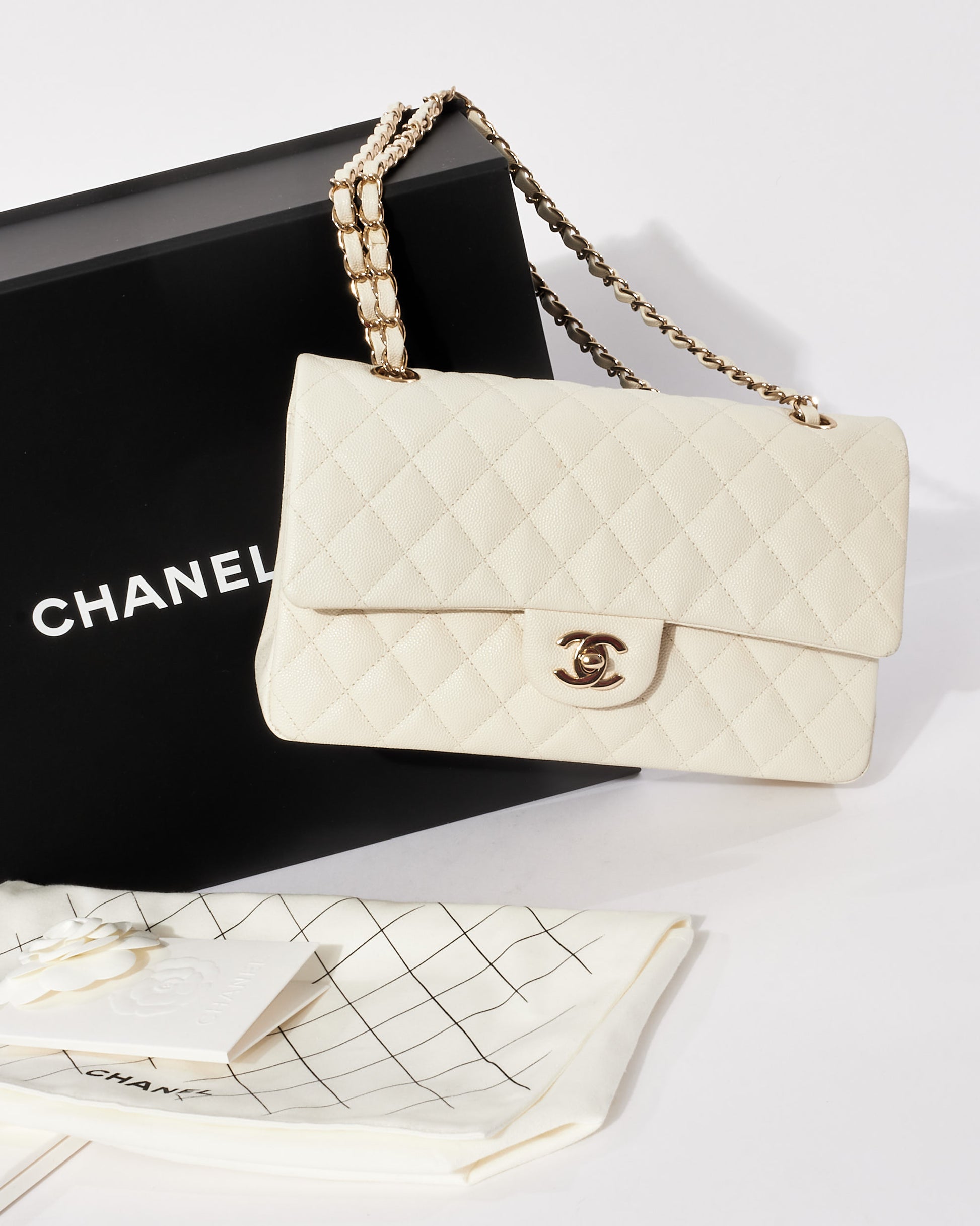 Explore Chanel's exquisite collection of handbags, featuring this certified pre-owned White Caviar Leather Medium CPHW 2021 Double Flap Bag. Embodying timeless elegance and modern sustainability, each piece, including favorites like this, is authenticated by Retyche. Discover sustainable luxury — shop our current treasures or find inspiration for your next coveted find.
