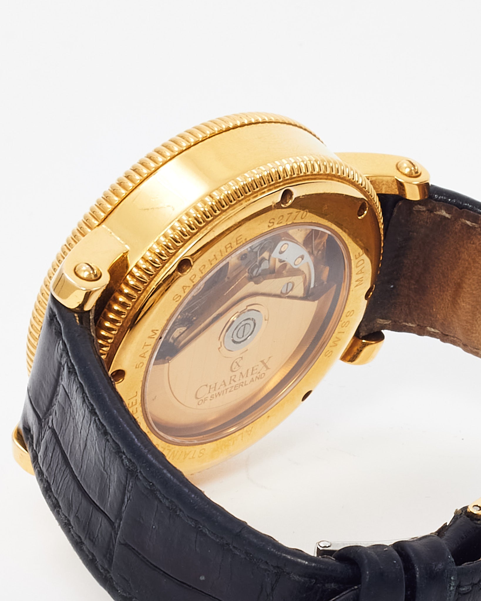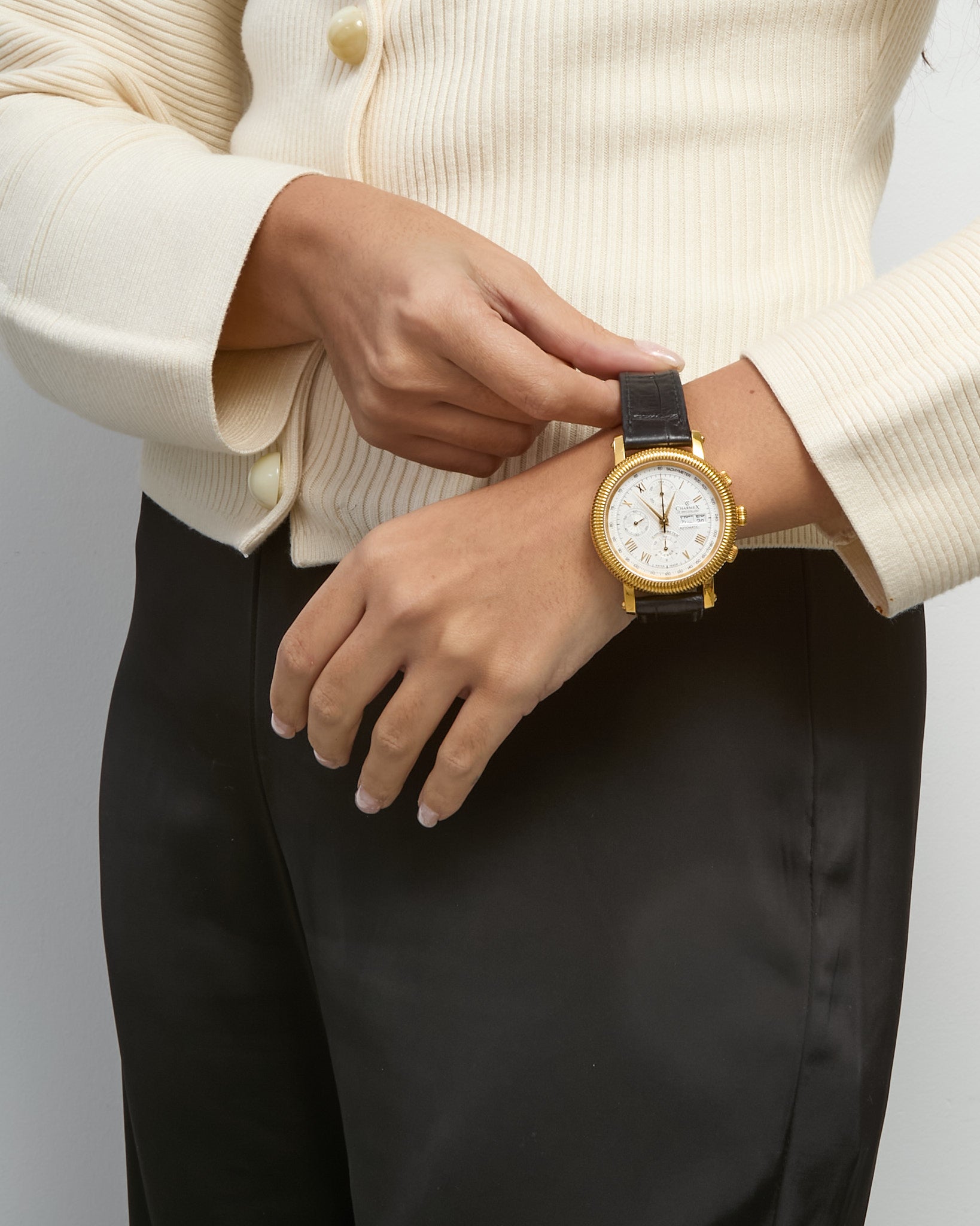 Make a refined statement with this pre-loved authentic Charmex of Switzerland President Chronometer Chronograph Watch. Featuring a gold-tone bezel and classic black leather strap, this sophisticated timepiece blends precision Swiss engineering with timeless design. The detailed chronograph dial and date function offer both style and functionality, making it an ideal choice for business wear or formal occasions. A distinguished addition to any watch collection.