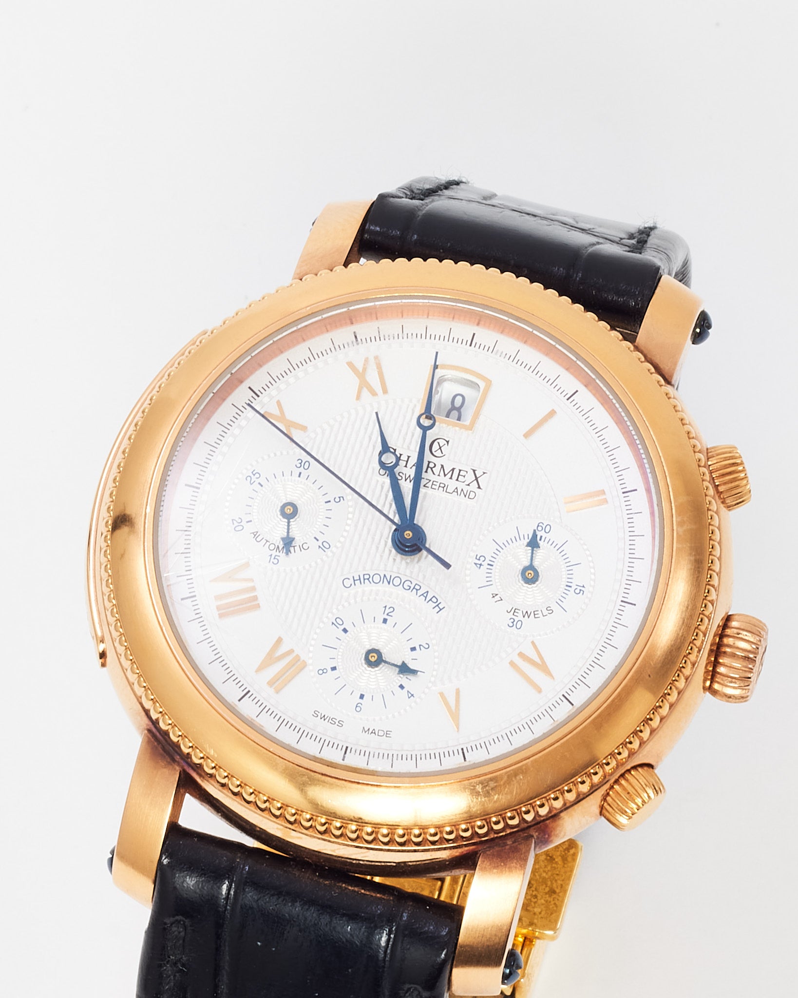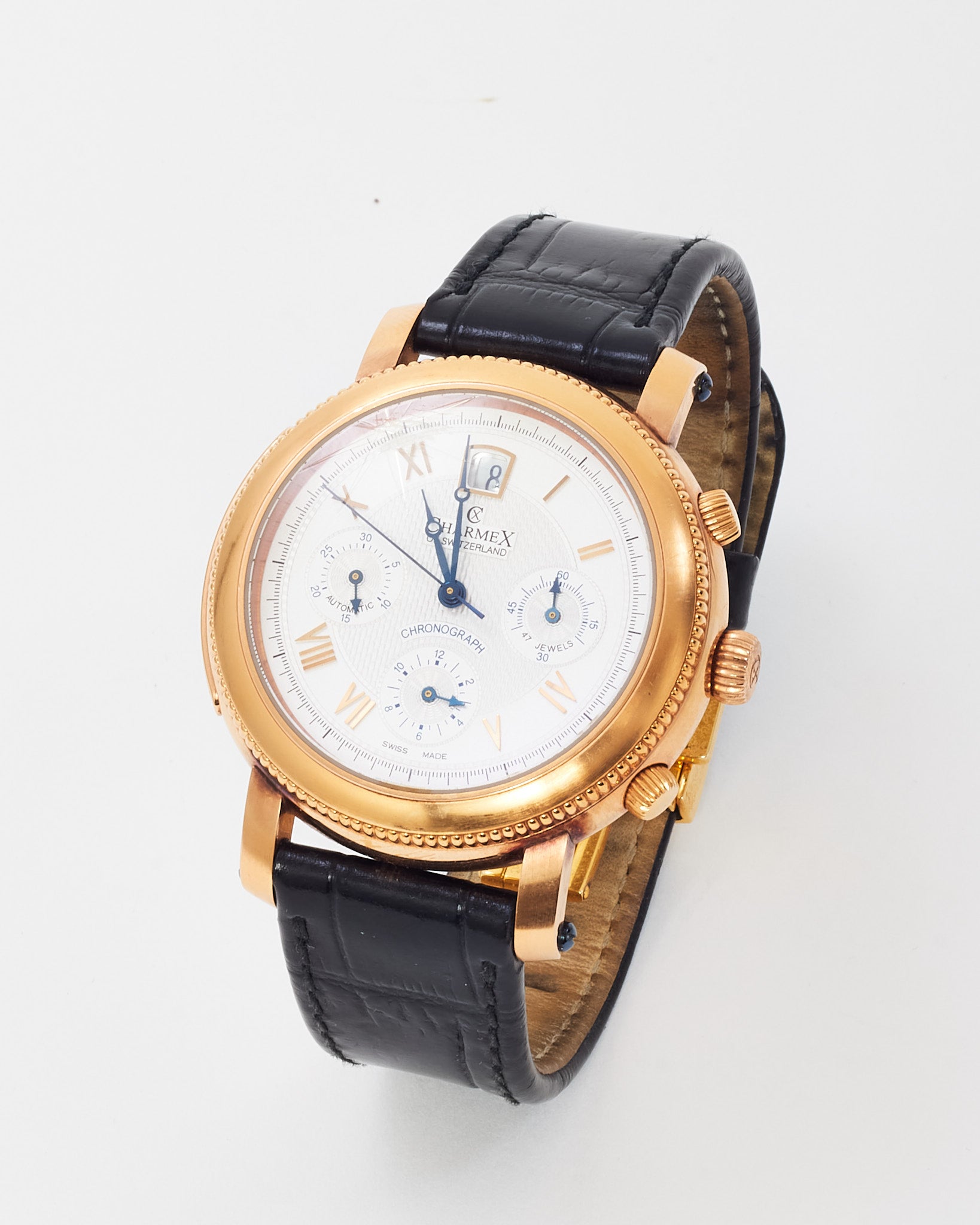 Celebrate heritage and craftsmanship with this pre-loved authentic Charmex of Switzerland Jubil 1926–2006 Chronograph Watch in a bold 43mm case. Featuring a rose gold-tone stainless steel bezel and textured black croc-embossed leather strap, this limited edition timepiece honors Swiss watchmaking tradition. The multi-function chronograph dial offers refined detail and precision, while the classic silhouette adds timeless elegance. A standout addition for collectors and connoisseurs alike.