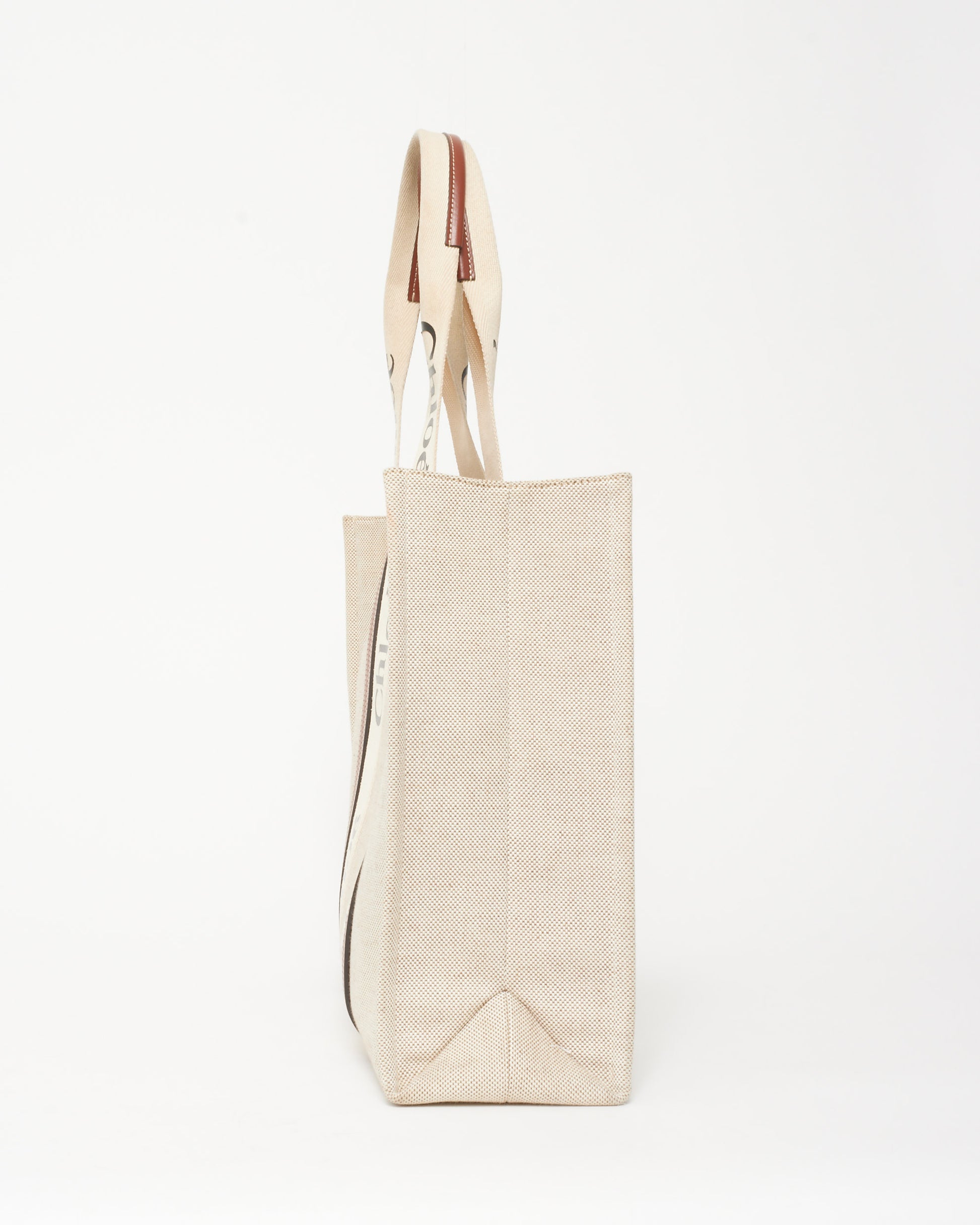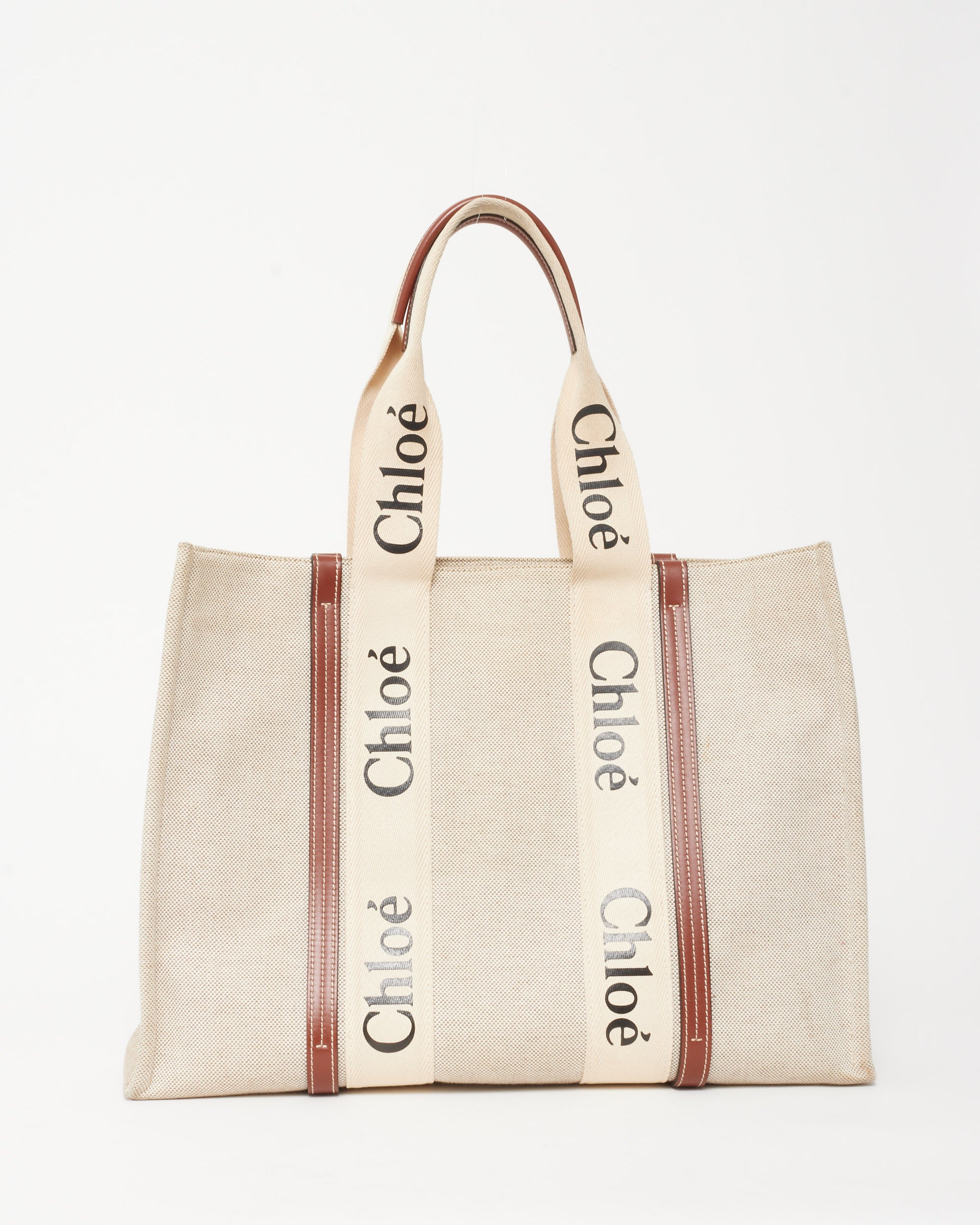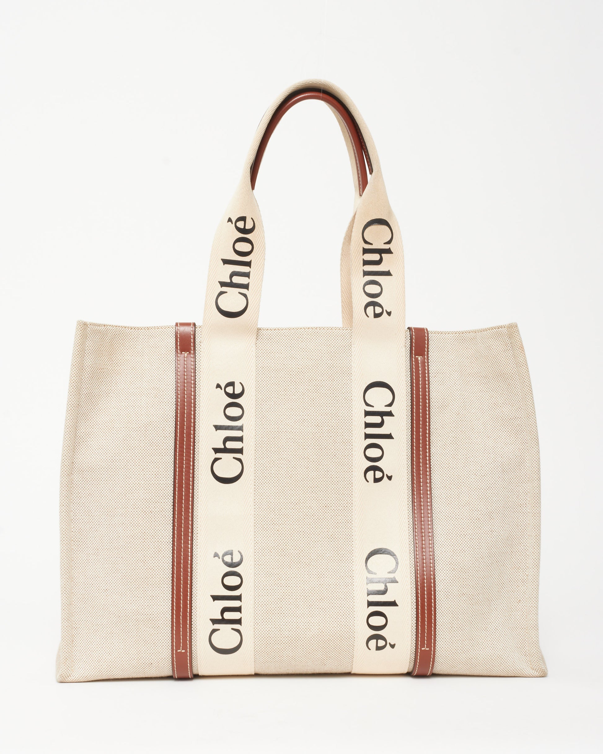 Beige Canvas & Brown Leather Trim Large Woody Tote Bag