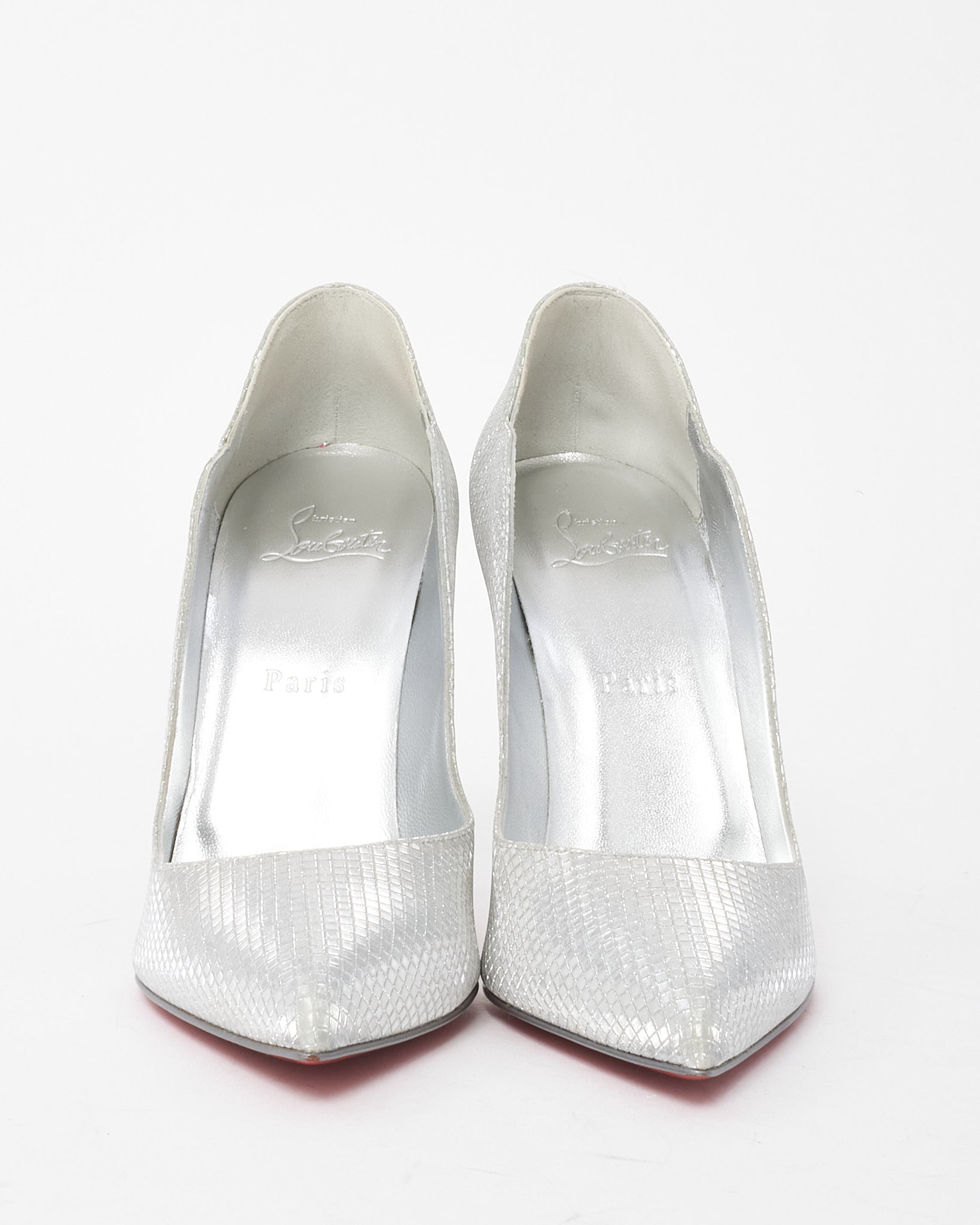 Step into the spotlight with these pre-loved authentic Christian Louboutin Hot Chick pumps, a captivating expression of the brand’s signature allure. Crafted in silver glitter, the iconic scalloped edges and dramatic curved silhouette exude femininity and confidence. Set on a 100mm stiletto heel, this statement pair elongates the legs and adds irresistible sparkle to any evening ensemble. Finished with the iconic red lacquered sole, these pumps are made to turn heads at every glamorous occasion.