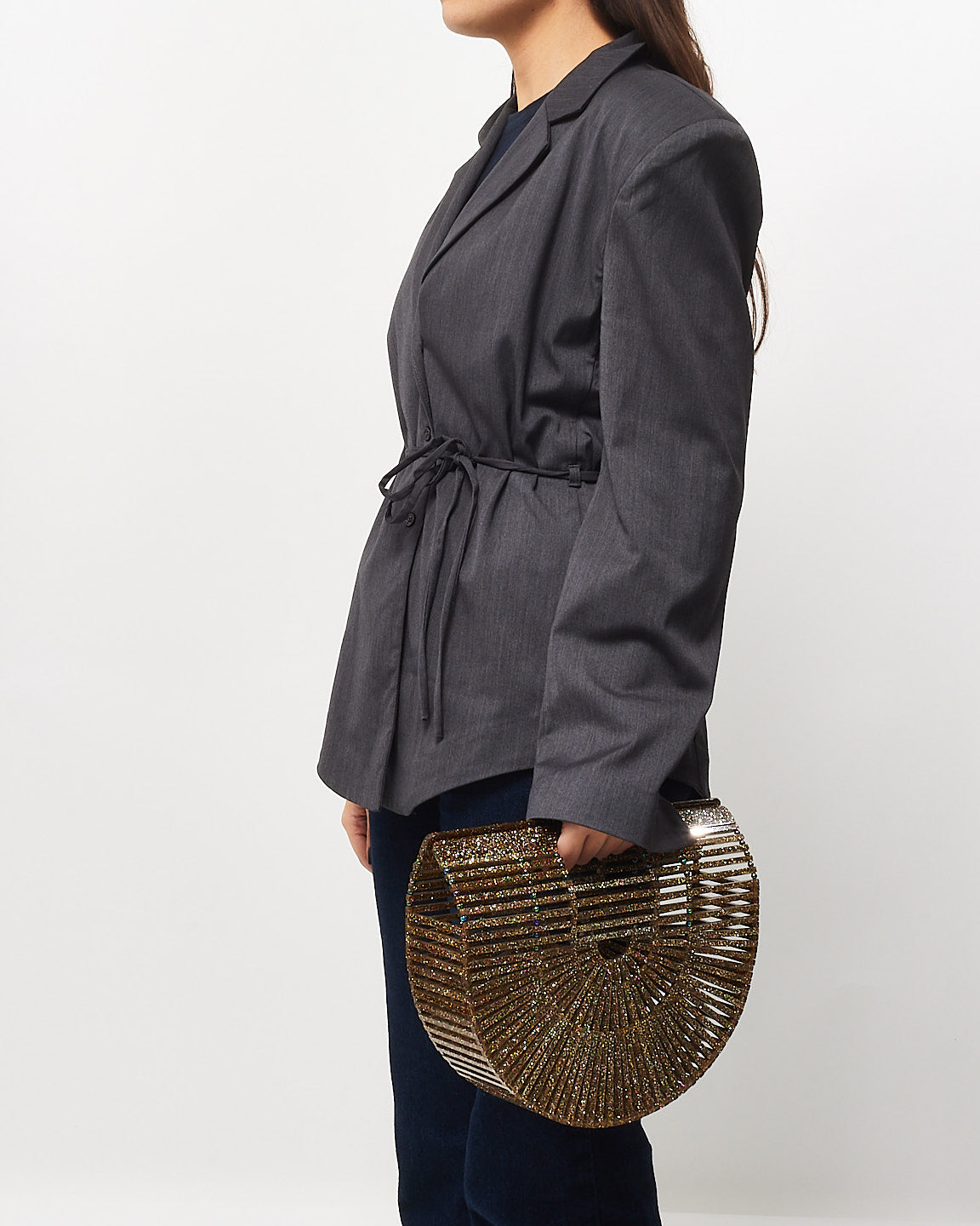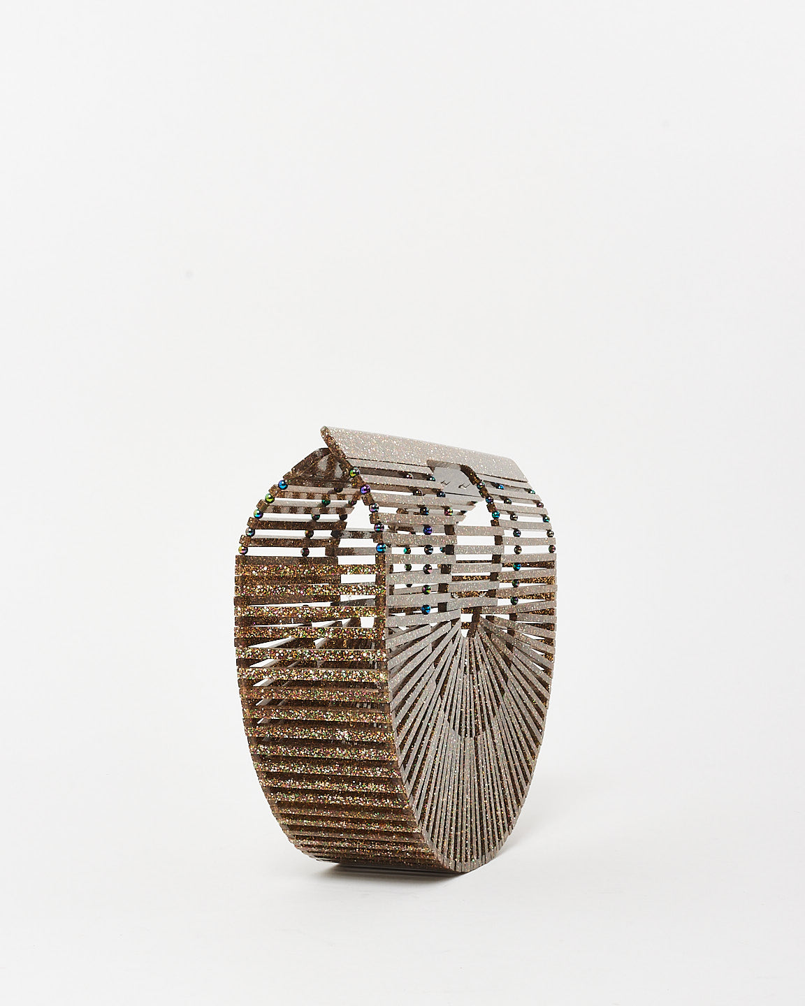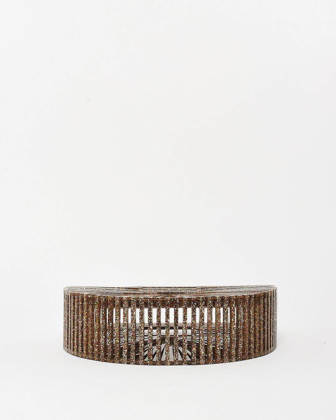 Make a dazzling statement with the authentic pre-owned Cult Gaia Multicolor Sparkle Acrylic Top Handle Bag. This eye-catching accessory features a vibrant multicolor design with a shimmering sparkle finish, crafted from sturdy yet lightweight acrylic. Its architectural silhouette and sculptural top handle make it a true piece of wearable art.