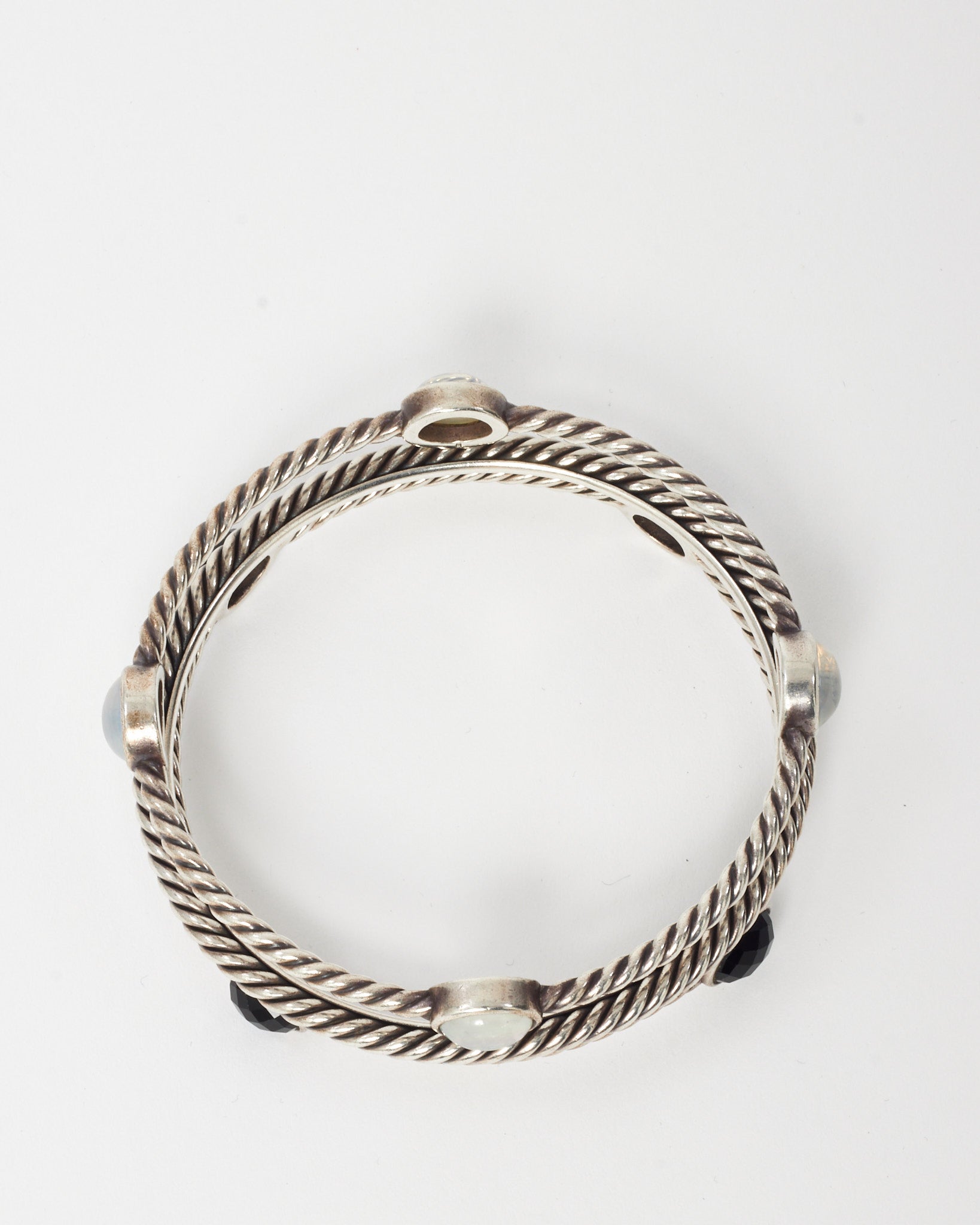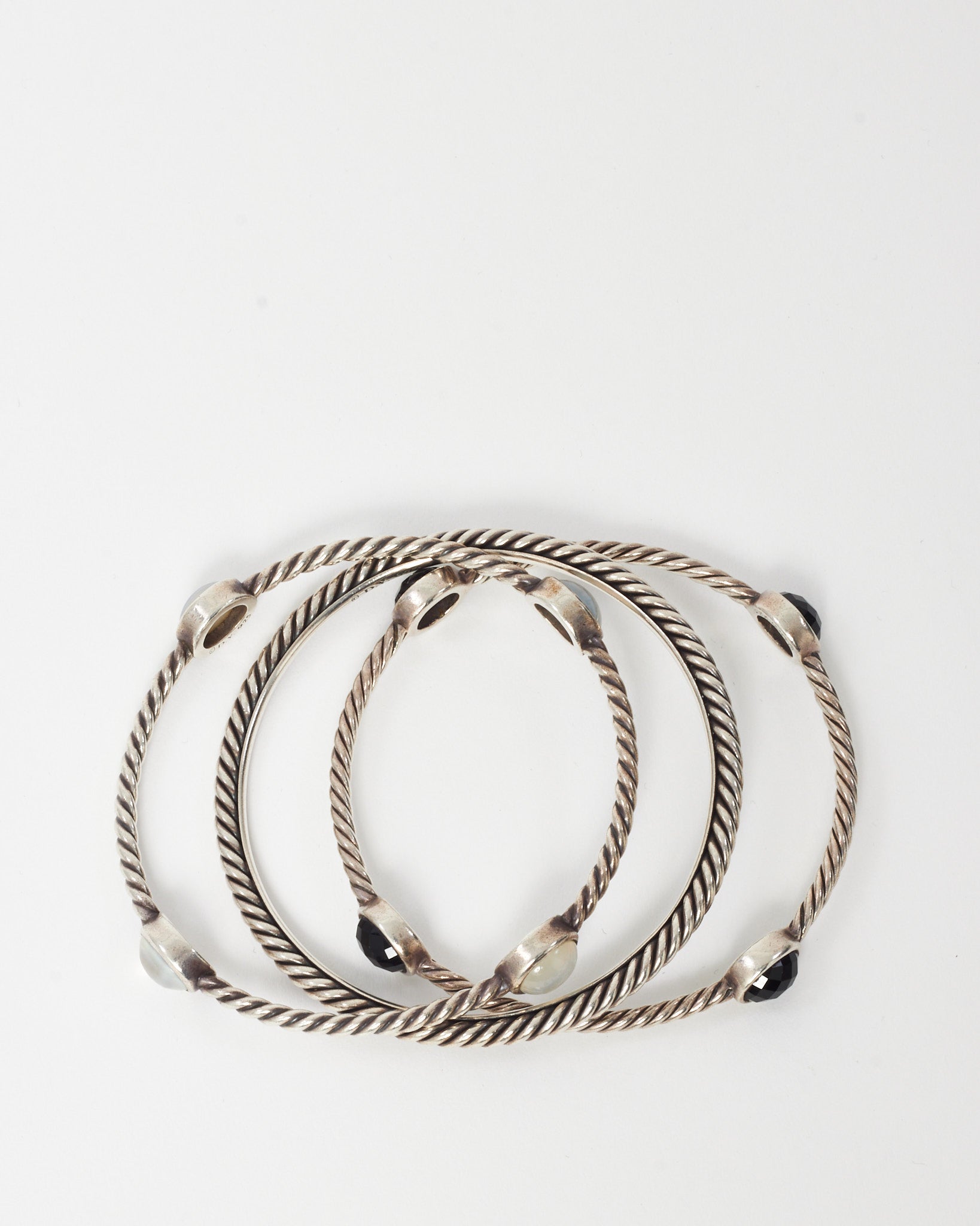 Elegant and timeless, these pre-loved authentic David Yurman Sterling Silver Black Onyx and Mother-of-Pearl 4 Oval Station Cable Bangle Bracelets showcase the brand’s signature twisted cable design in polished sterling silver. Each bracelet features alternating oval stations of luminous mother-of-pearl and faceted black onyx, creating a striking contrast of light and dark. Perfect for stacking or wearing solo, these bangles add a refined touch of sophistication and modern glamour to any jewelry collection.