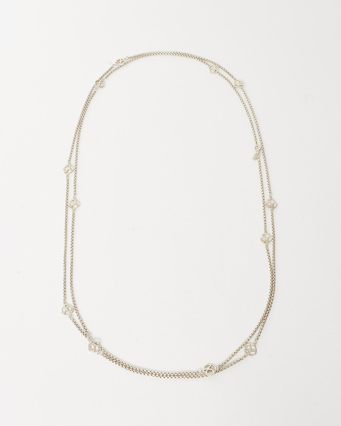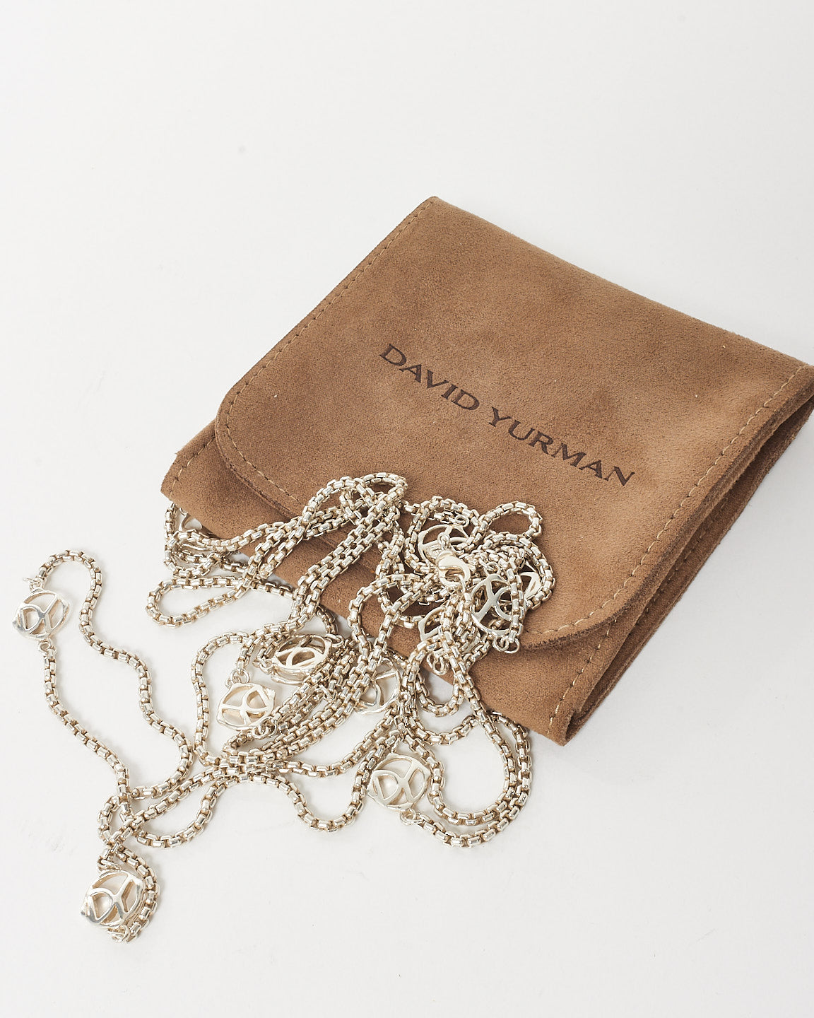 Timeless elegance meets iconic design in this pre-owned authentic David Yurman Sterling Silver DY Logo Station Double Wrap Necklace. Measuring an impressive 72 inches, this versatile piece is crafted in gleaming sterling silver and accented with signature DY logo stations throughout.