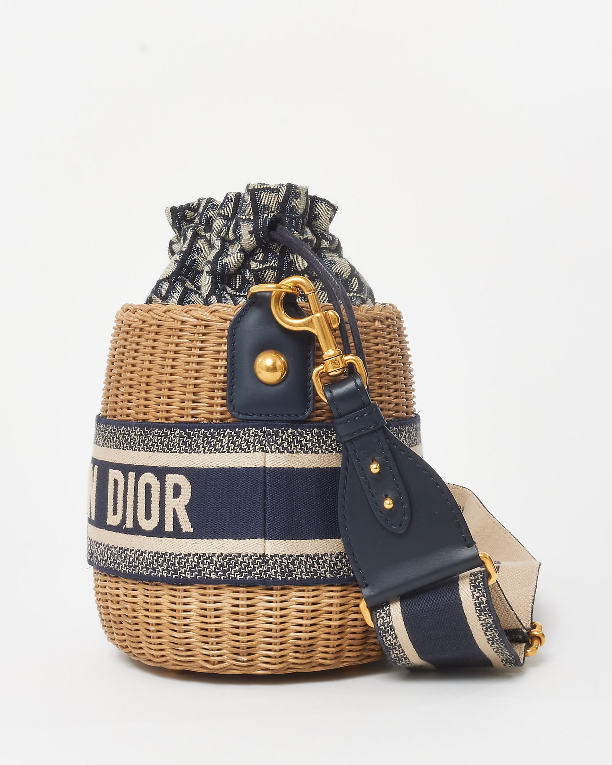 A perfect fusion of heritage design and artisanal craftsmanship, the pre-owned authentic Dior Navy Oblique Logo Canvas Drawstring Wicker Bucket Bag is a standout accessory that exudes effortless elegance. Crafted from Dior’s iconic navy Oblique monogram canvas, this bag is beautifully contrasted with a woven wicker base, adding a touch of rustic charm to its structured silhouette.