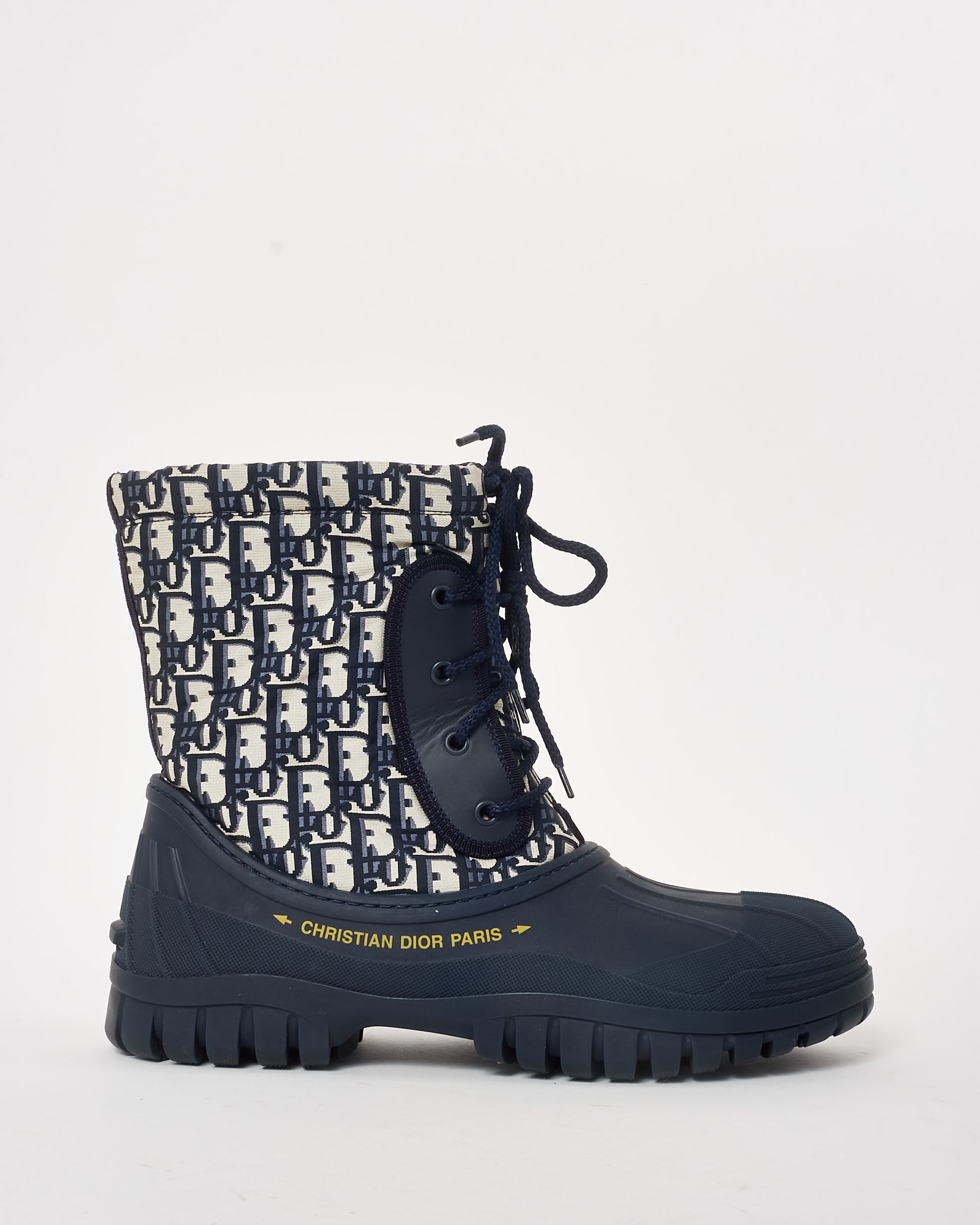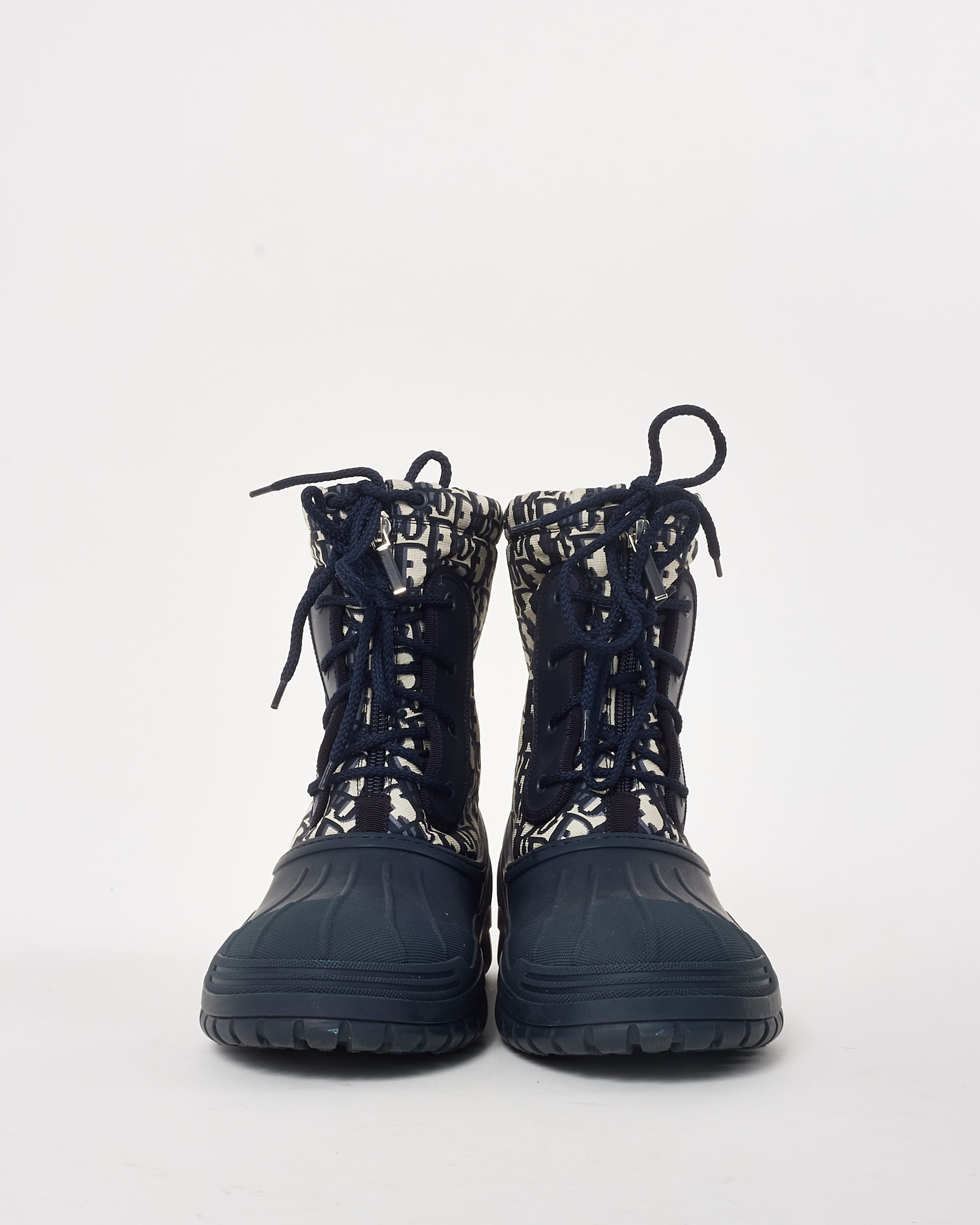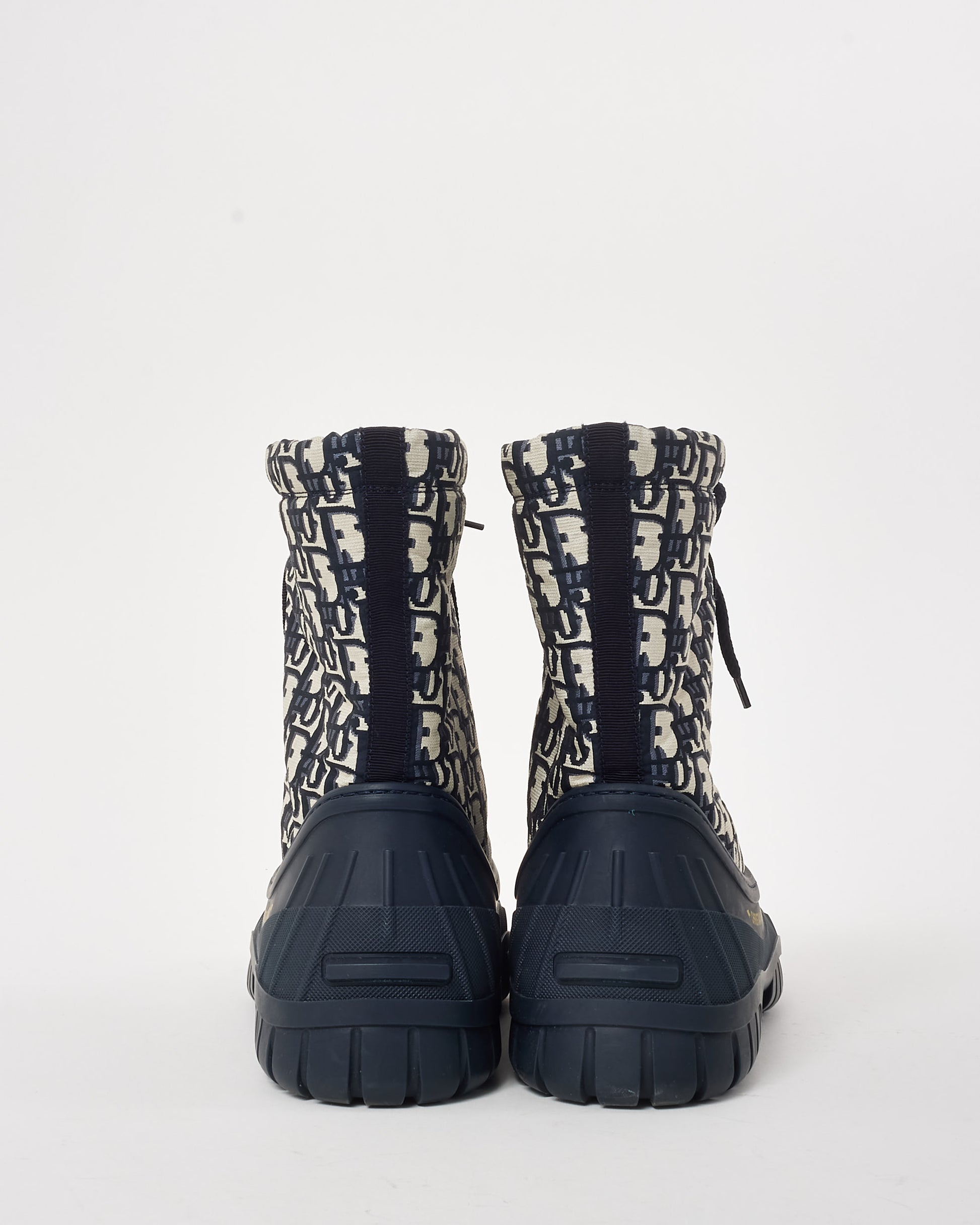 Step into elevated style with these authentic pre-owned Dior Navy Oblique Nylon and Rubber D-Venture Boots, a striking blend of contemporary design and durable craftsmanship. Featuring the iconic Dior Oblique motif printed on navy nylon, these boots make a bold statement while maintaining functionality for everyday wear. The contrasting rubber sole ensures both grip and comfort, while the high-top silhouette and lace-up fastening provide a secure and stylish fit. The design is further enhanced by subtle branding, including the Dior logo on the sole and heel tab, adding a signature touch to these modern boots.