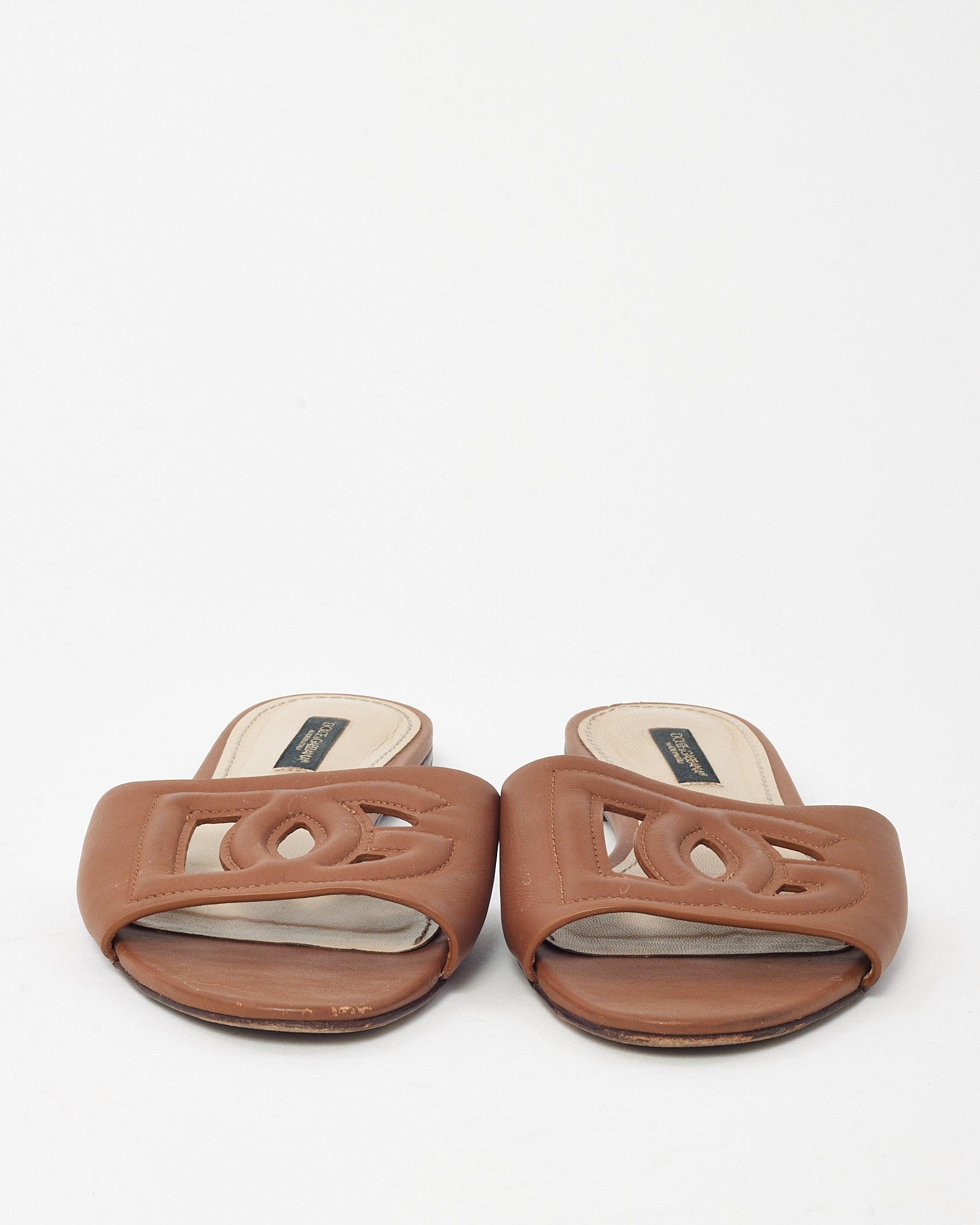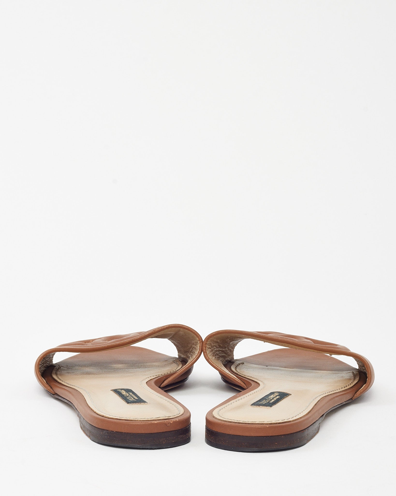Slip into effortless designer style with these pre-loved authentic Dolce & Gabbana DG Millennials slides in size 36. Crafted from smooth brown leather, these sandals feature a bold raised DG logo across the strap for an unmistakable brand signature. The contoured footbed and durable sole ensure all-day comfort, making them a stylish go-to for casual days or warm-weather getaways.