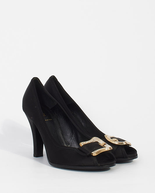 Black Satin with Rhinestone Buckle Peep Toe Pumps - 39