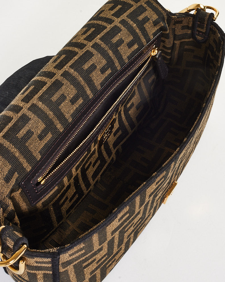 A modern take on a legendary silhouette, this pre-loved authentic Fendi Baguette Bag is crafted in rich brown FF Zucca jacquard fabric with black leather trim and polished gold-tone hardware. The flap-front design features the iconic FF buckle closure and a detachable leather handle, allowing for hand or shoulder carry.
