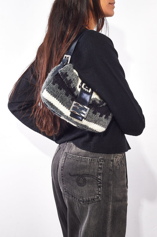Grey Wool Knit Small Mamma Baguette Shoulder Bag