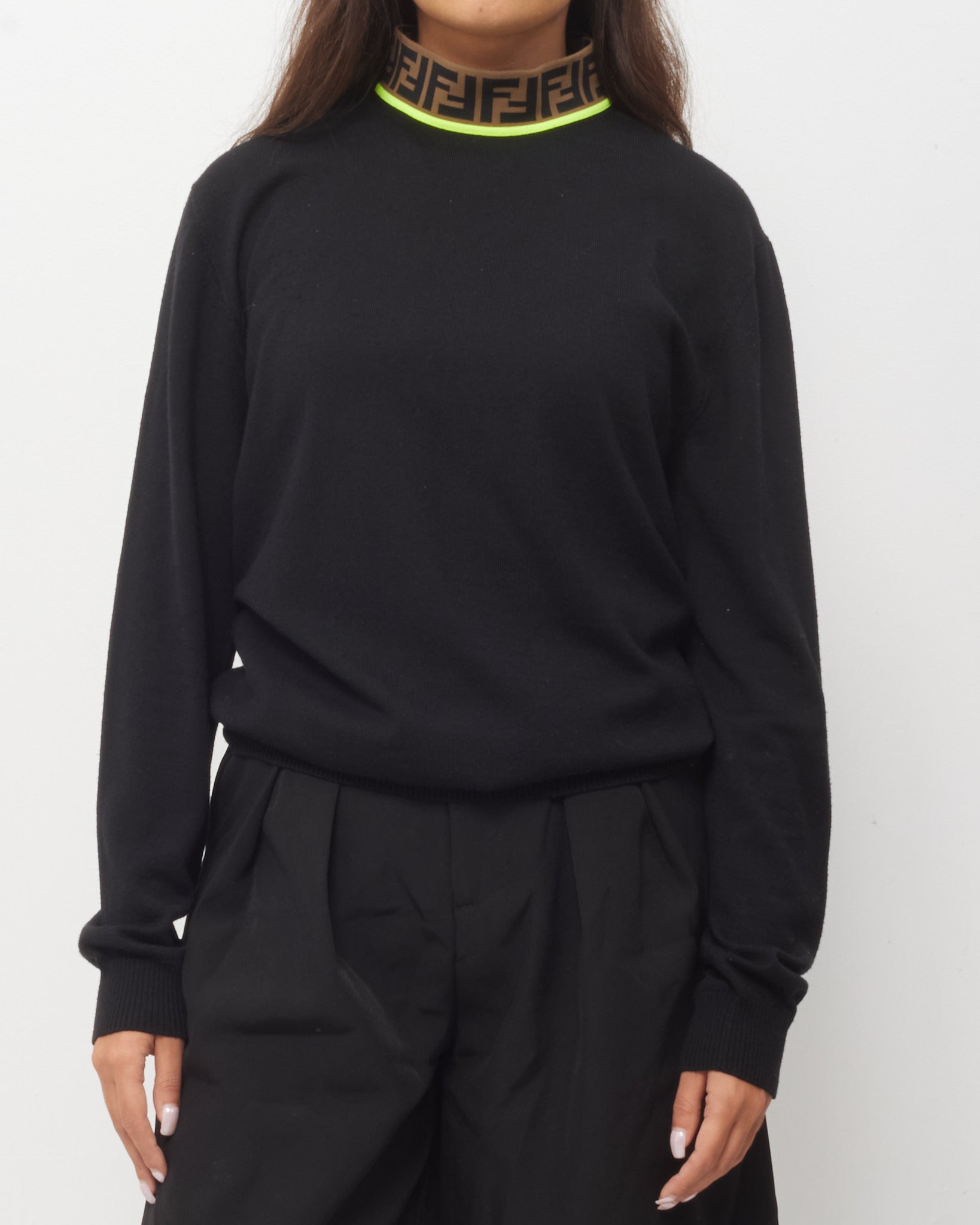 Modern and refined, this pre-owned authentic Fendi Mockneck Sweater is crafted from soft black wool and subtly detailed with the house’s iconic Zucca print at the collar. The streamlined silhouette and ribbed trim offer a polished fit, making it a versatile staple for cooler seasons.