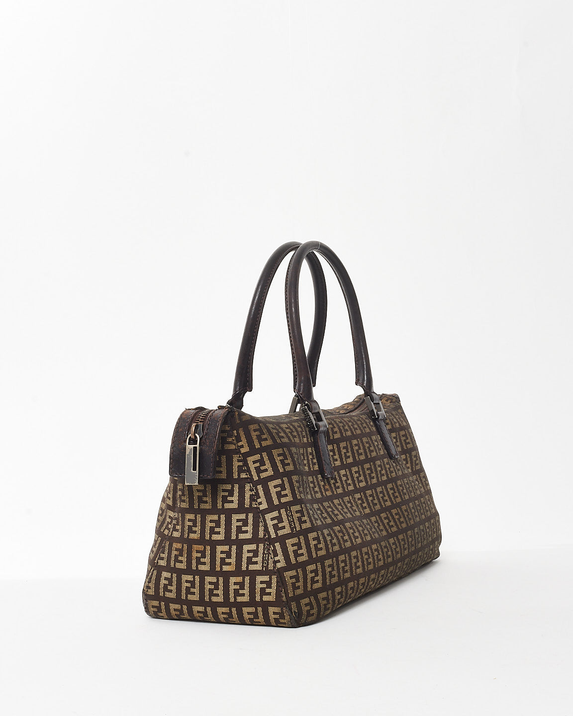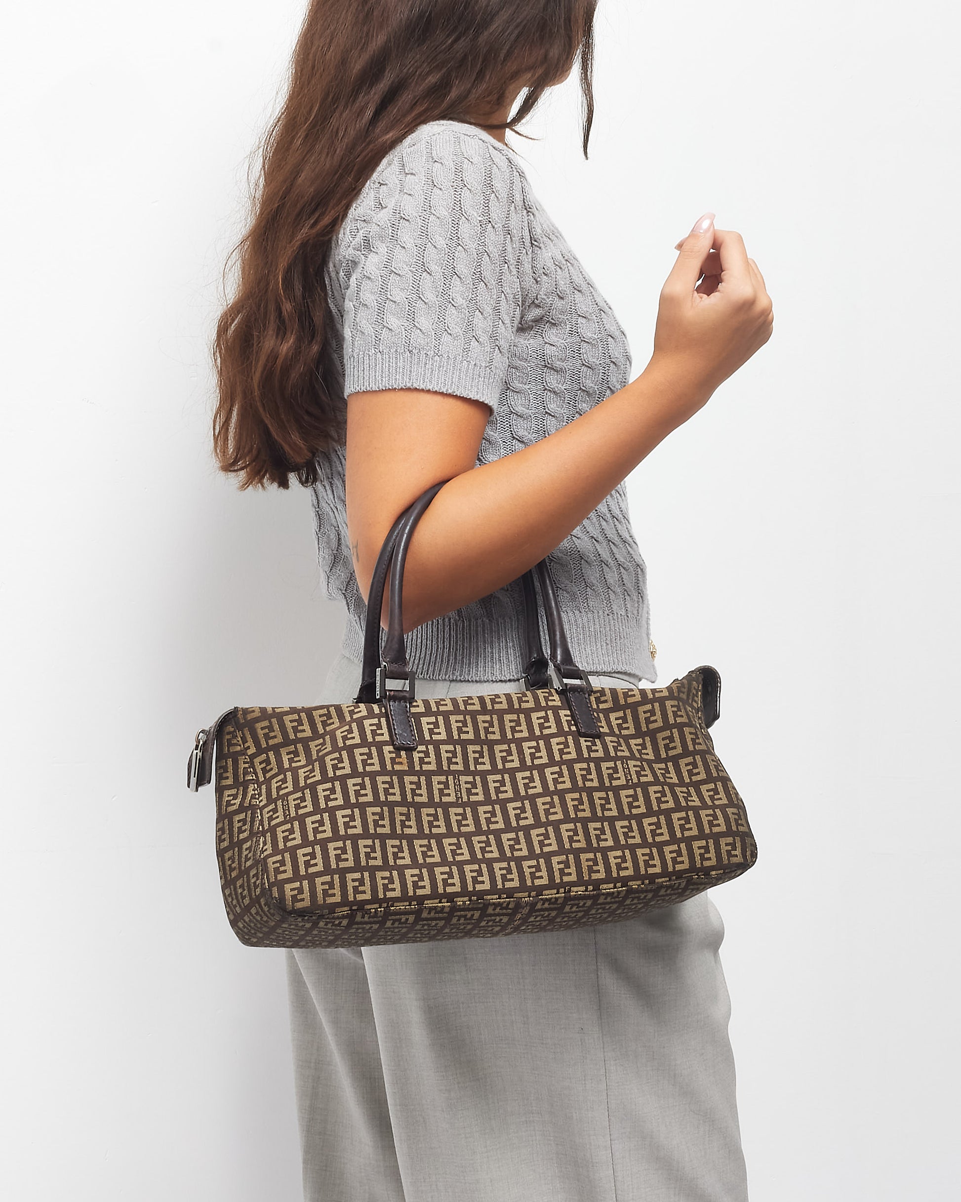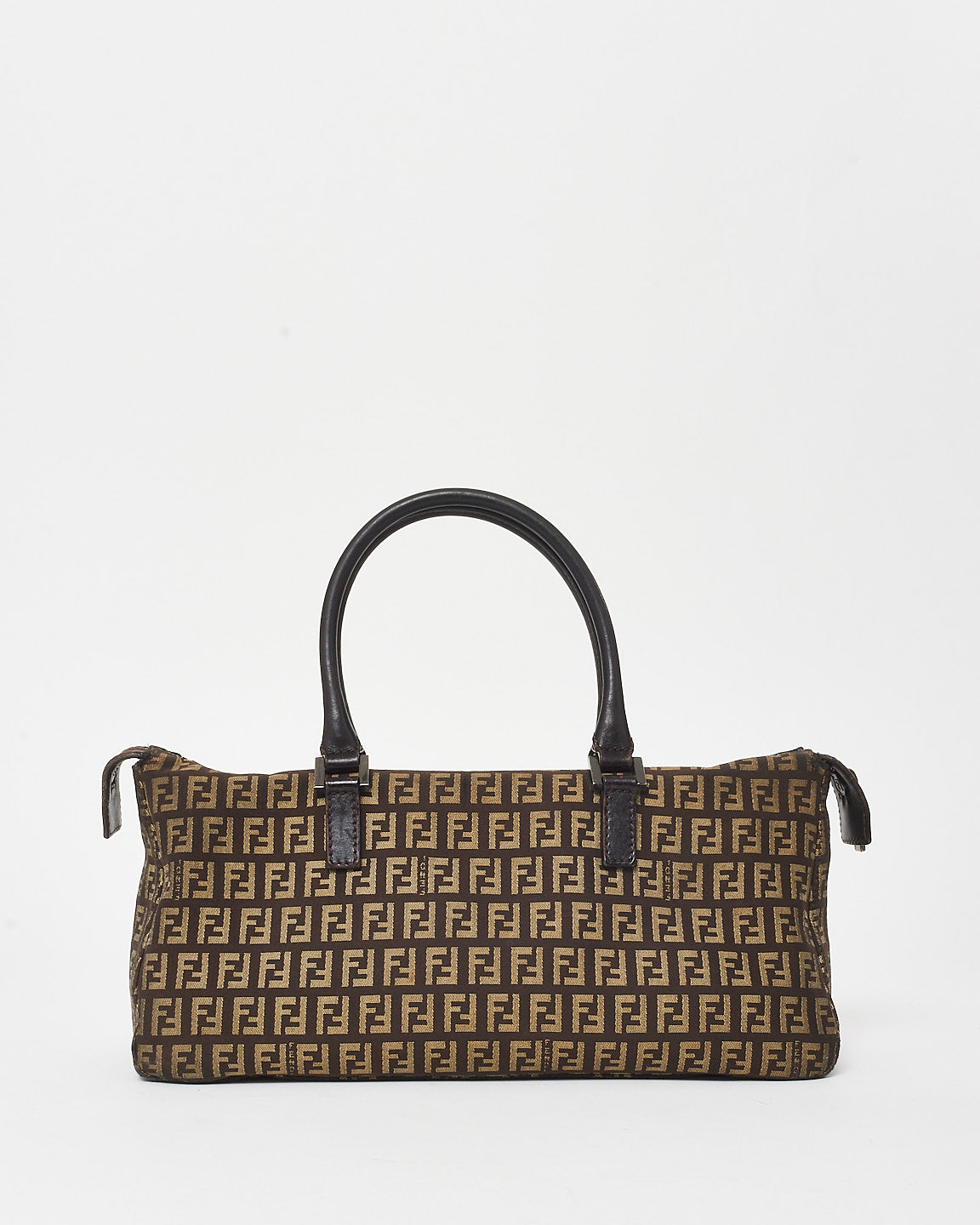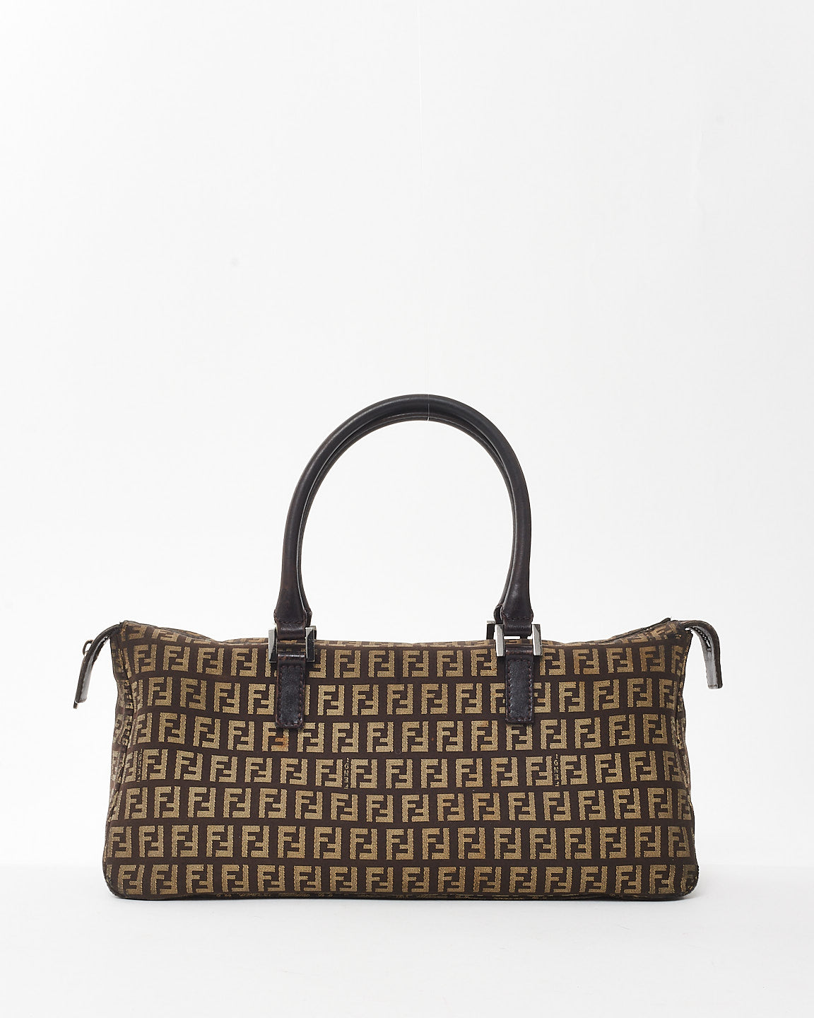 Embrace vintage luxury with the 100% authentic Fendi Vintage Brown & Brown Zucchino Print Small E/W Top Handle Bag. This chic bag features Fendi’s iconic Zucchino print in rich brown tones. The small east-west silhouette is perfect for everyday use, while the top handle adds a touch of elegance and versatility. Ideal for fashion lovers who appreciate classic design, this Fendi bag is a statement piece that complements any outfit. Shop authentic pre-owned Fendi accessories at Retyche and elevate your collection with this timeless vintage treasure.