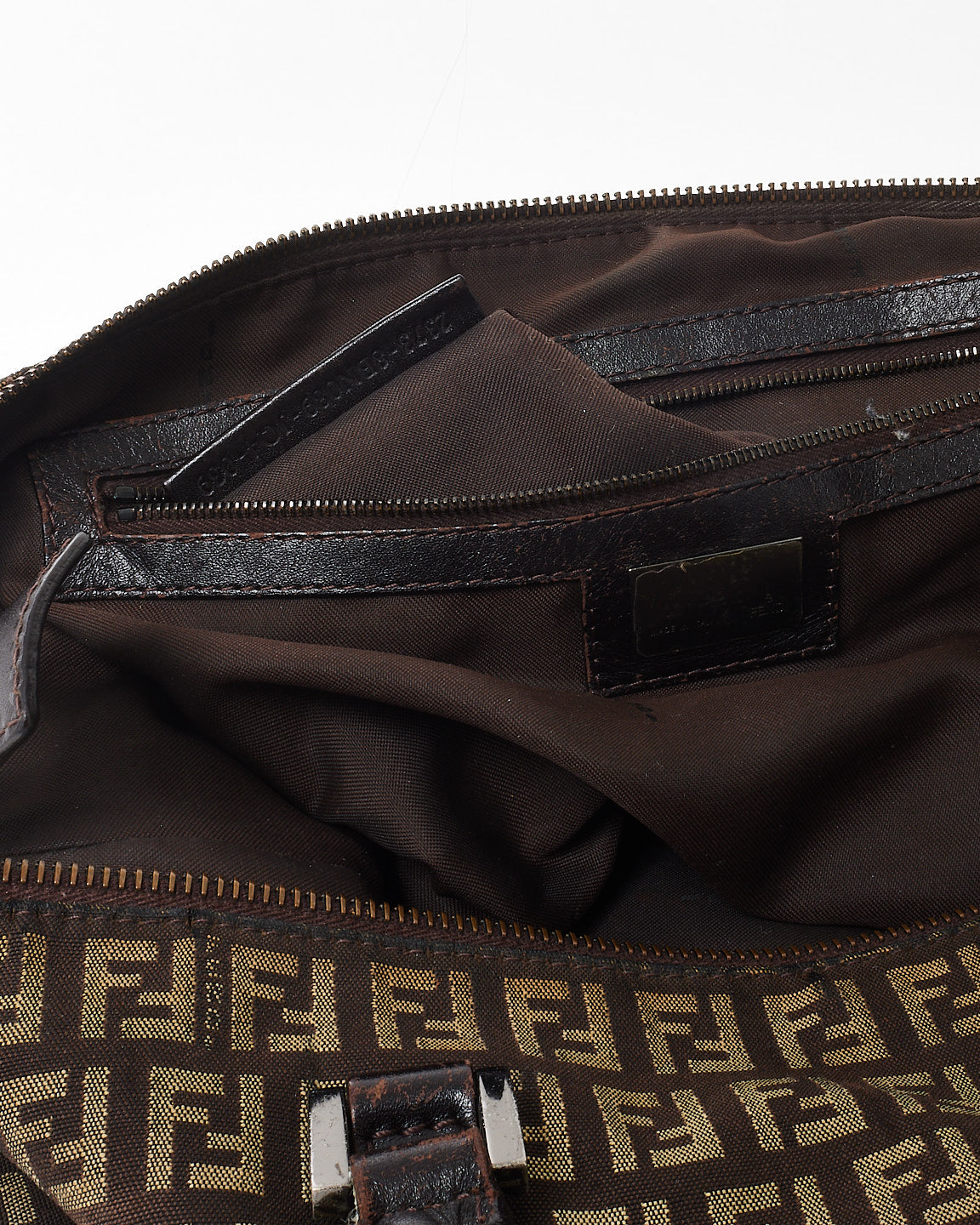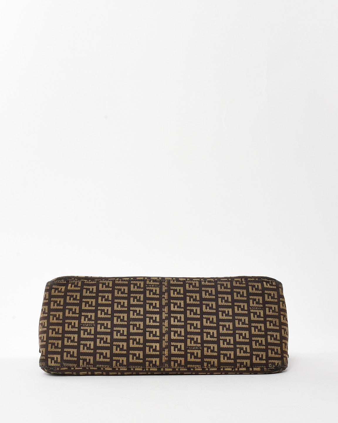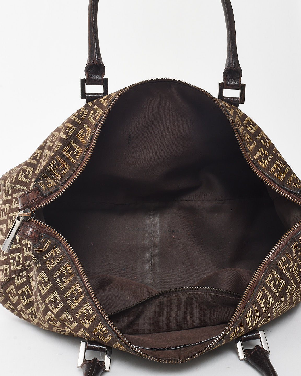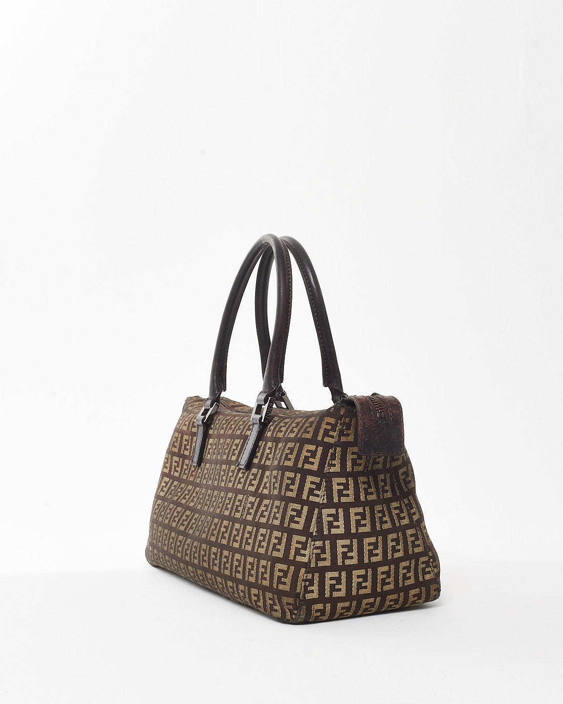 Embrace vintage luxury with the 100% authentic Fendi Vintage Brown & Brown Zucchino Print Small E/W Top Handle Bag. This chic bag features Fendi’s iconic Zucchino print in rich brown tones. The small east-west silhouette is perfect for everyday use, while the top handle adds a touch of elegance and versatility. Ideal for fashion lovers who appreciate classic design, this Fendi bag is a statement piece that complements any outfit. Shop authentic pre-owned Fendi accessories at Retyche and elevate your collection with this timeless vintage treasure.
