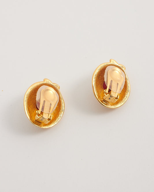 Vintage Gold Logo / Red Glass Cabochon Stone Clip On Earrings