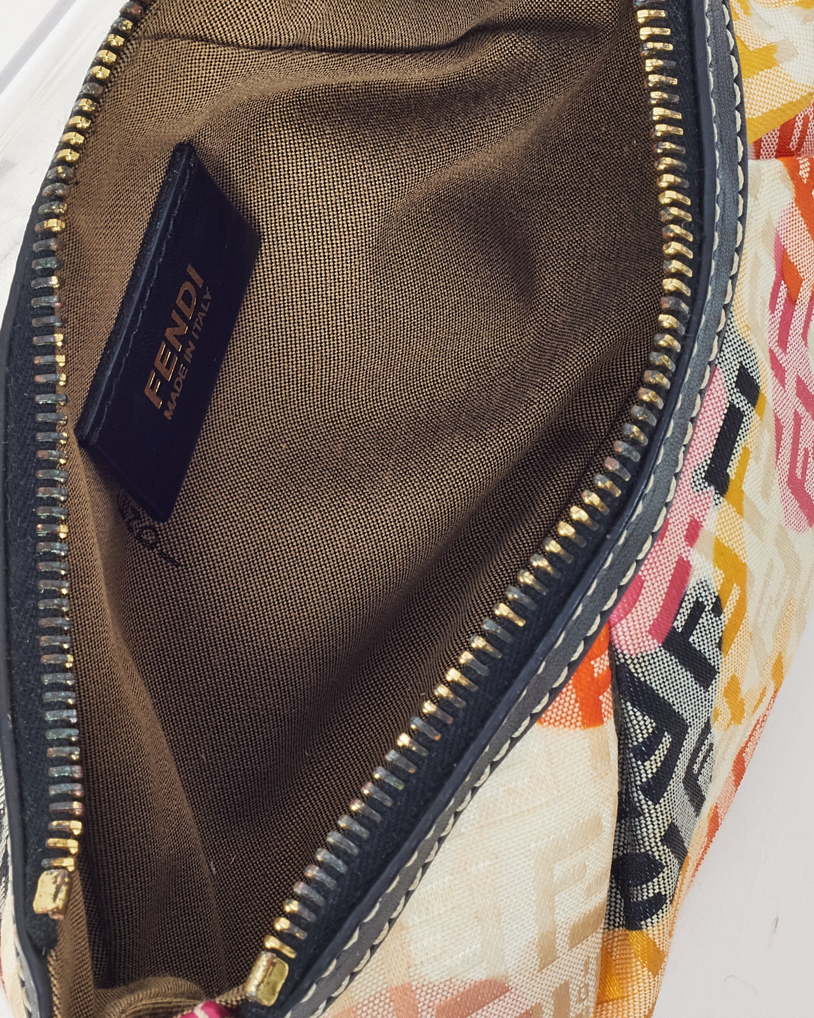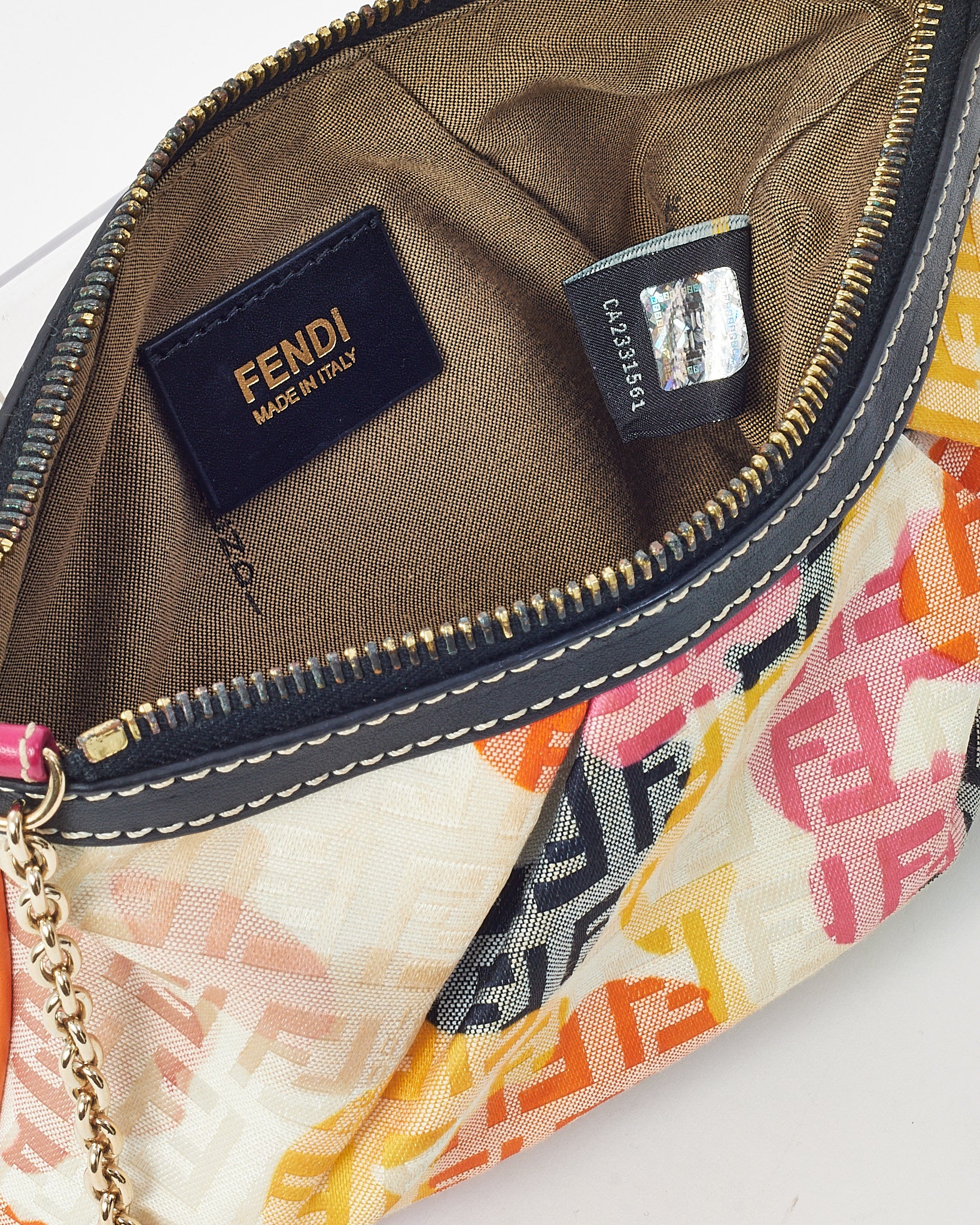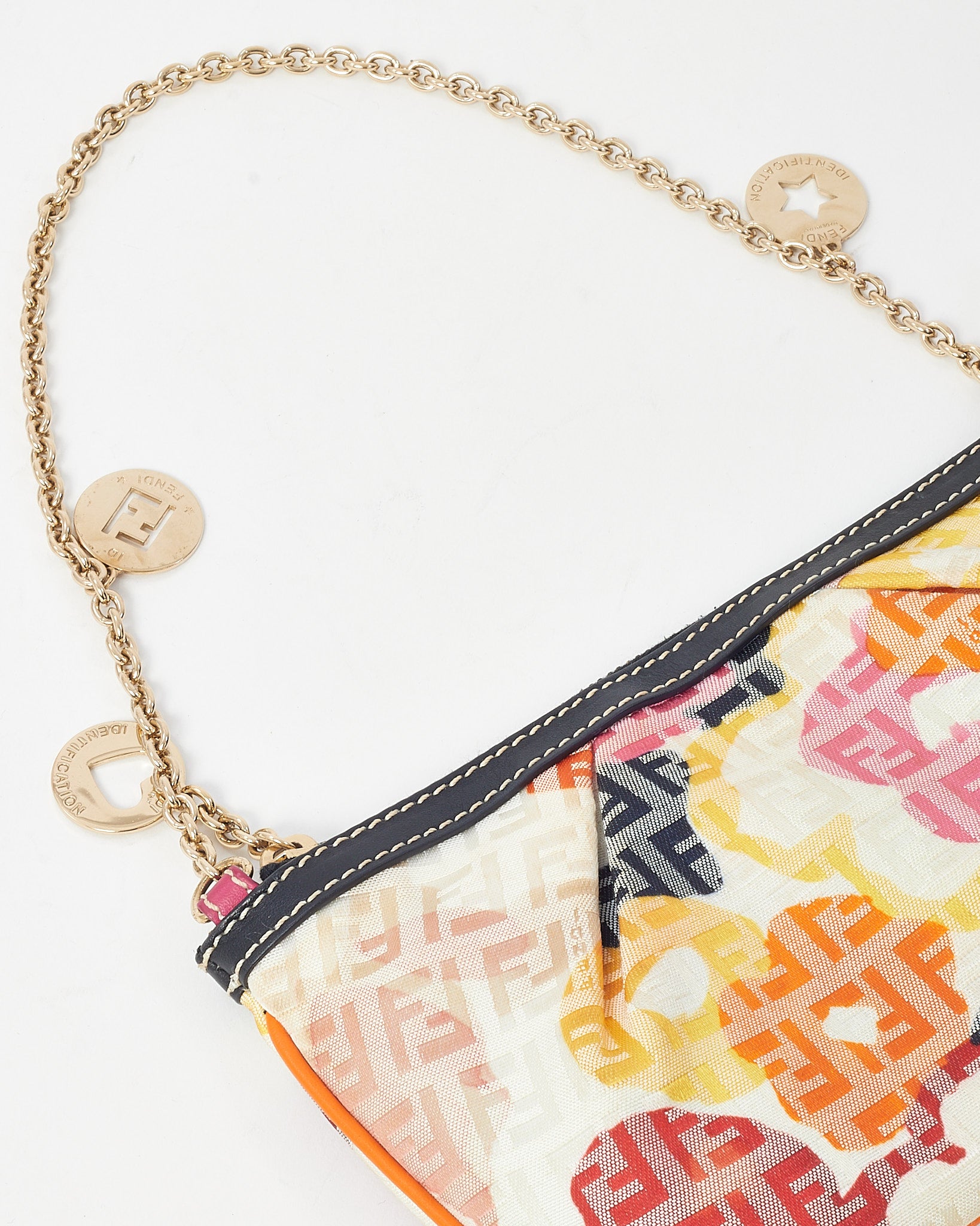 Brighten up your wardrobe with this pre-loved authentic Fendi Flower Chain Pochette, crafted in white and multicolor FF Zucchino canvas. This playful yet elegant mini bag showcases the iconic monogram in a vibrant palette, paired with a standout floral-accented chain strap. Finished with leather trim and gold-tone hardware, it offers just enough space for your daily must-haves. Perfect for adding a cheerful, designer touch to day or evening looks alike.